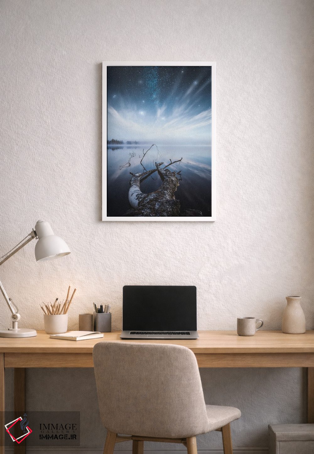 براساس پالت سرد اثر، قاب سفید مات (فریم باریک) پیشنهاد اول است و نقرهای برسخورده (متالیک) مکمل. برای سفارشهای پروژهای با ابعاد و قابهای اختصاصی با ایماژ در تماس باشید.
