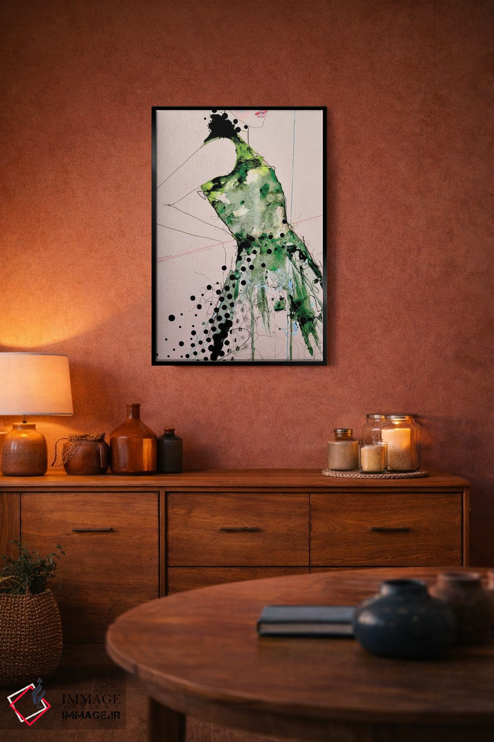 براساس پالت ترکیبی اثر، قاب تیک گرم (چوبی) پیشنهاد اول است و مشکی مات (فریم متوسط) مکمل. برای سفارشهای پروژهای با ابعاد و قابهای اختصاصی با ایماژ در تماس باشید.