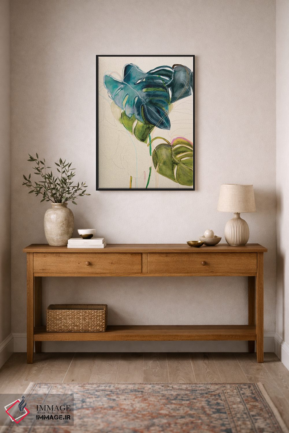 براساس پالت ترکیبی اثر، قاب بلوط روشن (چوبی) پیشنهاد اول است و استخوانی ملایم مکمل. برای سفارشهای پروژهای با ابعاد و قابهای اختصاصی با ایماژ در تماس باشید.