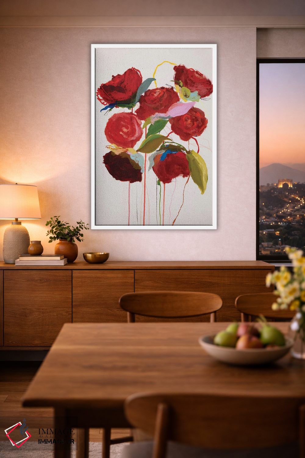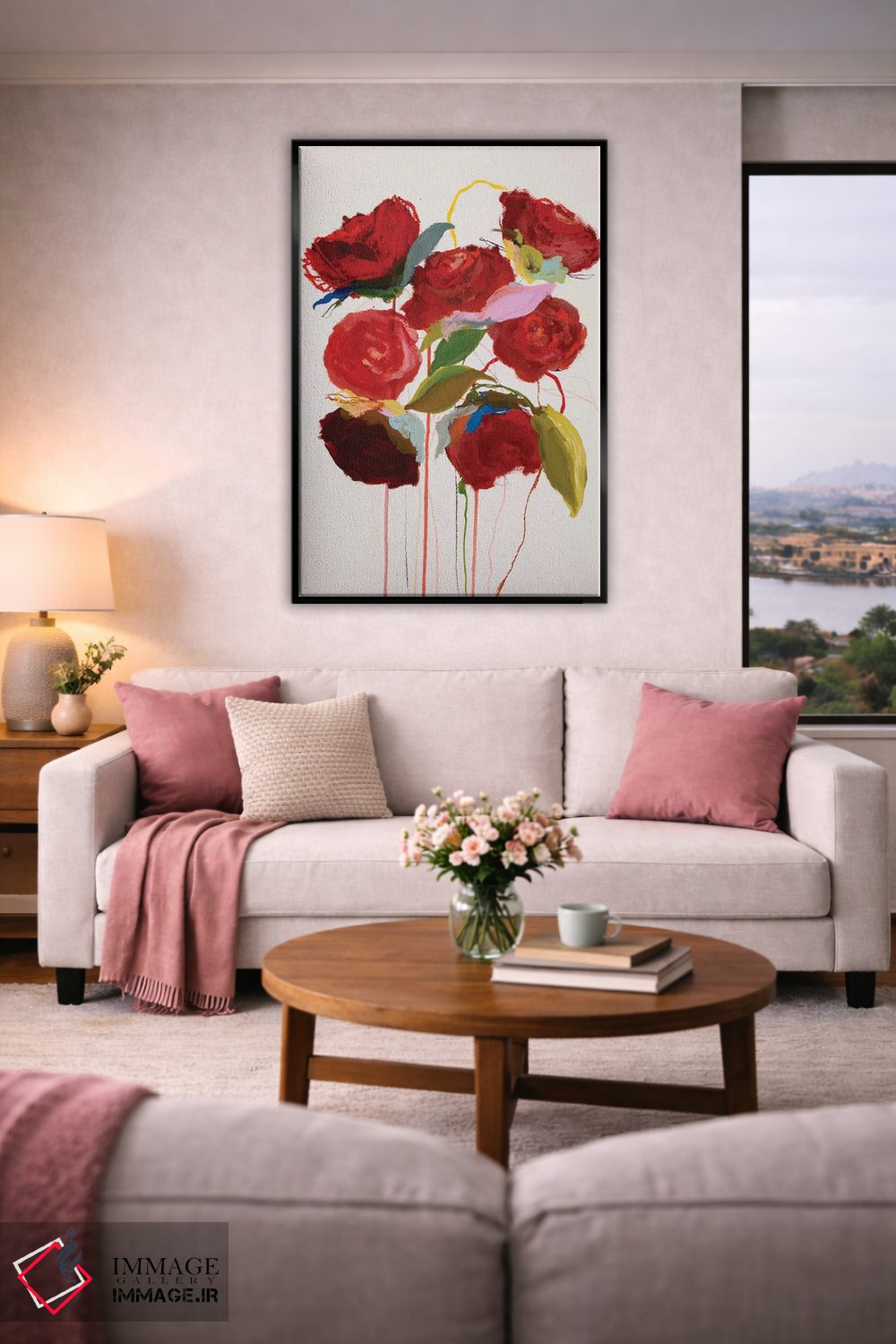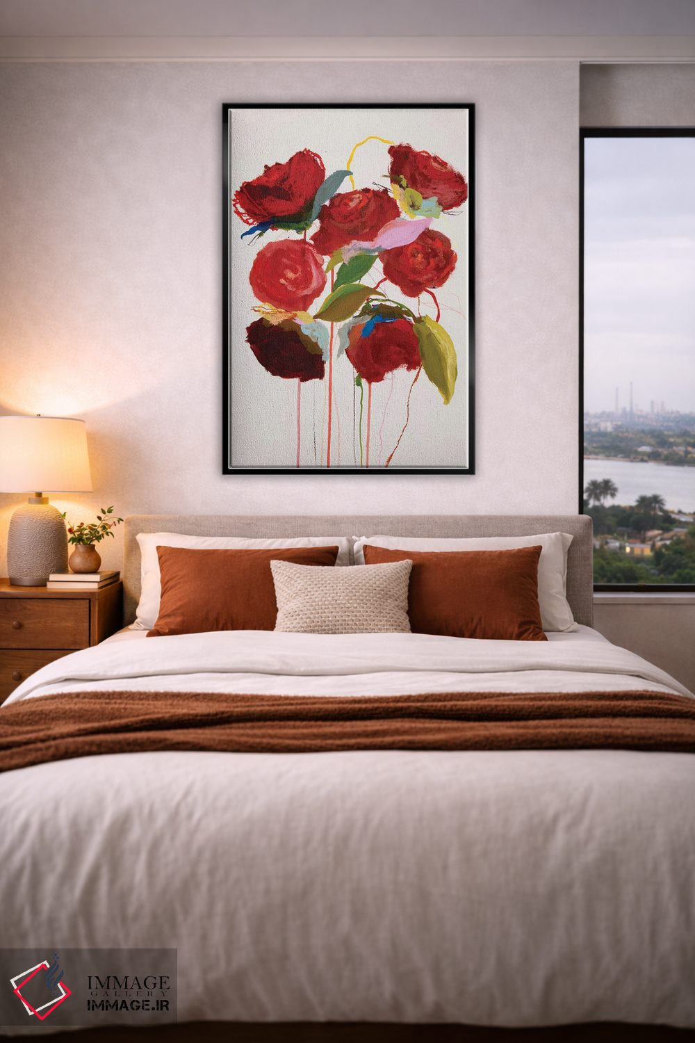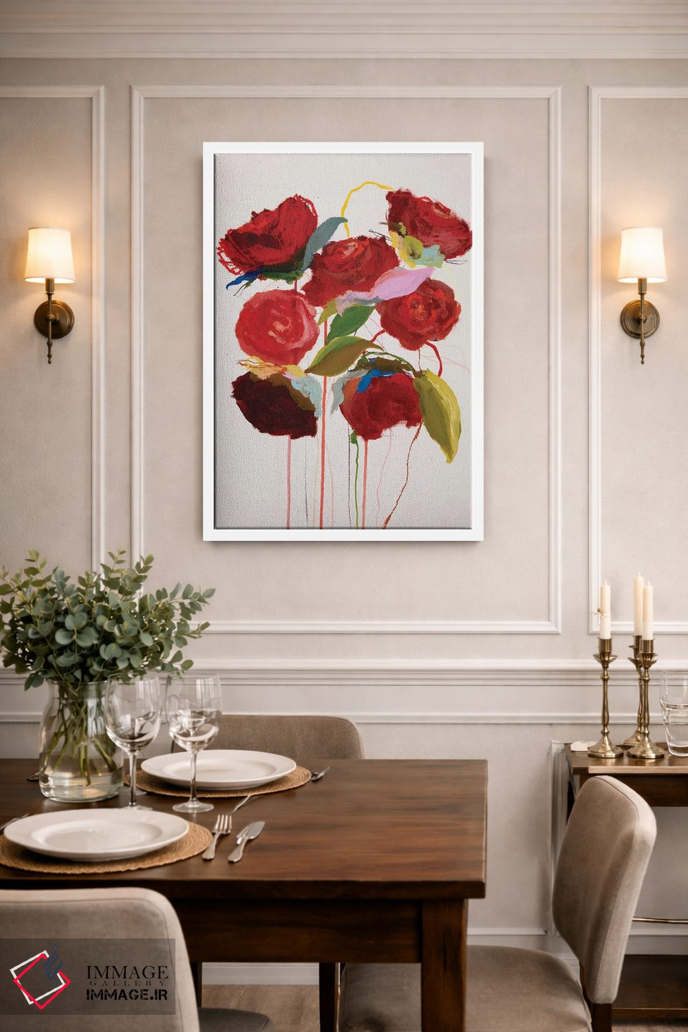 اگر دوست دارید دیوار روشنتر و آرامتر دیده شود، «شکوفه—درِ قرمز من» اثرِ «لی واینر» حس فصل را آرام وارد فضا میکند، برای فضای غذاخوری گزینهٔ مناسبیست. حضورش آرام است، اما بیاثر نیست.