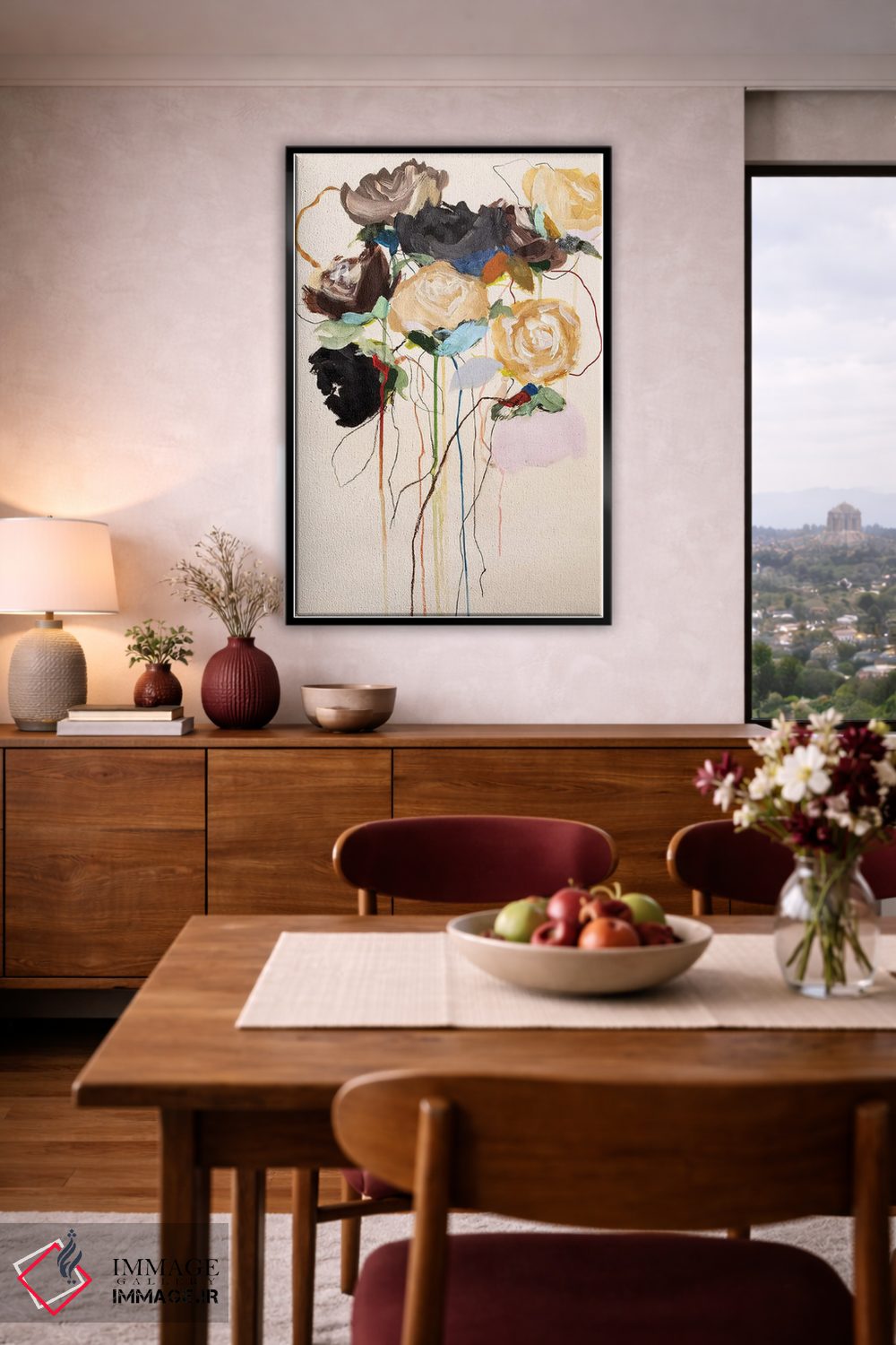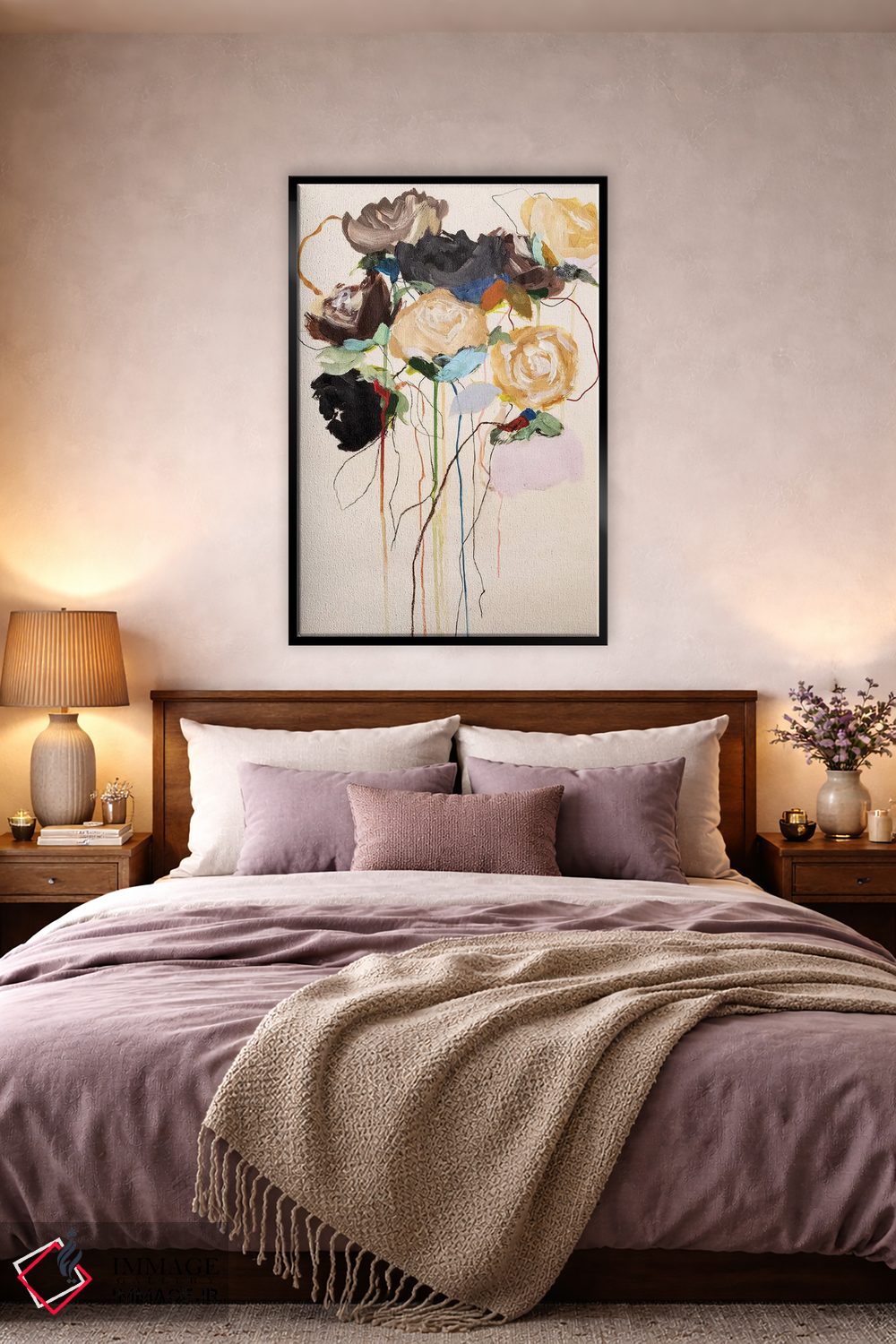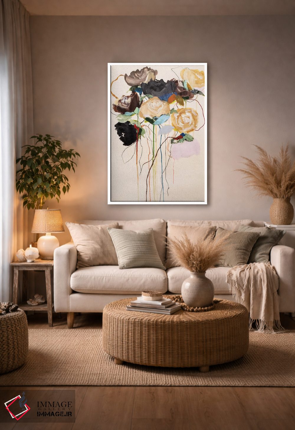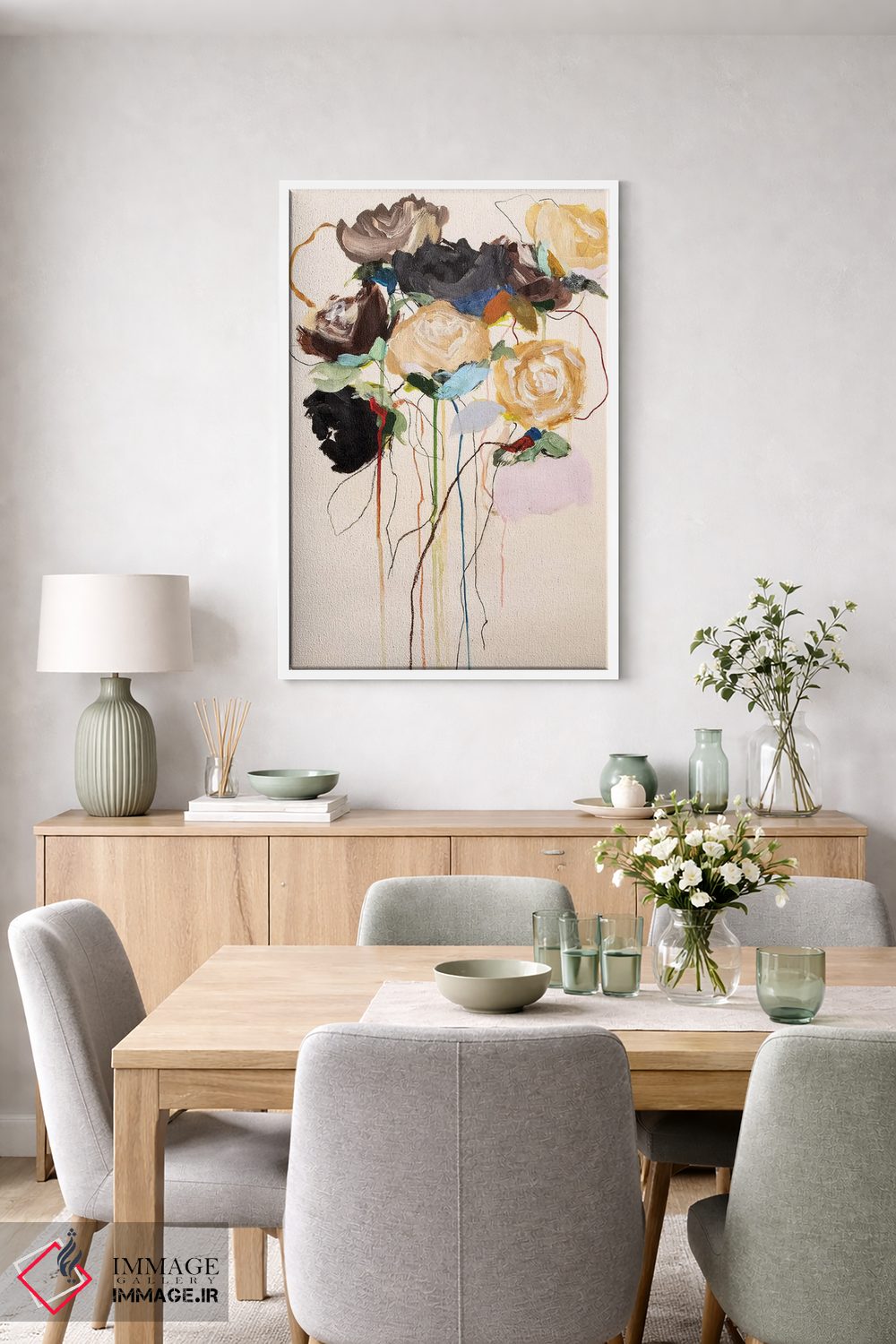 براساس پالت گرم اثر، قاب بلوط روشن (چوبی) پیشنهاد اول است و استخوانی ملایم مکمل. برای سفارشهای پروژهای با ابعاد و قابهای اختصاصی با ایماژ در تماس باشید.