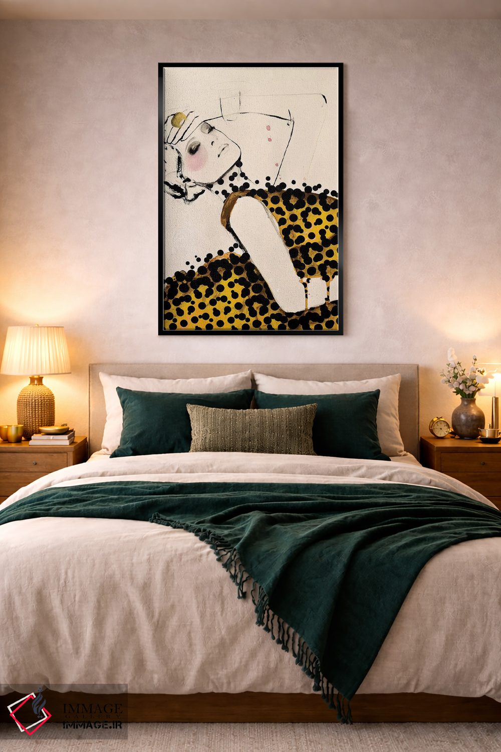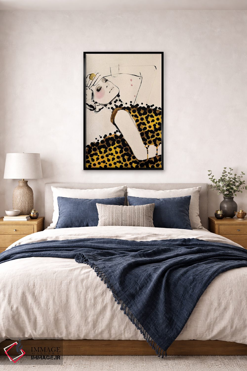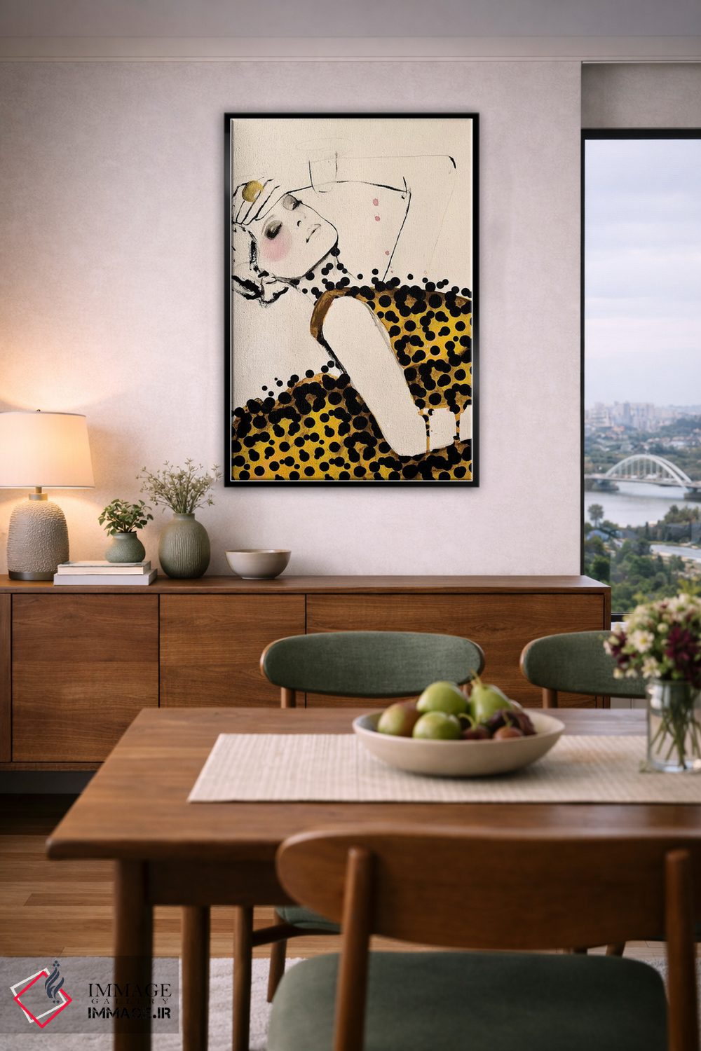 براساس پالت گرم اثر، قاب بلوط روشن (چوبی) پیشنهاد اول است و استخوانی ملایم مکمل. برای سفارشهای پروژهای با ابعاد و قابهای اختصاصی با ایماژ در تماس باشید.