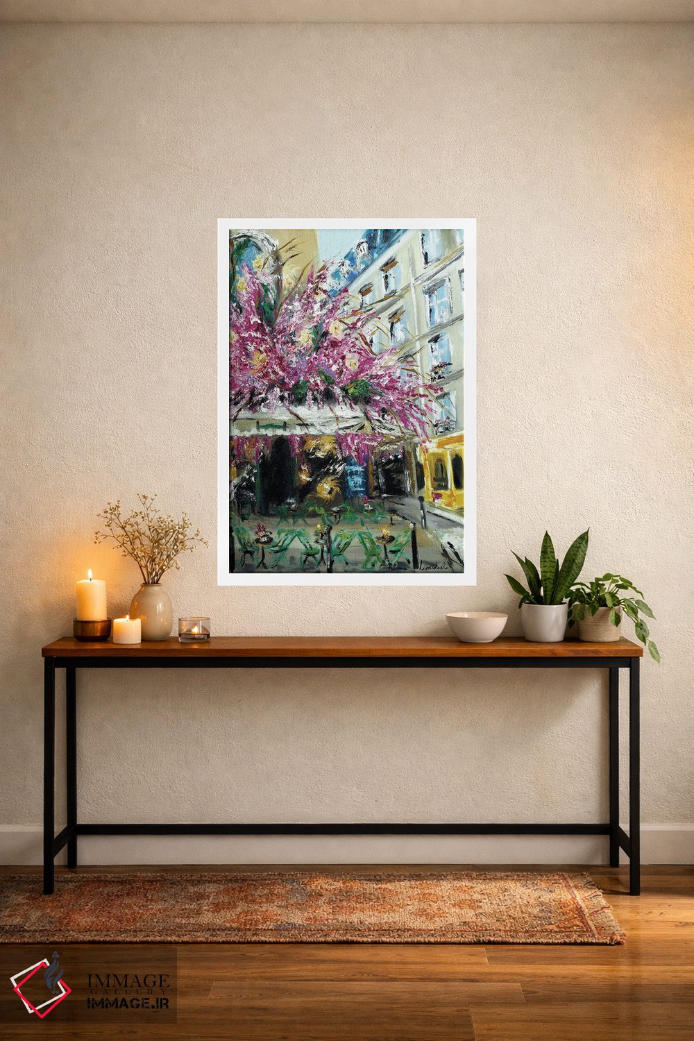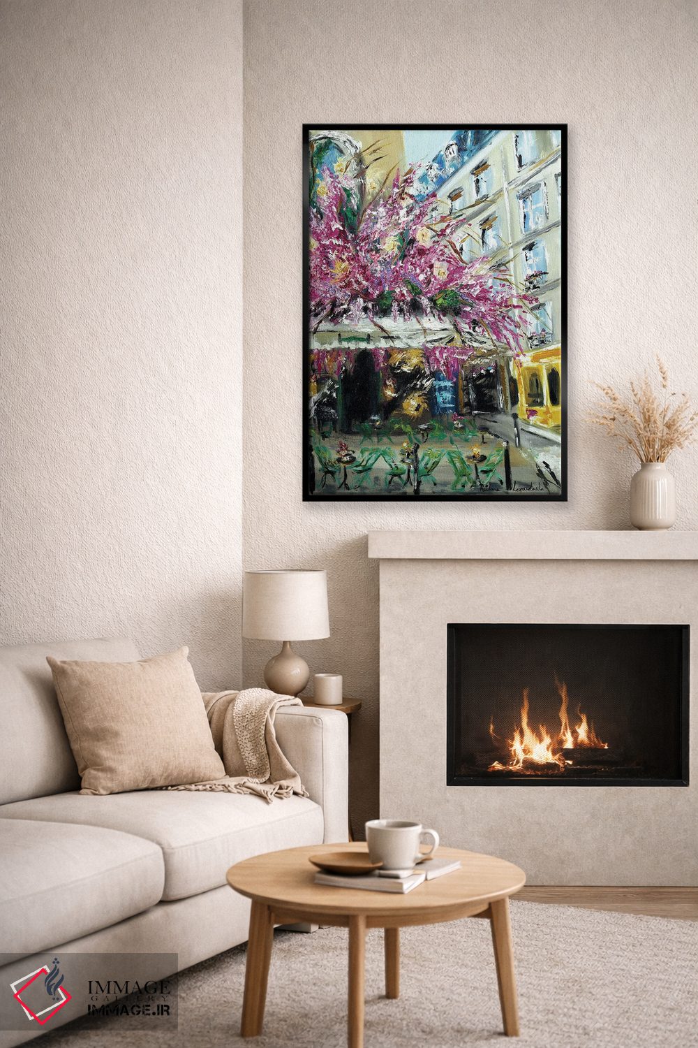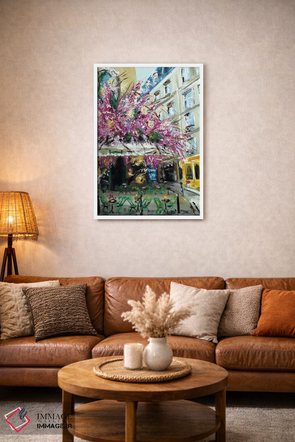 براساس پالت ترکیبی اثر، قاب بلوط روشن (چوبی) پیشنهاد اول است و استخوانی ملایم مکمل. برای سفارشهای پروژهای با ابعاد و قابهای اختصاصی با ایماژ در تماس باشید.