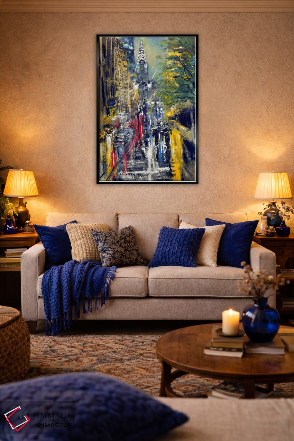 براساس پالت ترکیبی اثر، قاب تیک گرم (چوبی) پیشنهاد اول است و مشکی مات (فریم متوسط) مکمل. برای سفارشهای پروژهای با ابعاد و قابهای اختصاصی با ایماژ در تماس باشید.