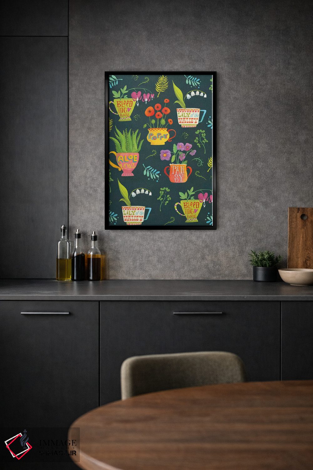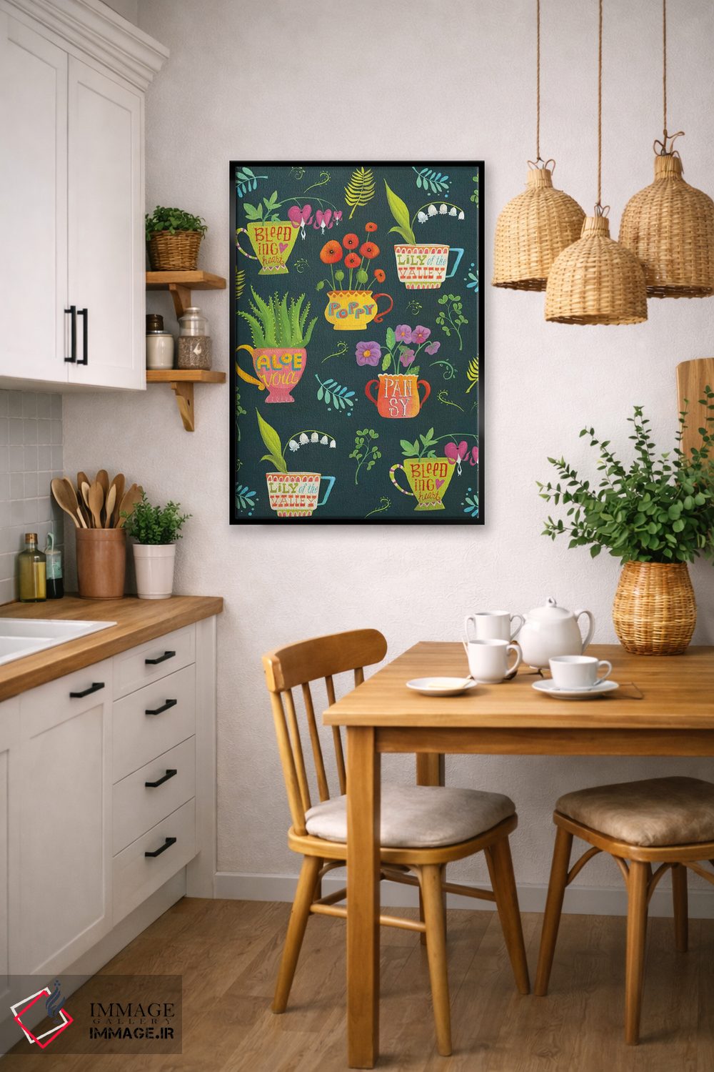 براساس پالت ترکیبی اثر، قاب تیک گرم (چوبی) پیشنهاد اول است و مشکی مات (فریم متوسط) مکمل.