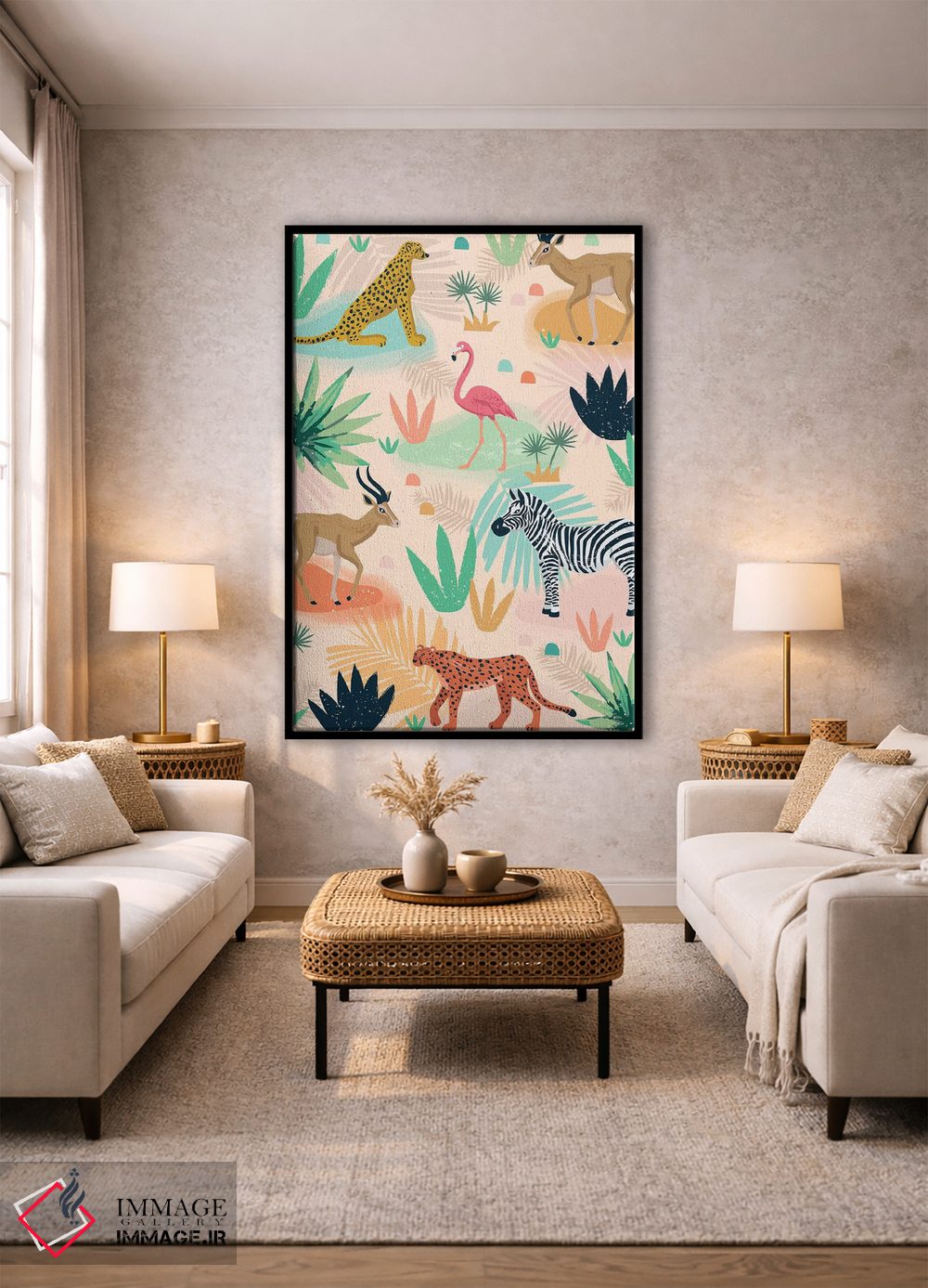 براساس پالت ترکیبی اثر، قاب بلوط روشن (چوبی) پیشنهاد اول است و استخوانی ملایم مکمل. برای سفارشهای پروژهای با ابعاد و قابهای اختصاصی با ایماژ در تماس باشید.