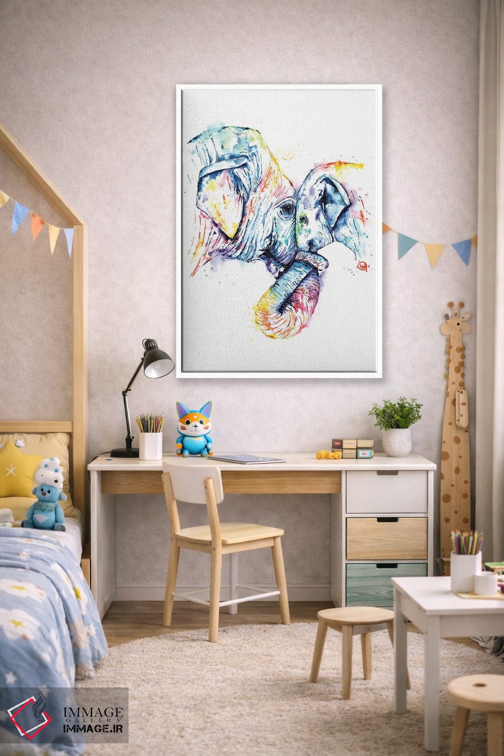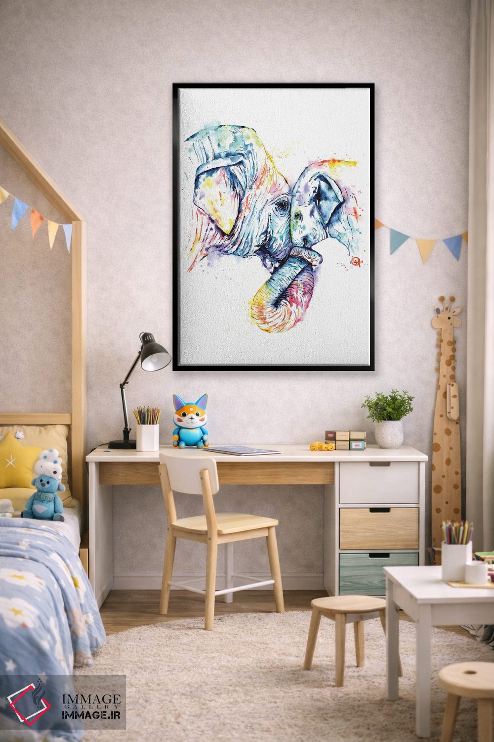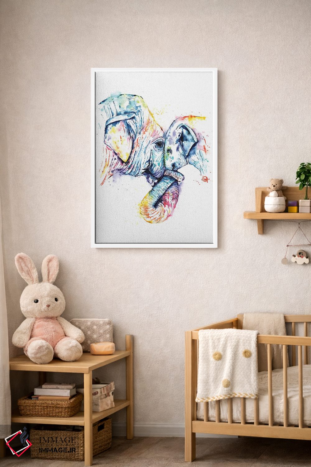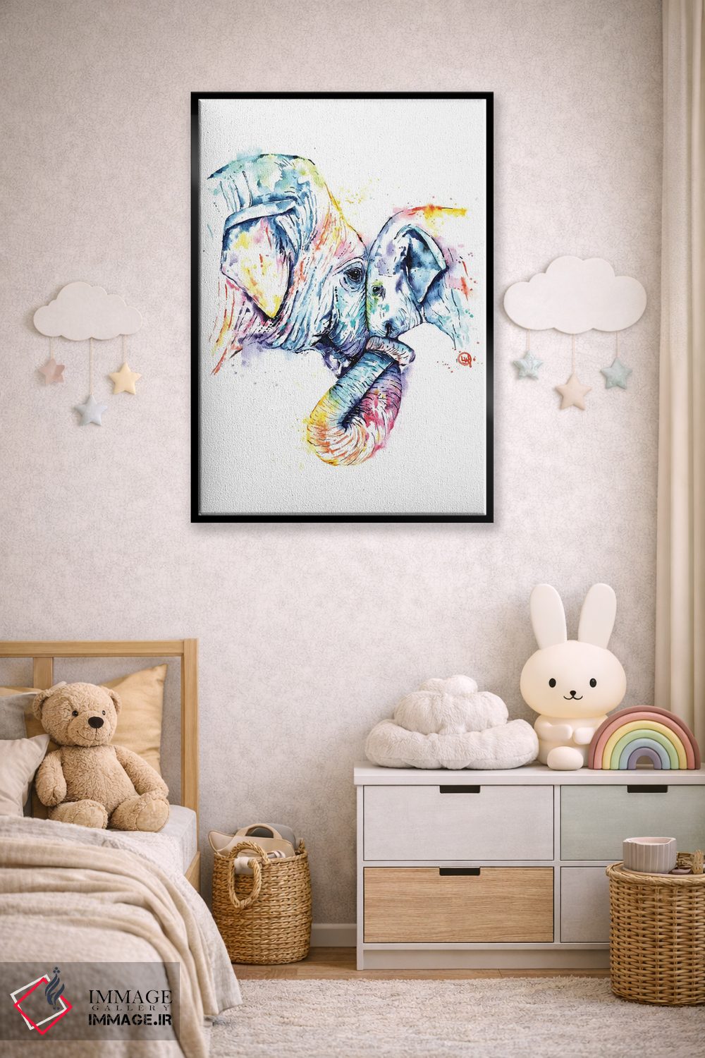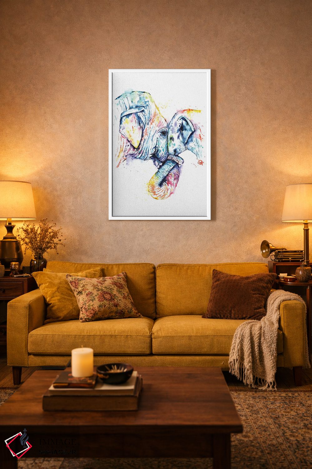 «فیل مادر و بچه» اثرِ «لیزا وایتهاوس» میتواند در کنار رنگهای خنثی، تضاد دلچسبی بسازد؛ برای کافههای کوچک و صمیمی پیشنهاد میشود. در کنار گیاهان و نور طبیعی، جذابتر هم میشود.