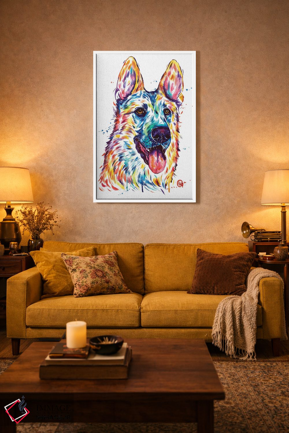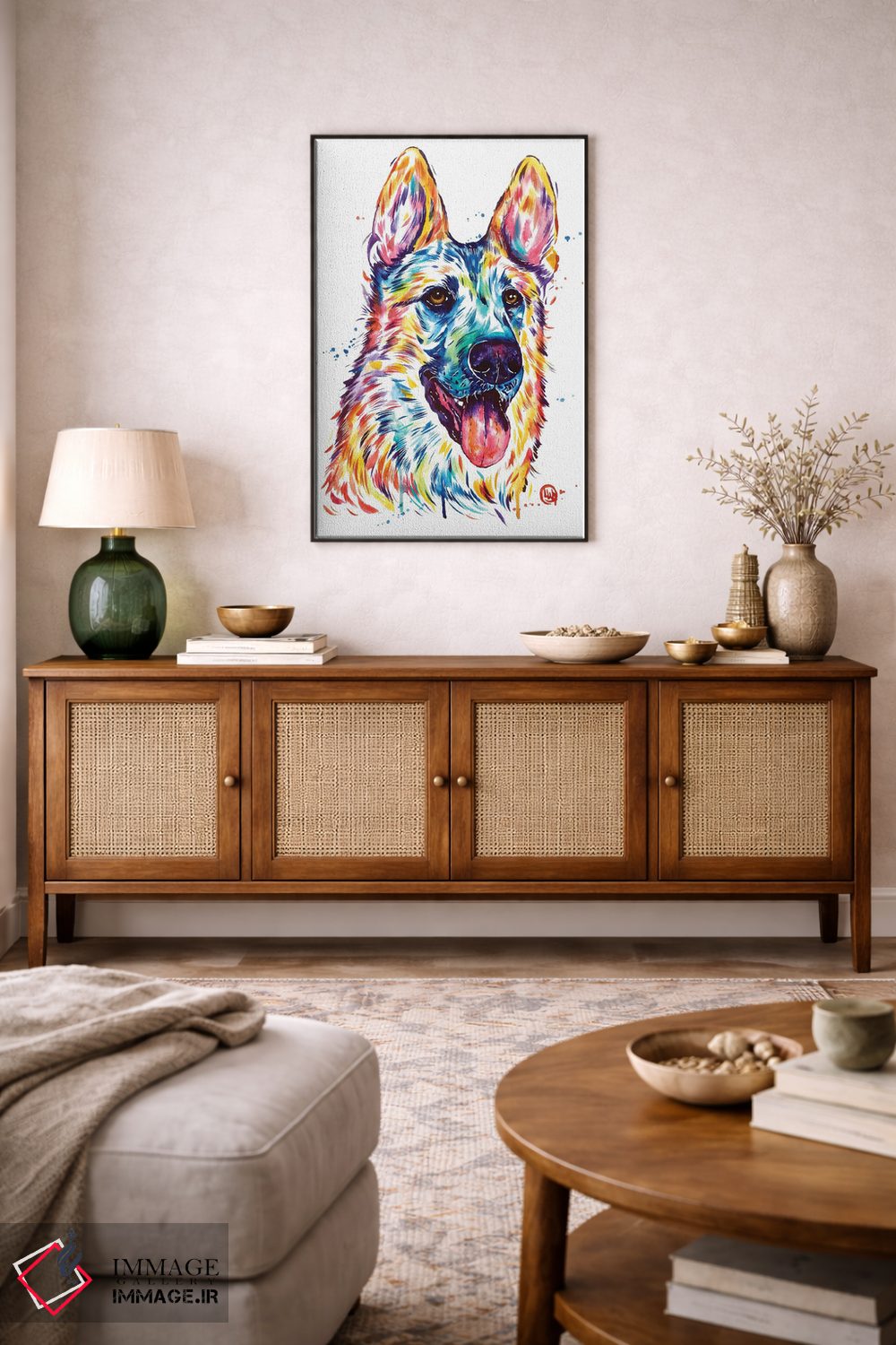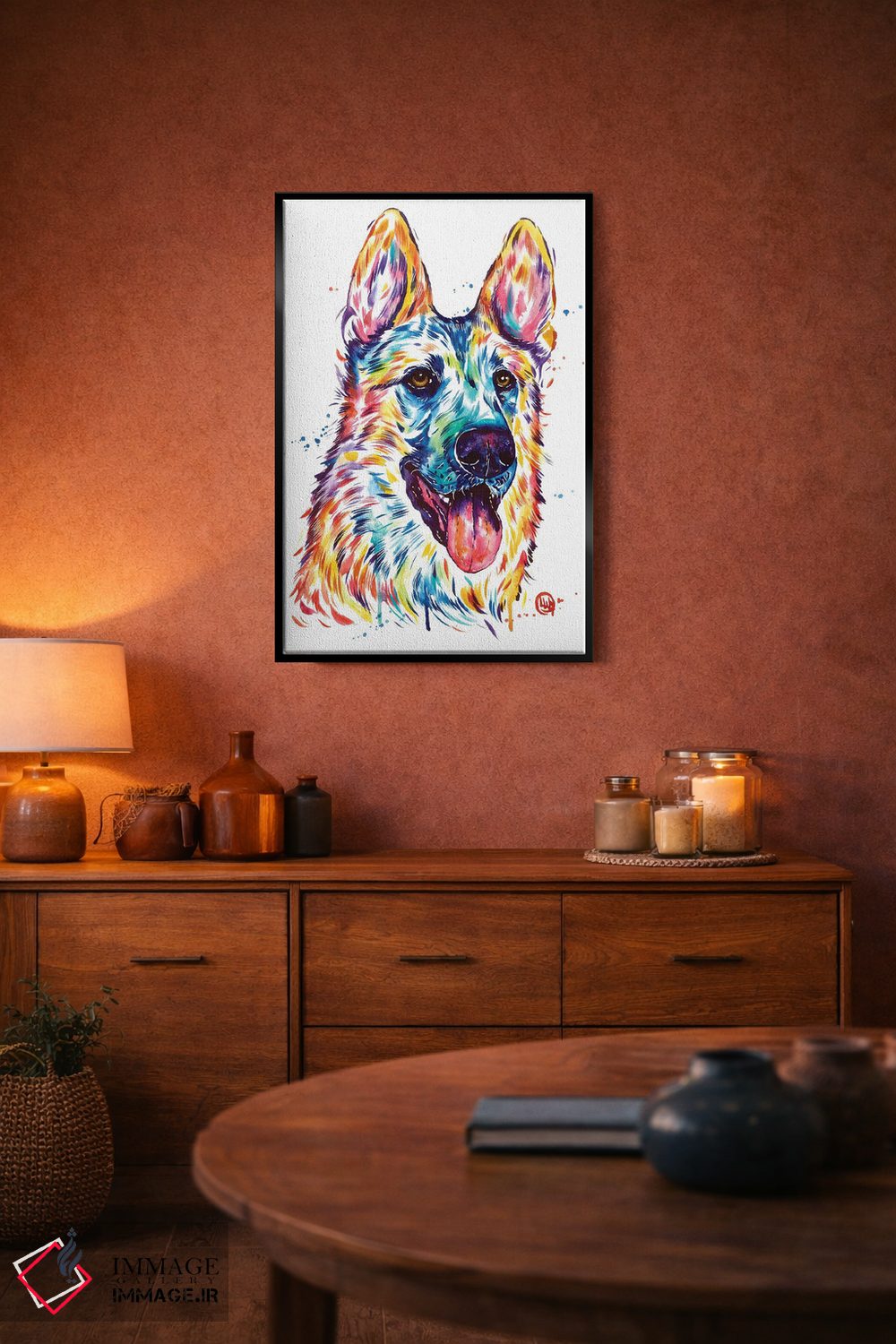 براساس پالت ترکیبی اثر، قاب تیک گرم (چوبی) پیشنهاد اول است و مشکی مات (فریم متوسط) مکمل. برای سفارشهای پروژهای با ابعاد و قابهای اختصاصی با ایماژ در تماس باشید.