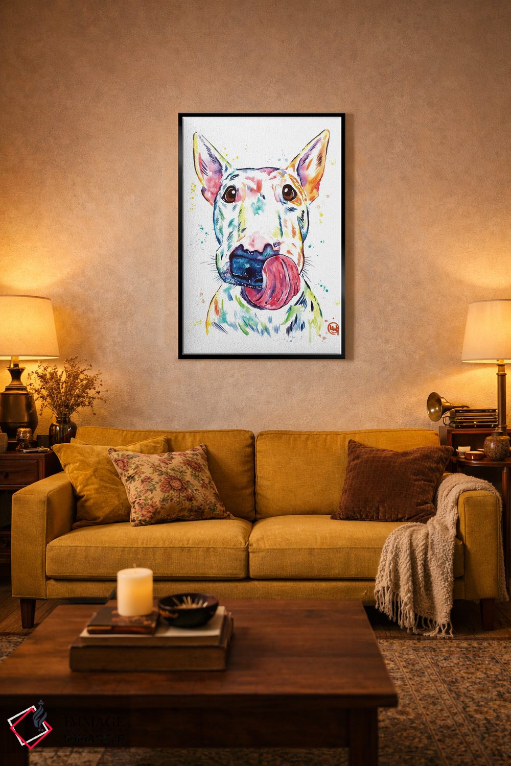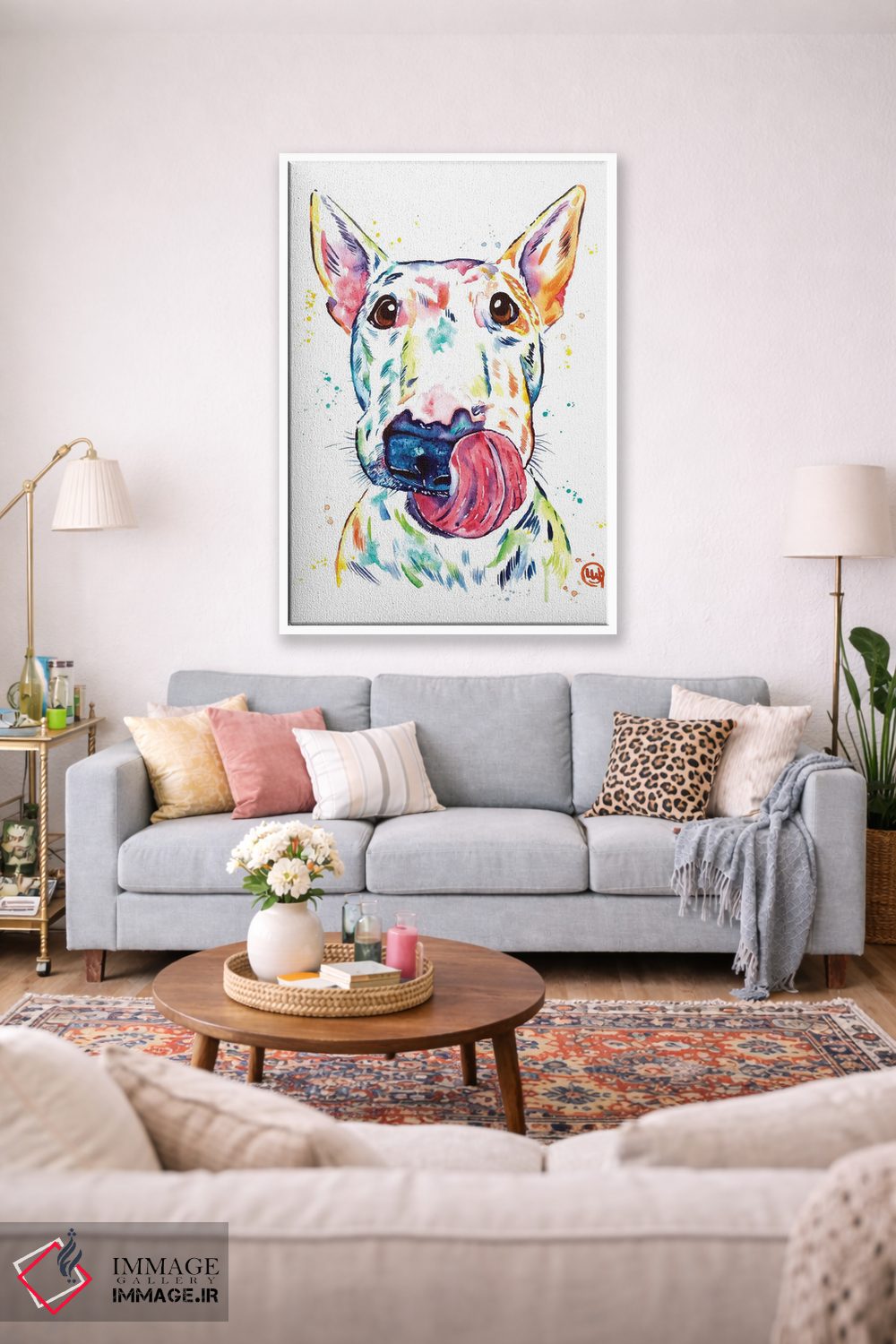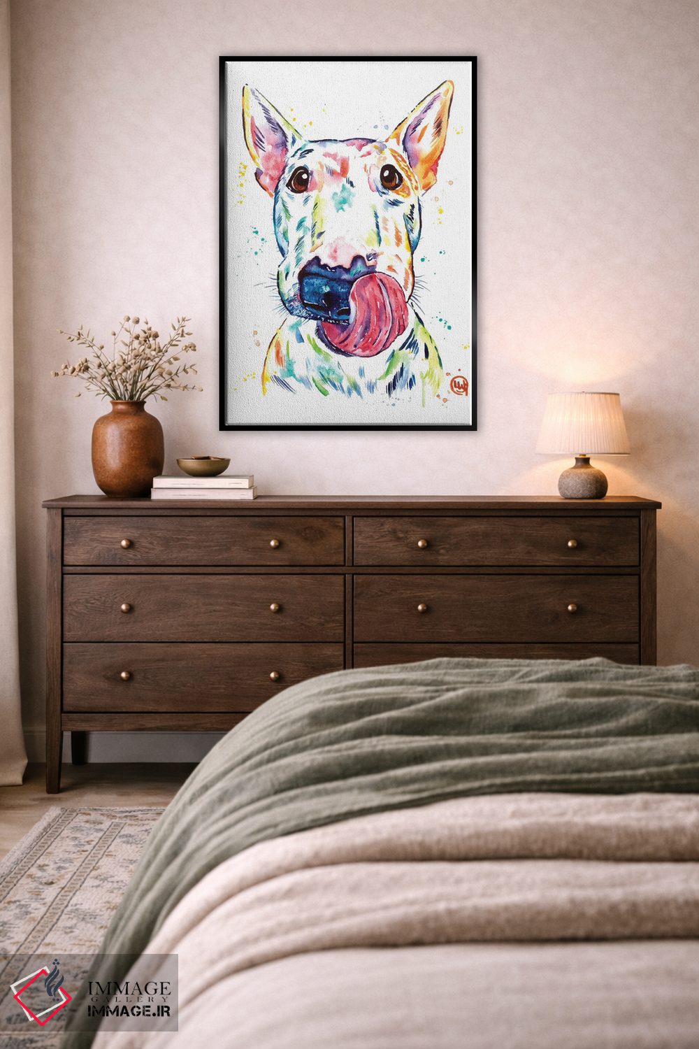«بول تریر (نژاد سگ)» اثرِ «لیزا وایتهاوس» میتواند فضا را صمیمیتر و دعوتکنندهتر نشان بدهد؛ برای فضاهای روستیک یا بوهو پیشنهاد میشود. هم فضا را گرم میکند، هم شلوغش نمیکند.