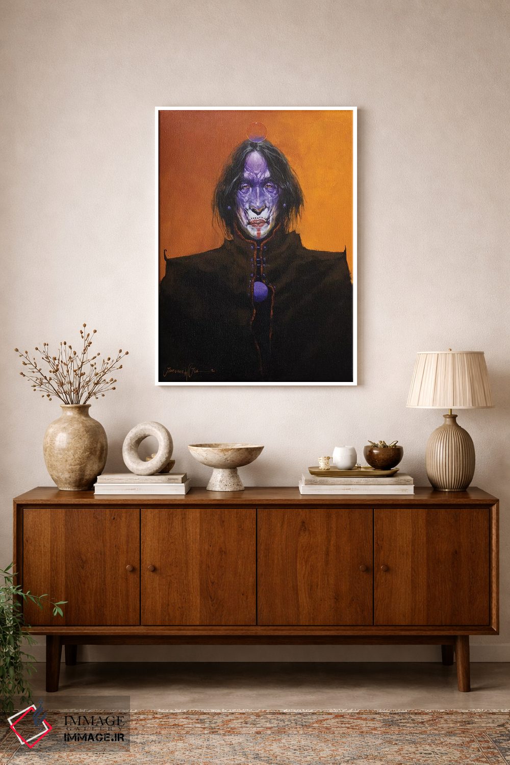 براساس پالت ترکیبی اثر، قاب تیک گرم (چوبی) پیشنهاد اول است و مشکی مات (فریم متوسط) مکمل. برای سفارشهای پروژهای با ابعاد و قابهای اختصاصی با ایماژ در تماس باشید.