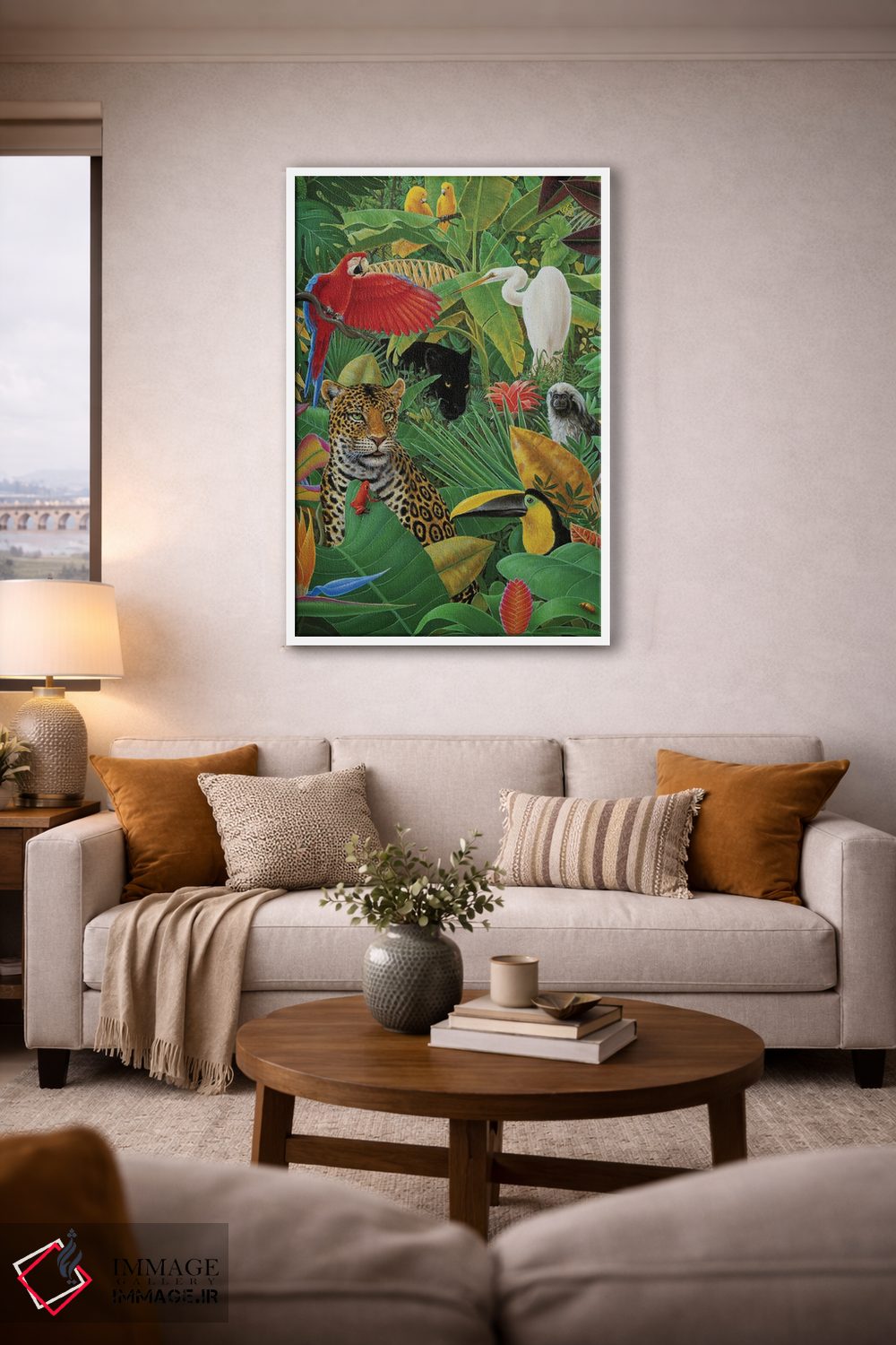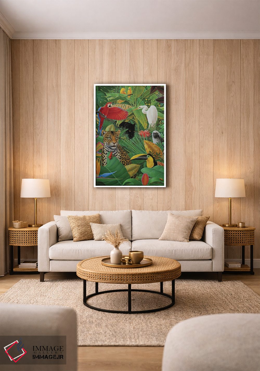 براساس پالت ترکیبی اثر، قاب تیک گرم (چوبی) پیشنهاد اول است و مشکی مات (فریم متوسط) مکمل. برای سفارشهای پروژهای با ابعاد و قابهای اختصاصی با ایماژ در تماس باشید.