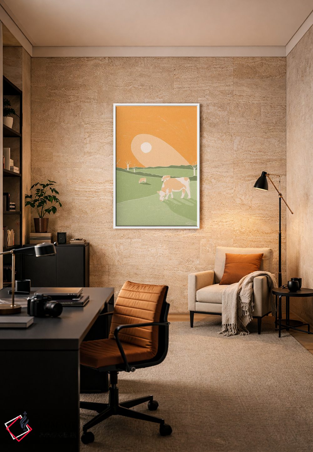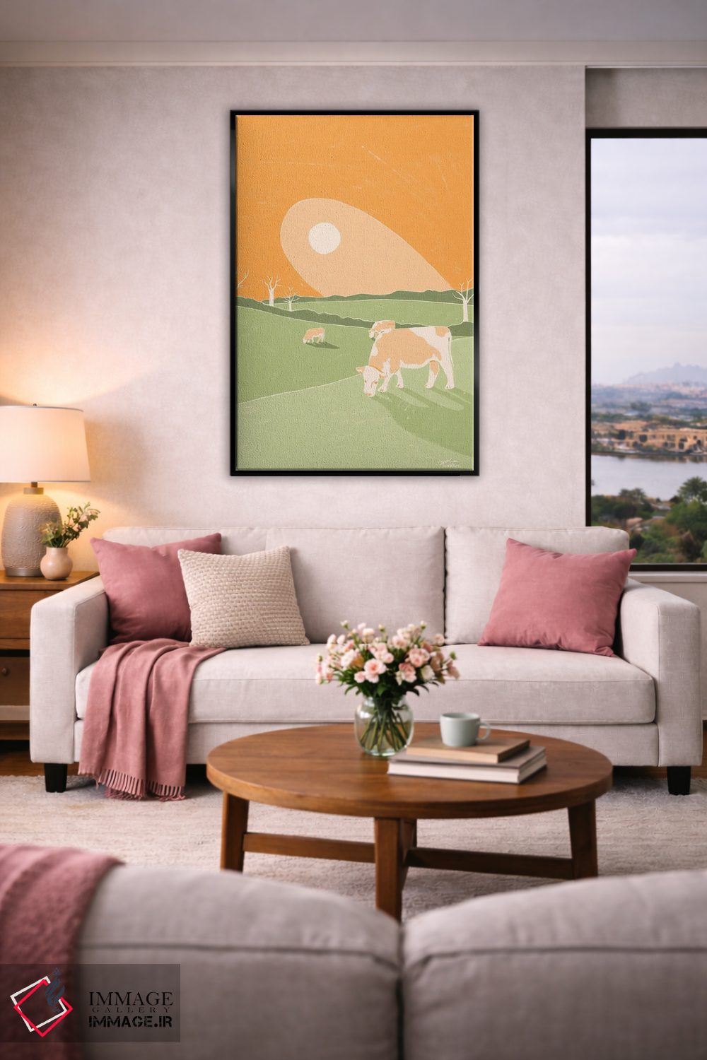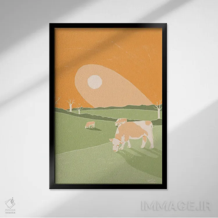 براساس پالت گرم اثر، قاب بلوط روشن (چوبی) پیشنهاد اول است و استخوانی ملایم مکمل. برای سفارشهای پروژهای با ابعاد و قابهای اختصاصی با ایماژ در تماس باشید.