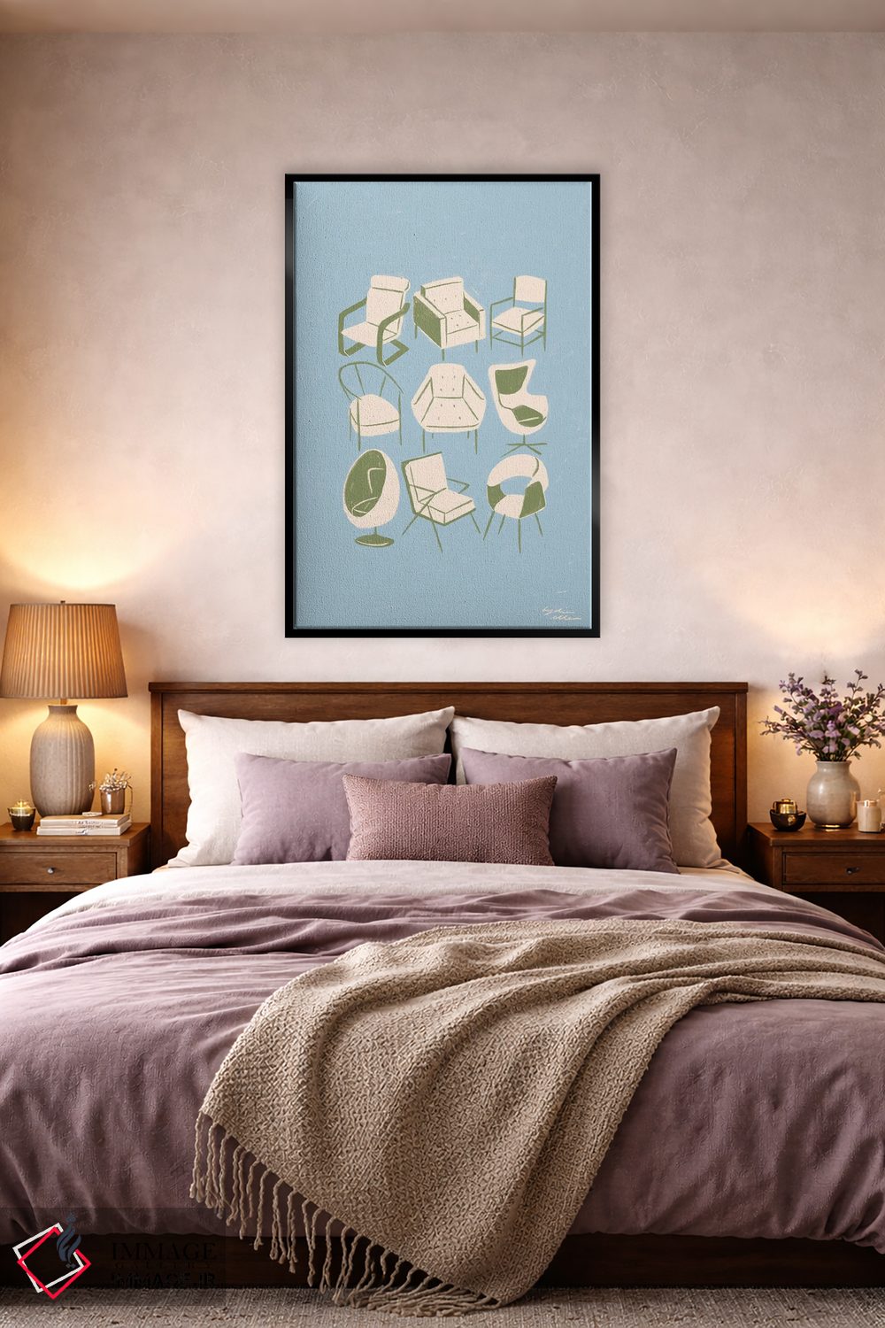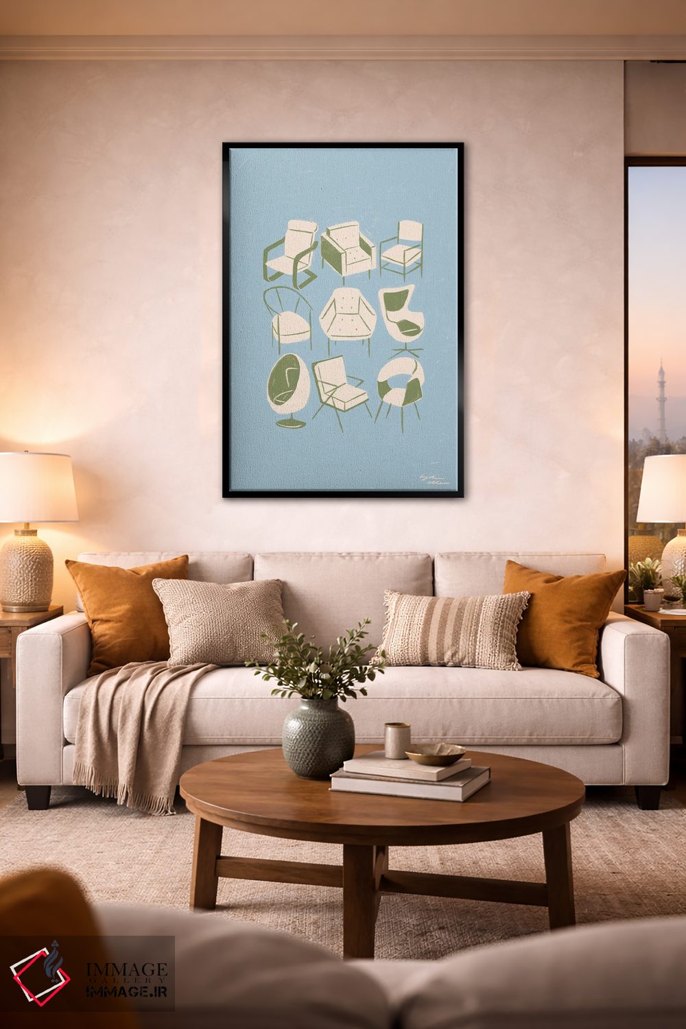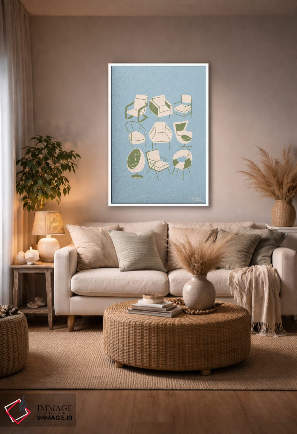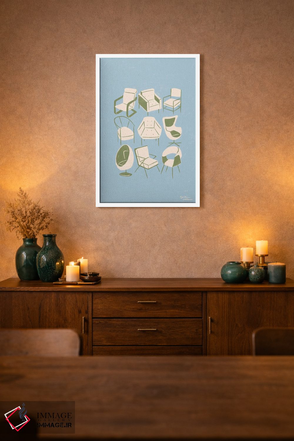 براساس پالت خنثی اثر، قاب بلوط روشن (چوبی) پیشنهاد اول است و استخوانی ملایم مکمل. برای سفارشهای پروژهای با ابعاد و قابهای اختصاصی با ایماژ در تماس باشید.