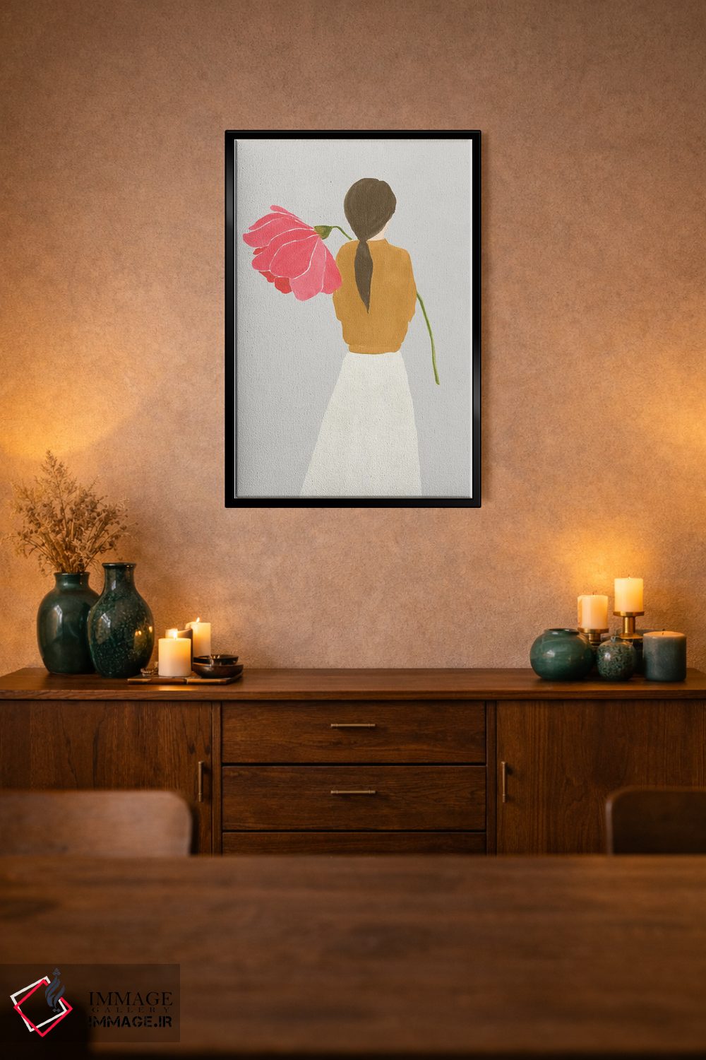 «زن گلی I» اثرِ «لیلی کِی» با لحن دکور بوهمی و موضوعِ این اثر، برای چیدمانهای آزاد، رنگهای گرم و بافتهای طبیعی انتخاب خوبی است.