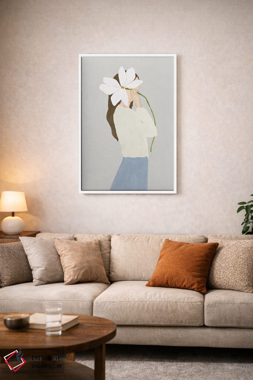 براساس پالت گرم اثر، قاب بلوط روشن (چوبی) پیشنهاد اول است و استخوانی ملایم مکمل. برای سفارشهای پروژهای با ابعاد و قابهای اختصاصی با ایماژ در تماس باشید.