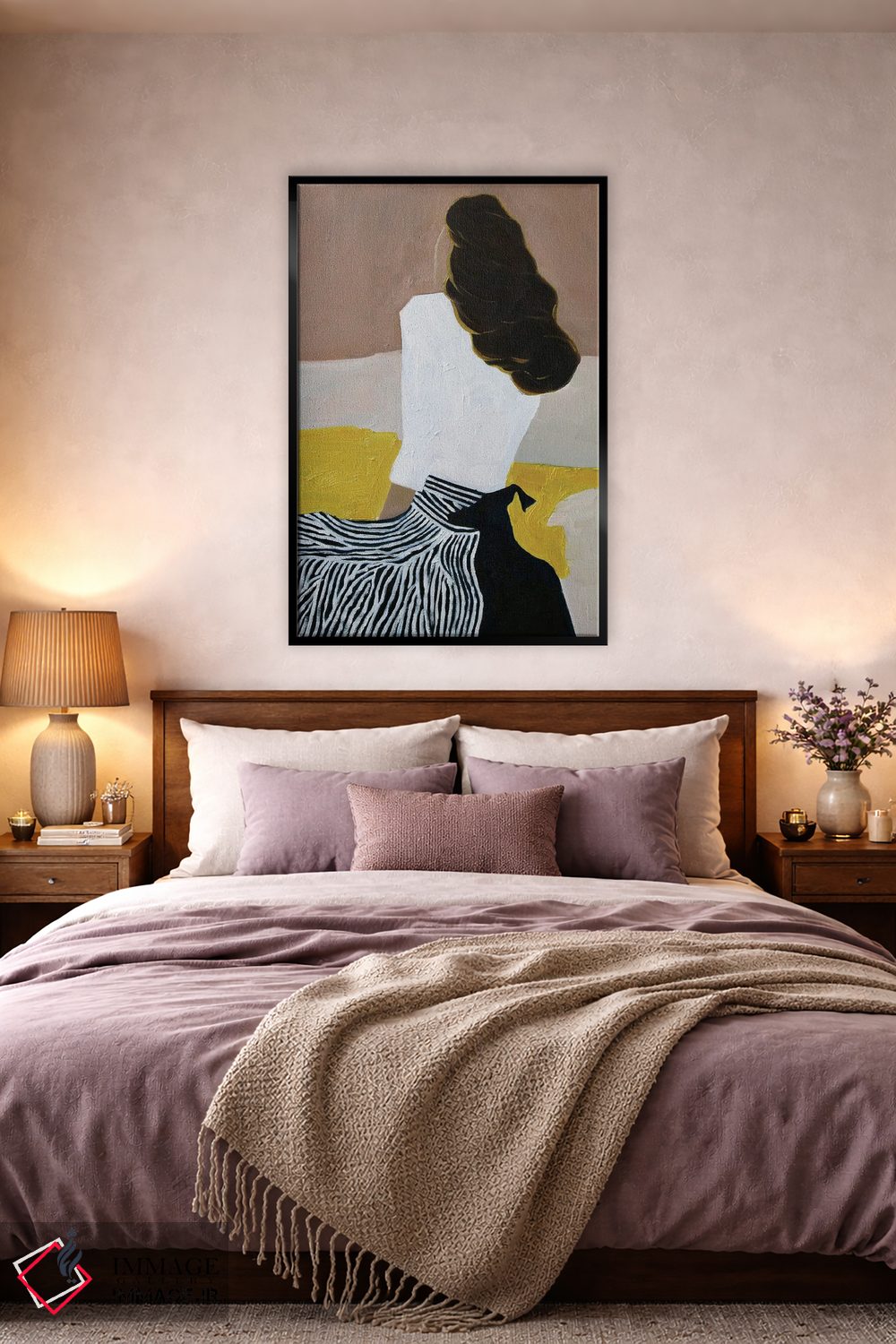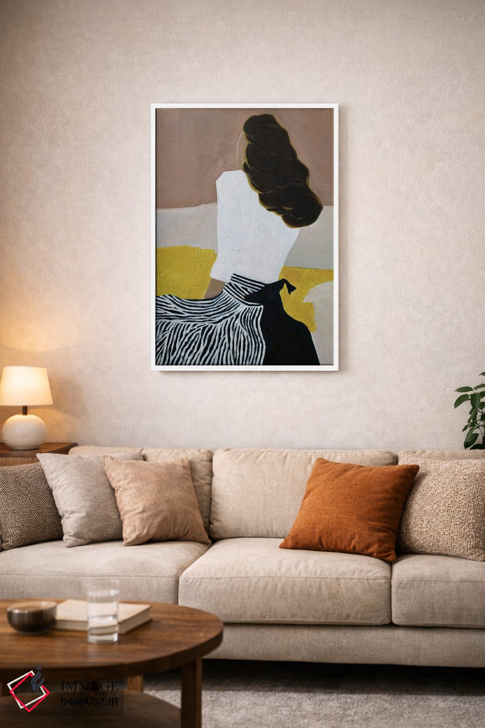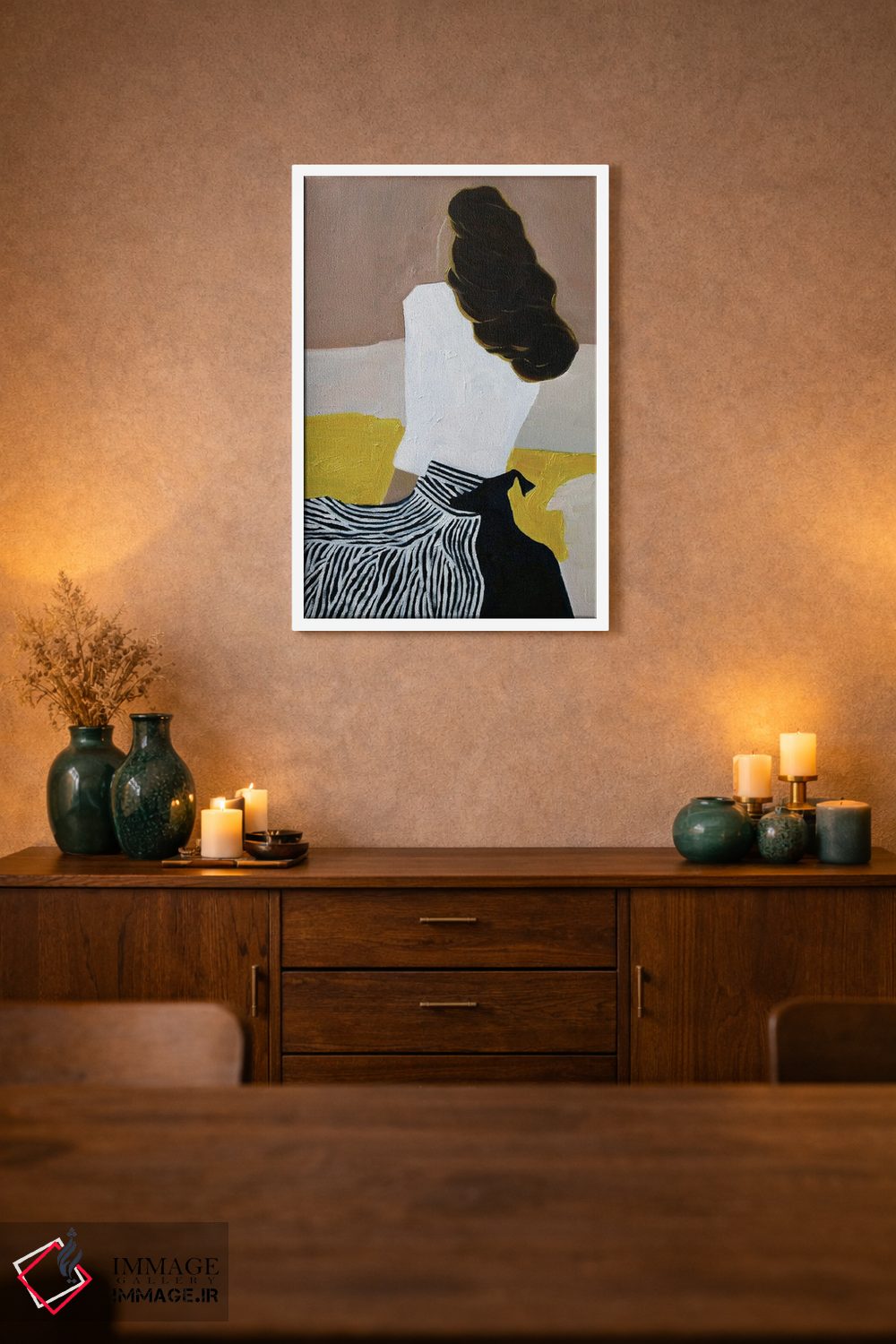 براساس پالت گرم اثر، قاب بلوط روشن (چوبی) پیشنهاد اول است و استخوانی ملایم مکمل. برای سفارشهای پروژهای با ابعاد و قابهای اختصاصی با ایماژ در تماس باشید.