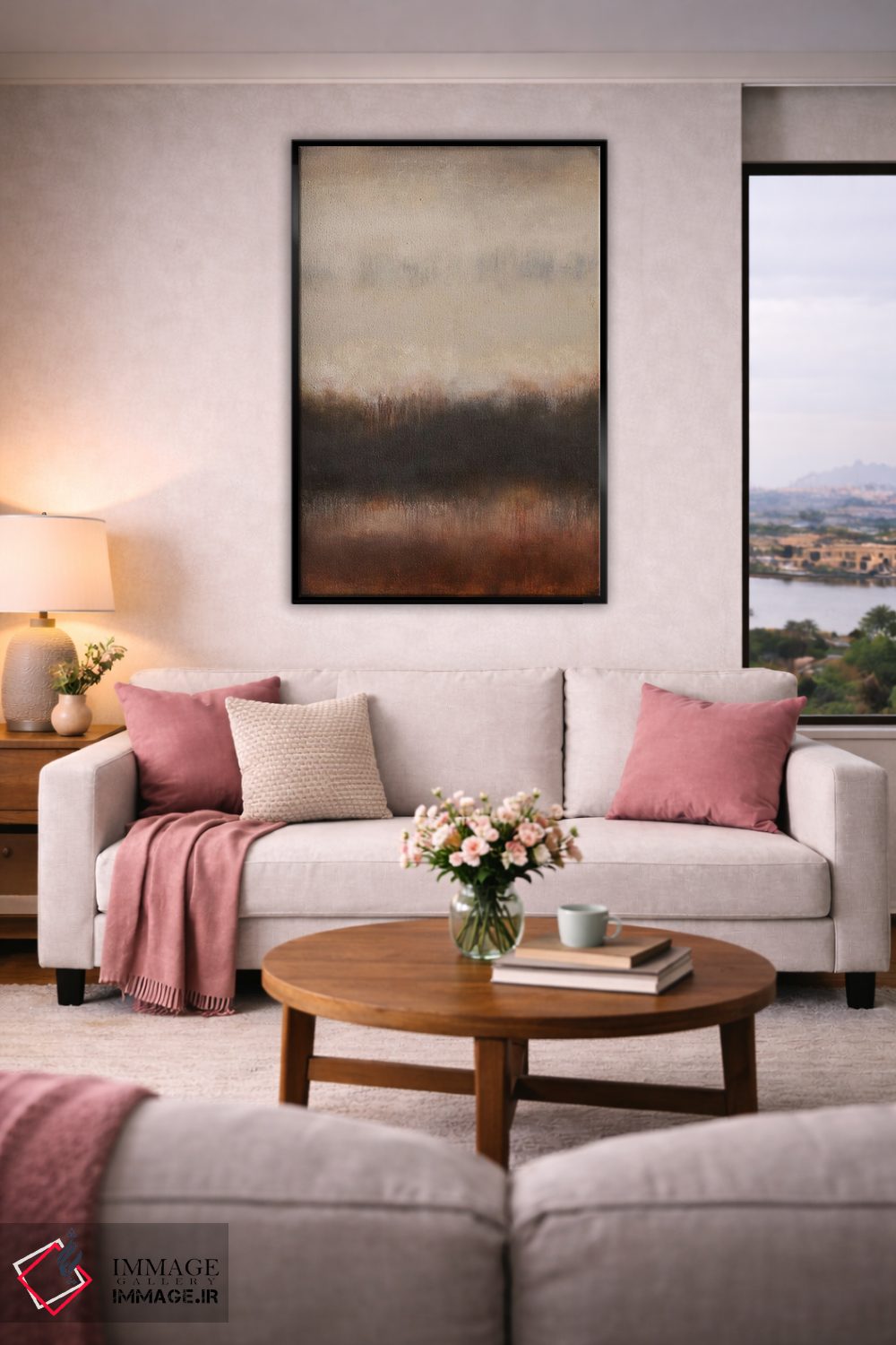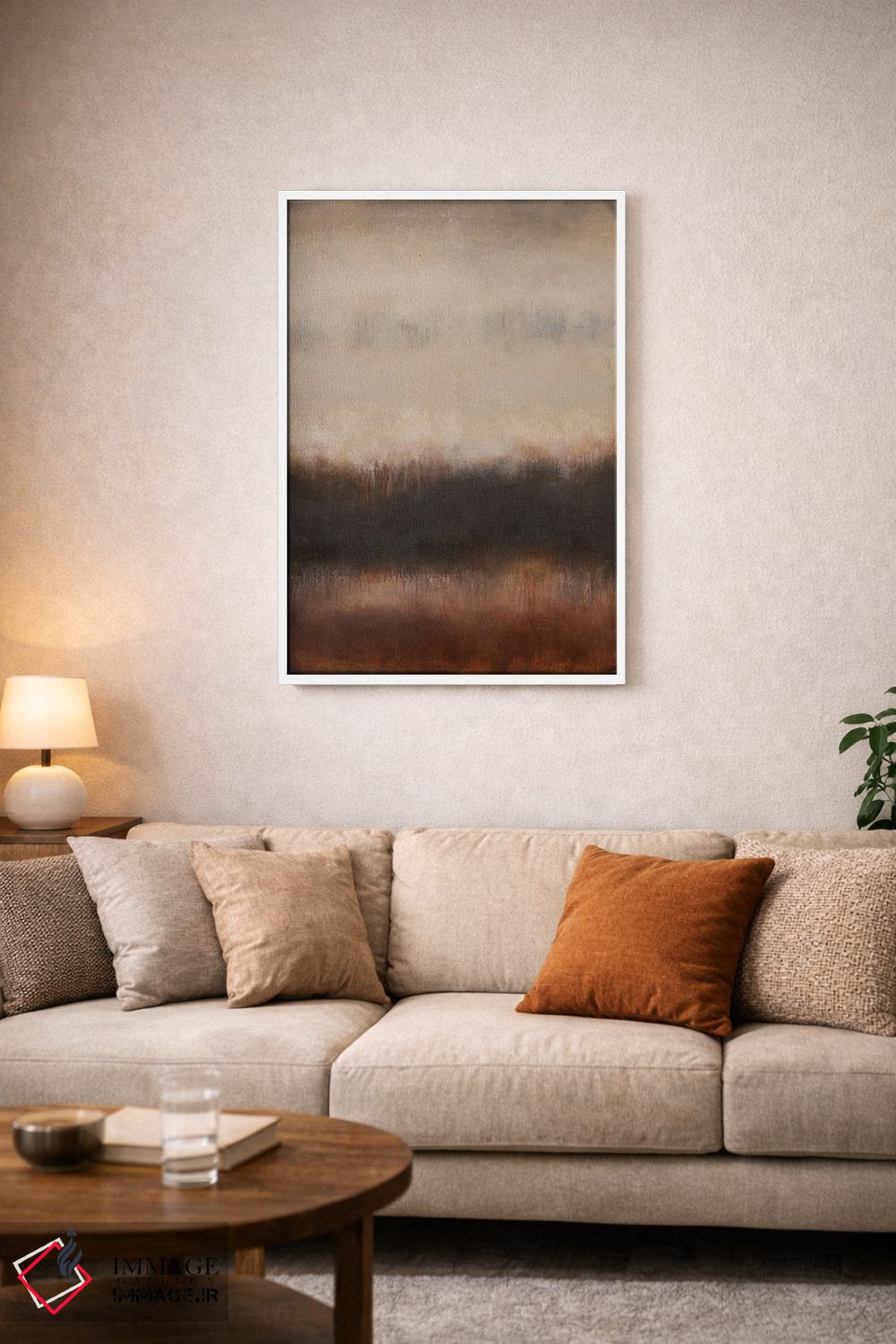 براساس پالت گرم اثر، قاب بلوط روشن (چوبی) پیشنهاد اول است و استخوانی ملایم مکمل. برای سفارشهای پروژهای با ابعاد و قابهای اختصاصی با ایماژ در تماس باشید.