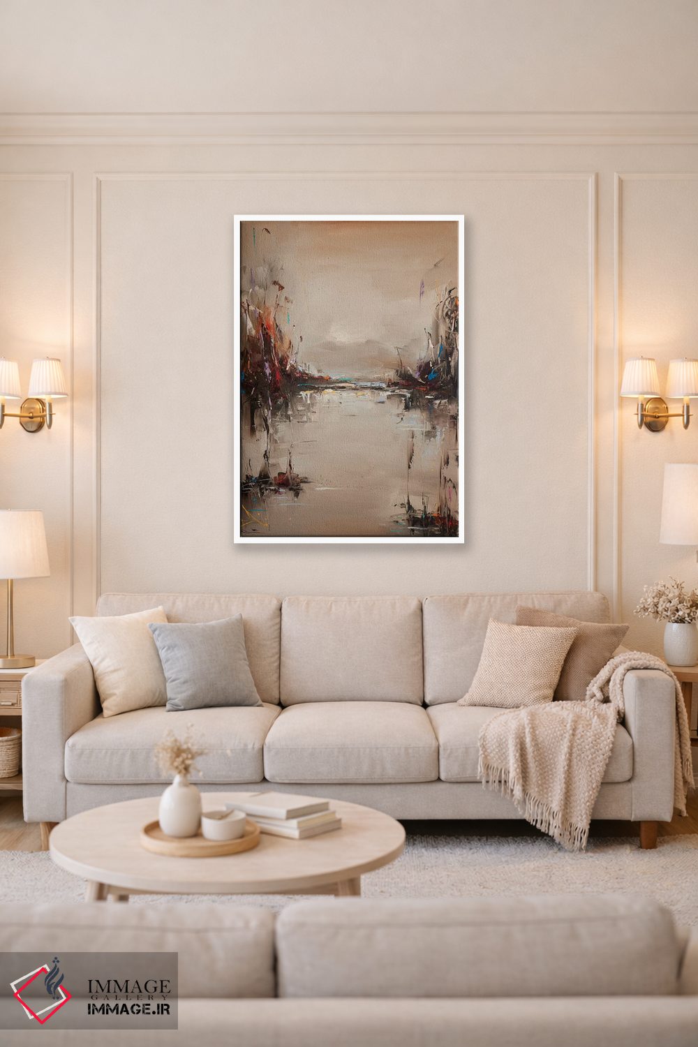 براساس پالت گرم اثر، قاب بلوط روشن (چوبی) پیشنهاد اول است و استخوانی ملایم مکمل. برای سفارشهای پروژهای با ابعاد و قابهای اختصاصی با ایماژ در تماس باشید.