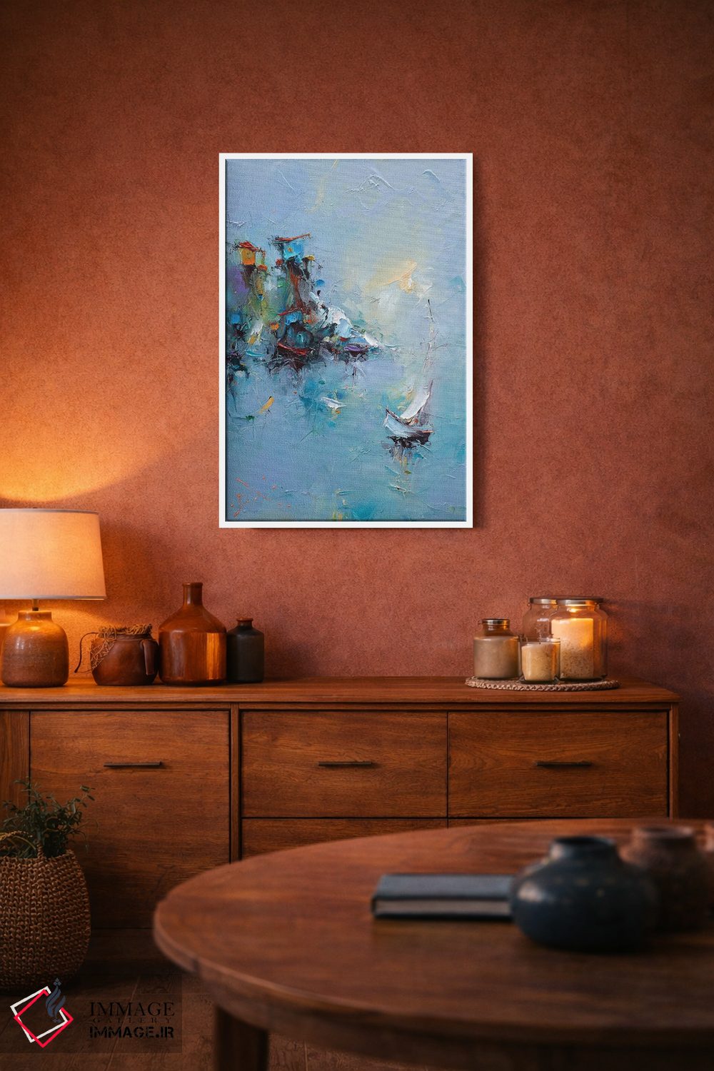 براساس پالت ترکیبی اثر، قاب تیک گرم (چوبی) پیشنهاد اول است و مشکی مات (فریم متوسط) مکمل. برای سفارشهای پروژهای با ابعاد و قابهای اختصاصی با ایماژ در تماس باشید.