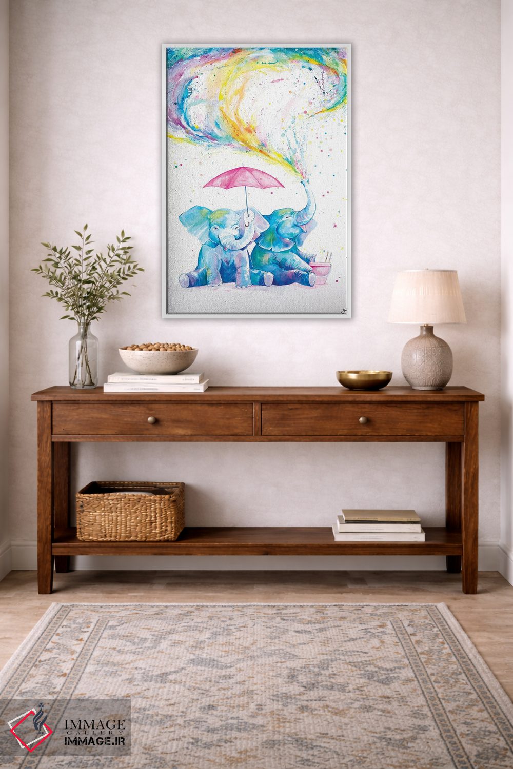 براساس پالت ترکیبی اثر، قاب تیک گرم (چوبی) پیشنهاد اول است و مشکی مات (فریم متوسط) مکمل. برای سفارشهای پروژهای با ابعاد و قابهای اختصاصی با ایماژ در تماس باشید.
