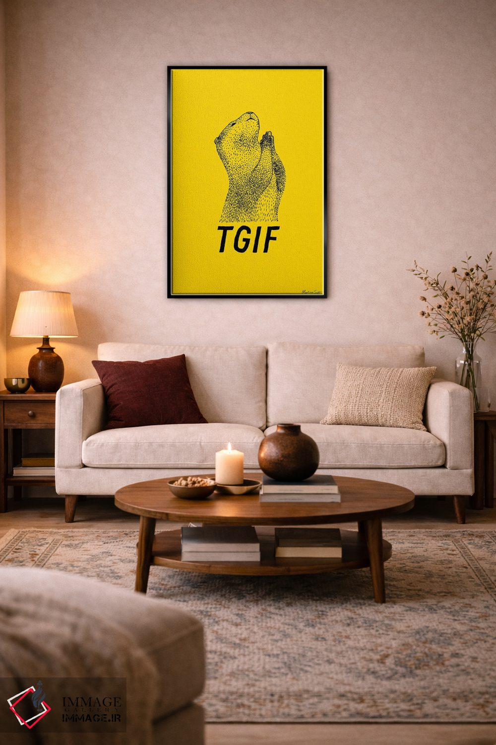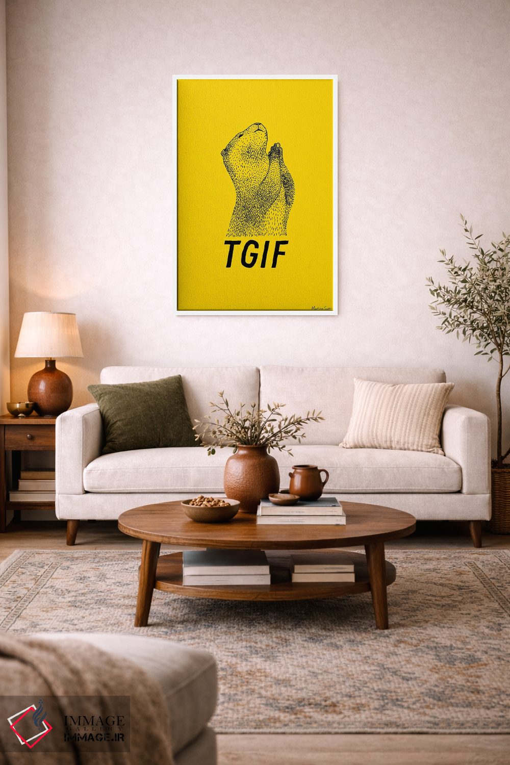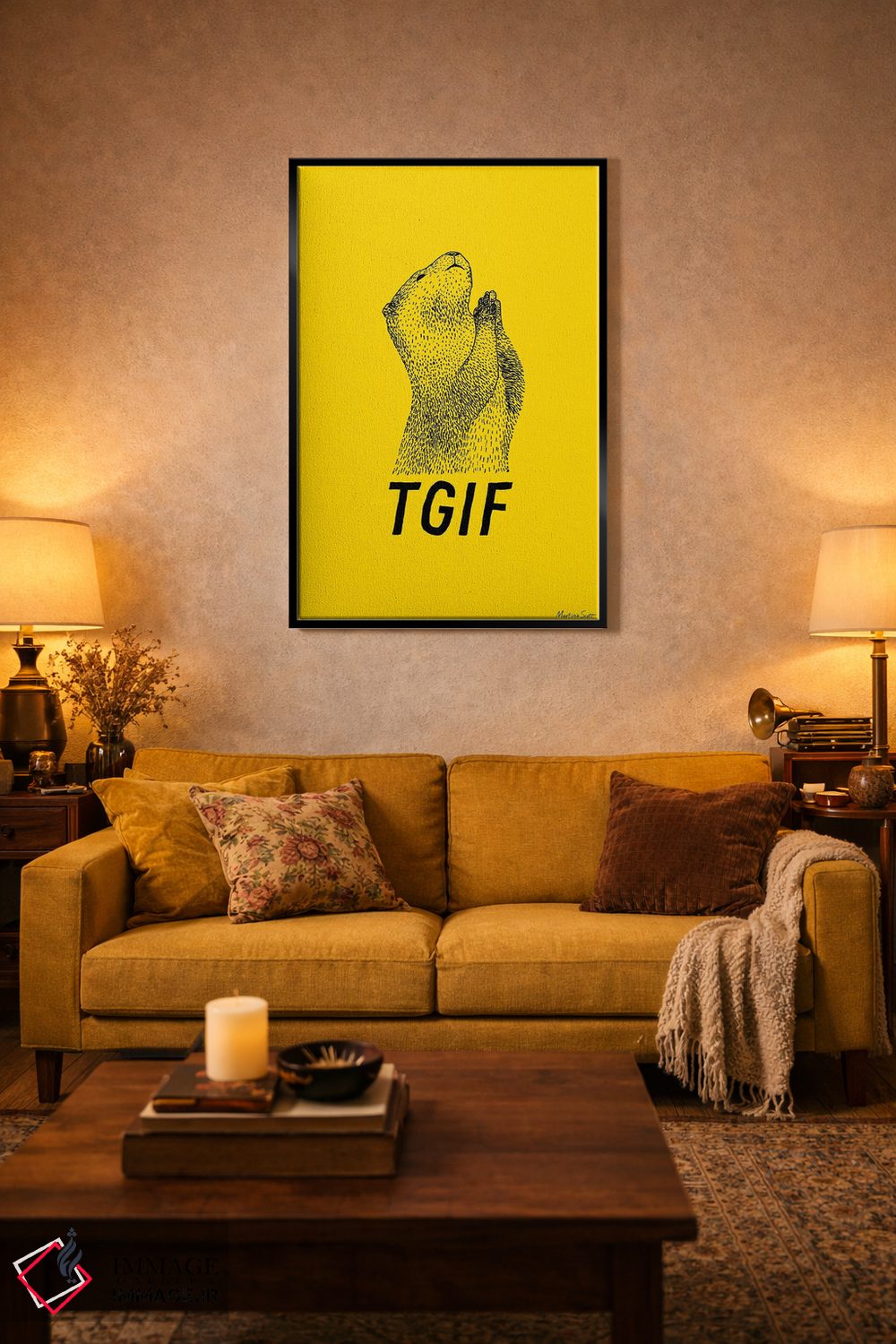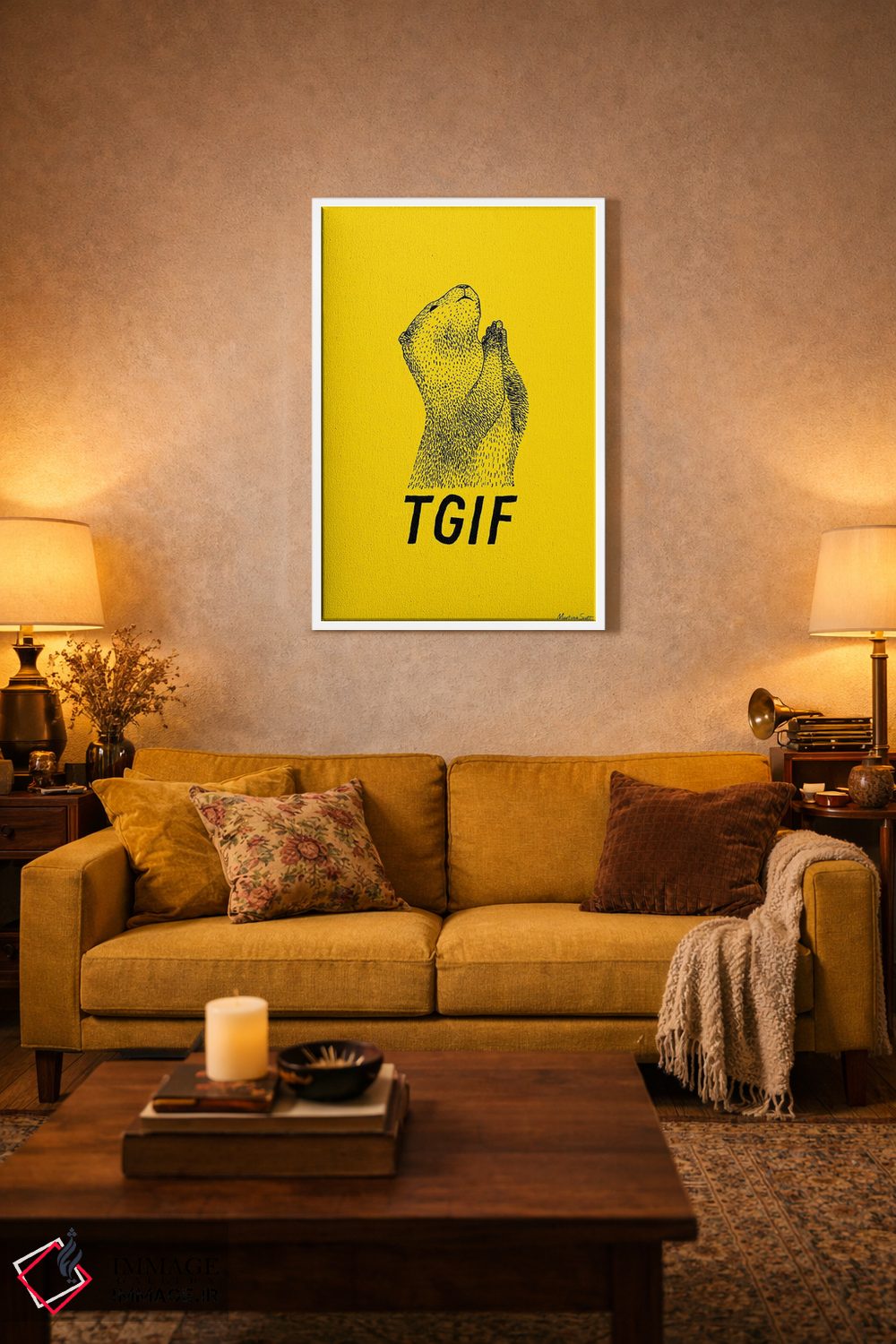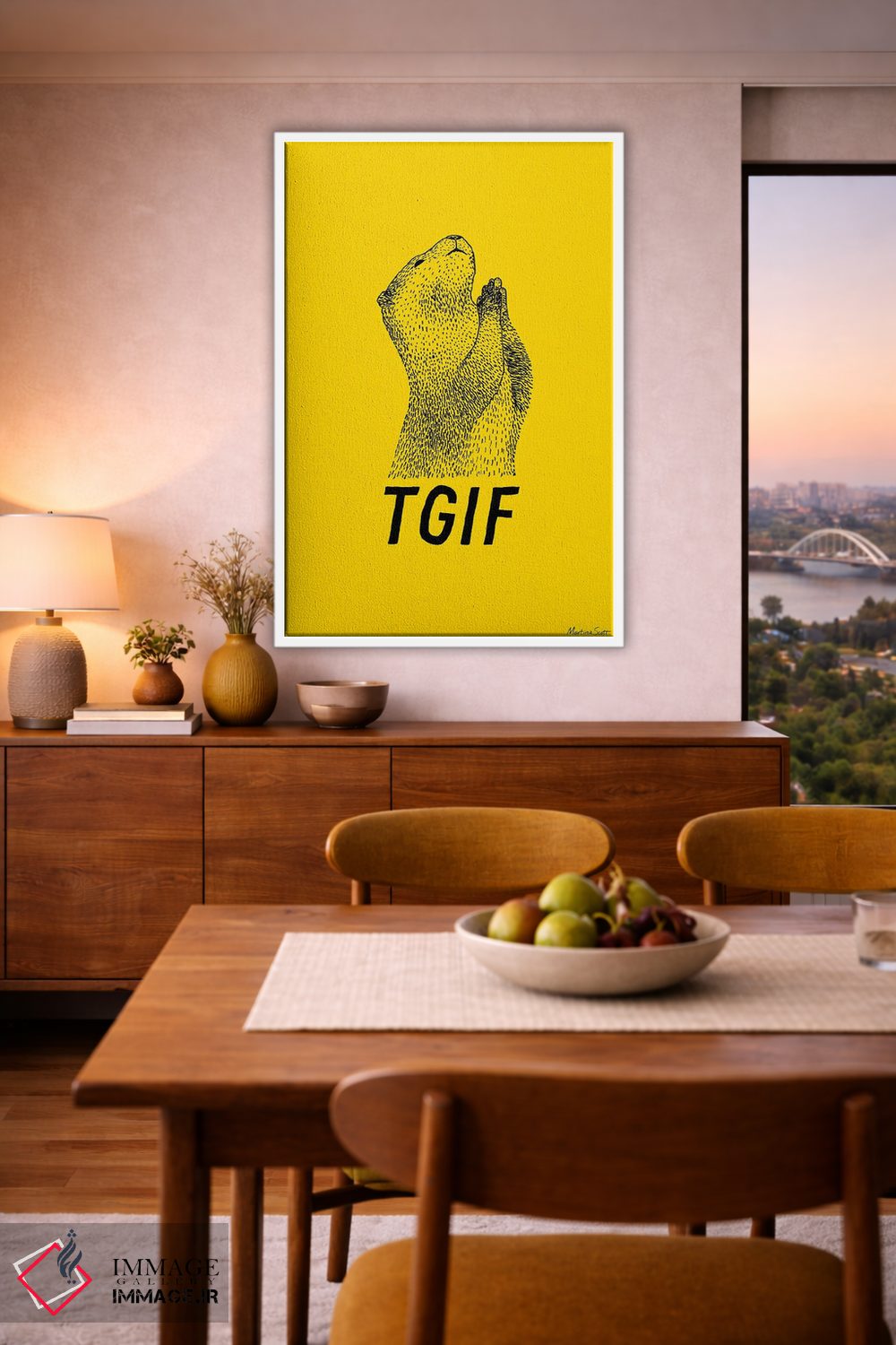 در «شکر که جمعه شد (TGIF: مخفف Thank God It's Friday)» اثرِ «مارتینا اسکات»، حضور حیوانات به فضا، گرمیِ ملایم اضافه میکند؛ برای فضاهای روستیک یا بوهو انتخابی خوشسلیقه است. برای دیوار گالریوار هم گزینهٔ خوبیست.