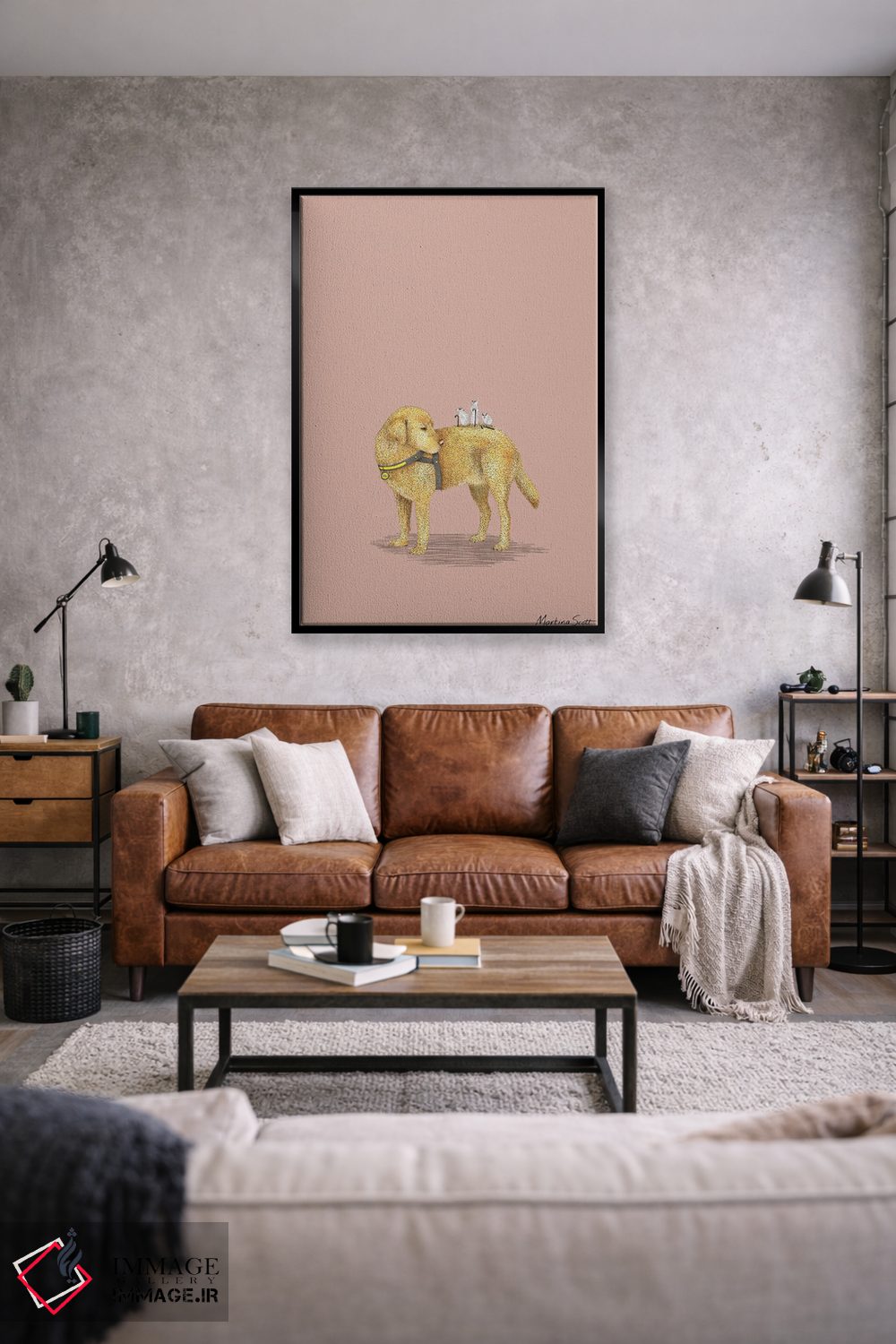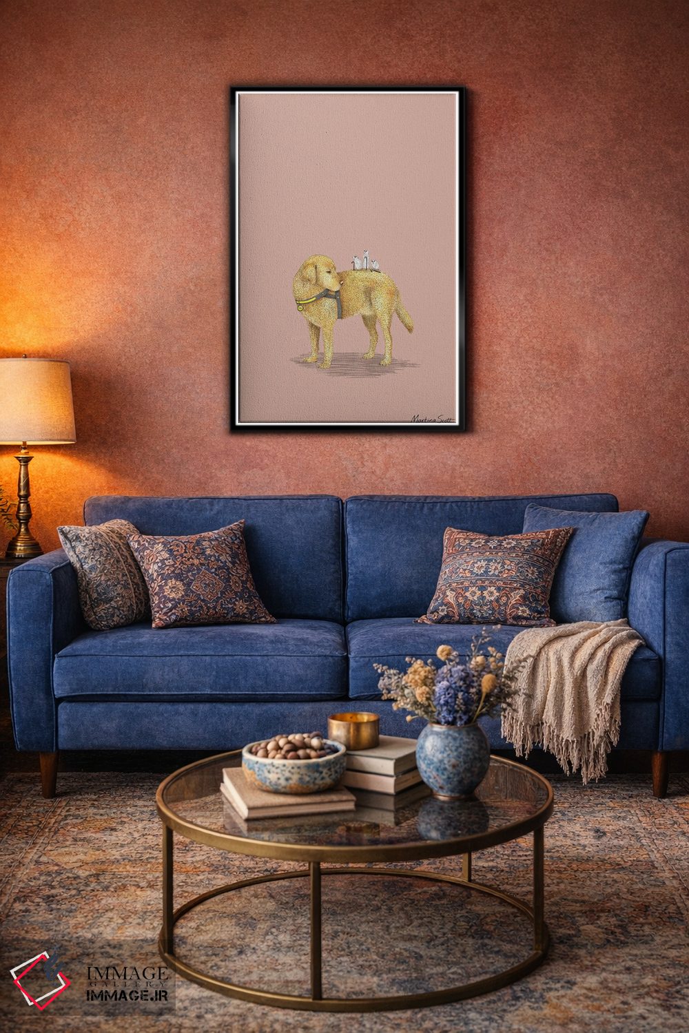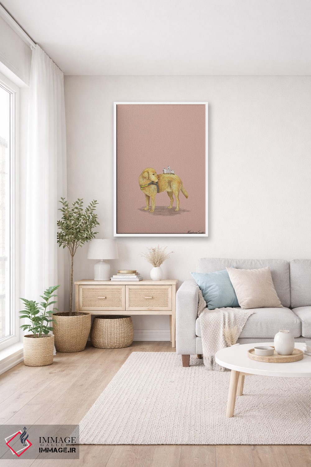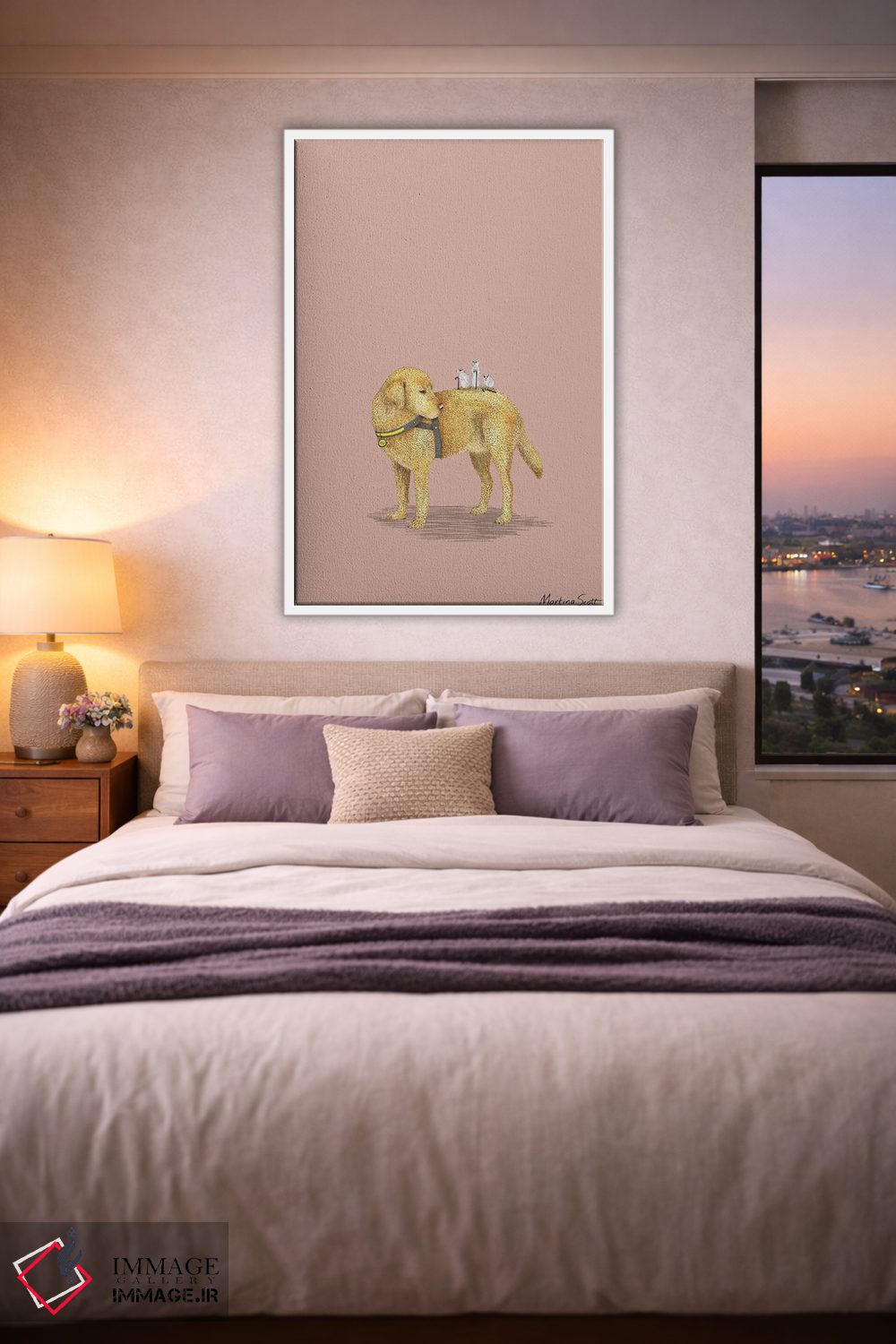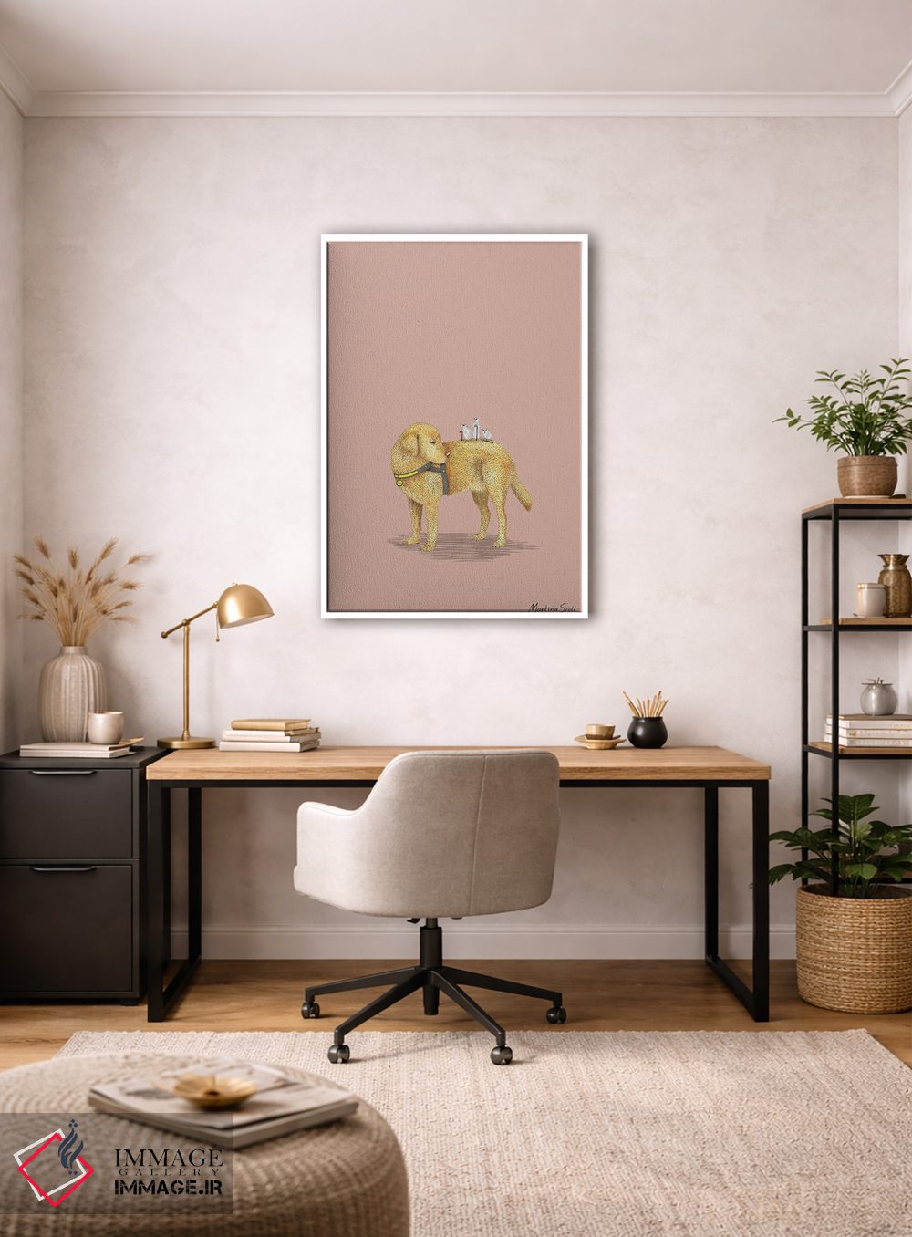 براساس پالت گرم اثر، قاب بلوط روشن (چوبی) پیشنهاد اول است و استخوانی ملایم مکمل. برای سفارشهای پروژهای با ابعاد و قابهای اختصاصی با ایماژ در تماس باشید.