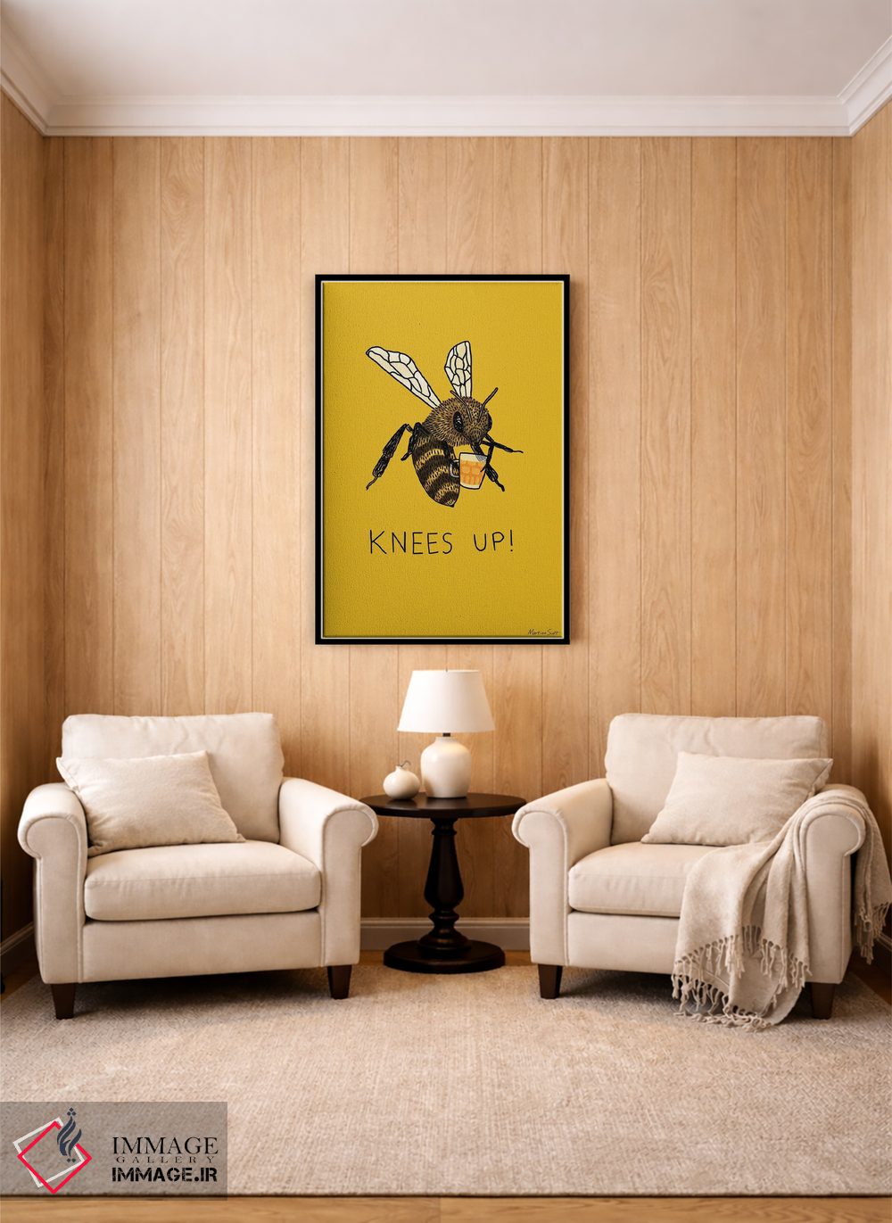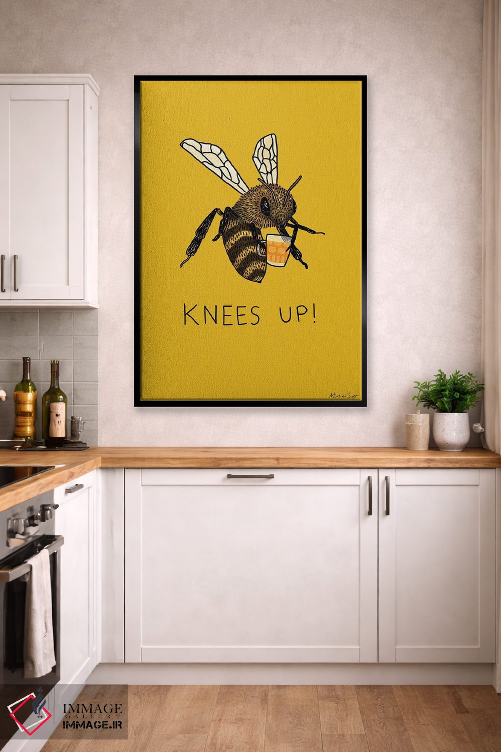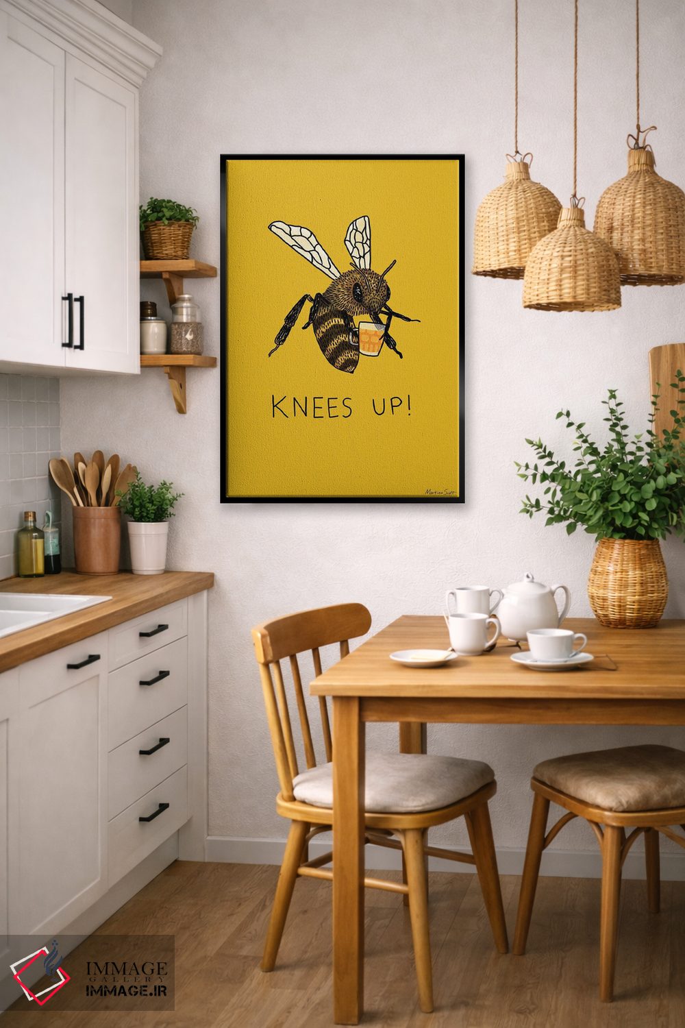 اگر میخواهید دیوار کمی سرزندگیِ محترمانه داشته باشد، «جشن زنبورها (اصطلاح؛ جشن و شادی)» اثرِ «مارتینا اسکات» به فضا، گرمیِ ملایم اضافه میکند، برای خانههایی با چوب و پارچههای گرم گزینهٔ مناسبیست. در کنار گیاهان و نور طبیعی، جذابتر هم میشود.