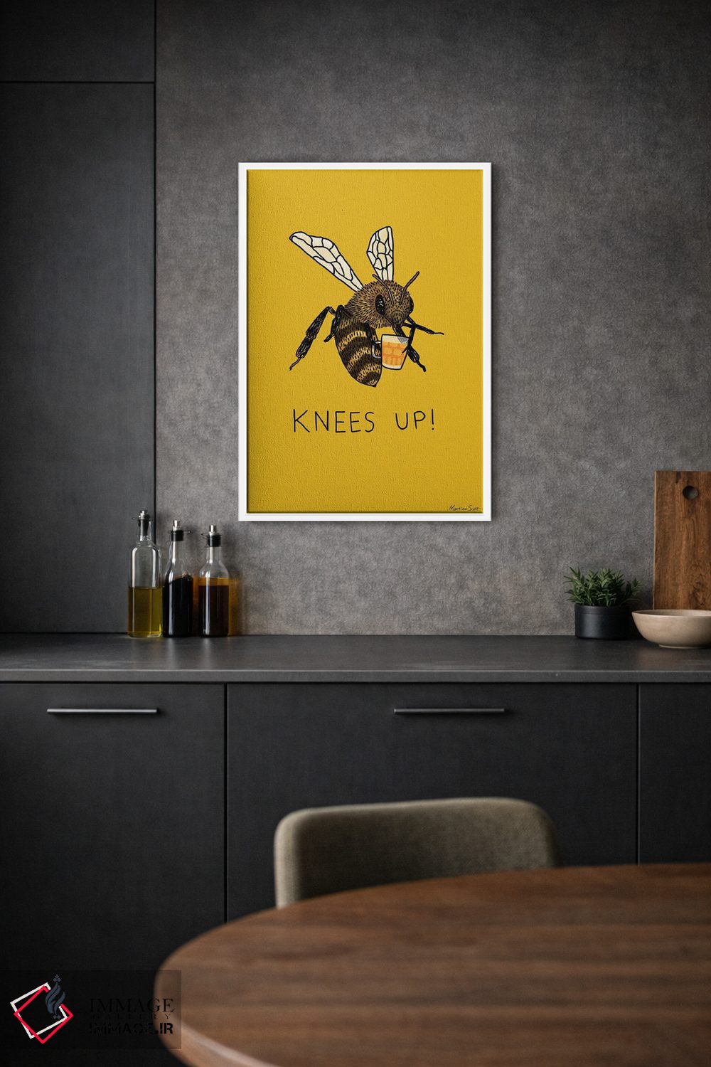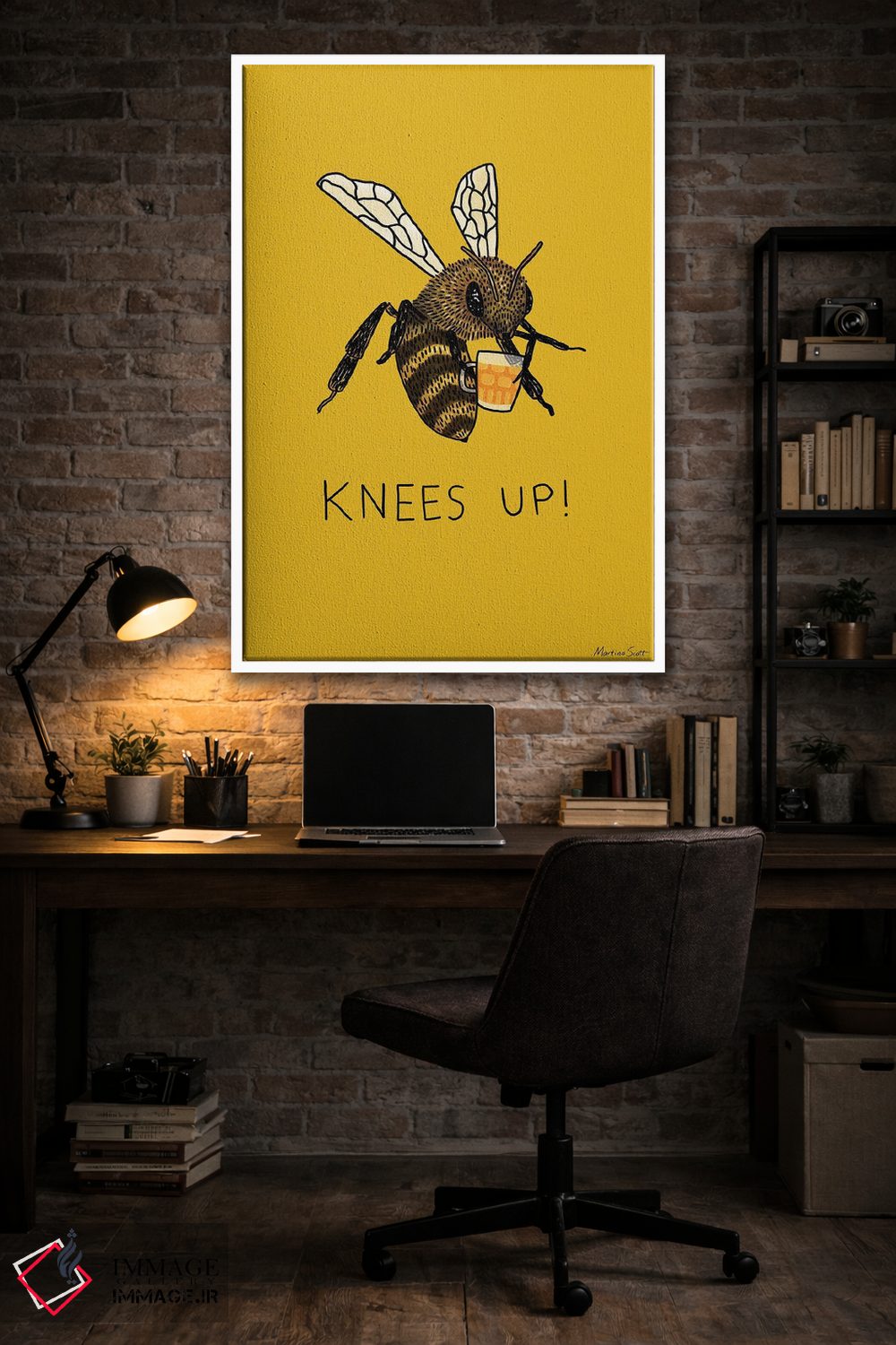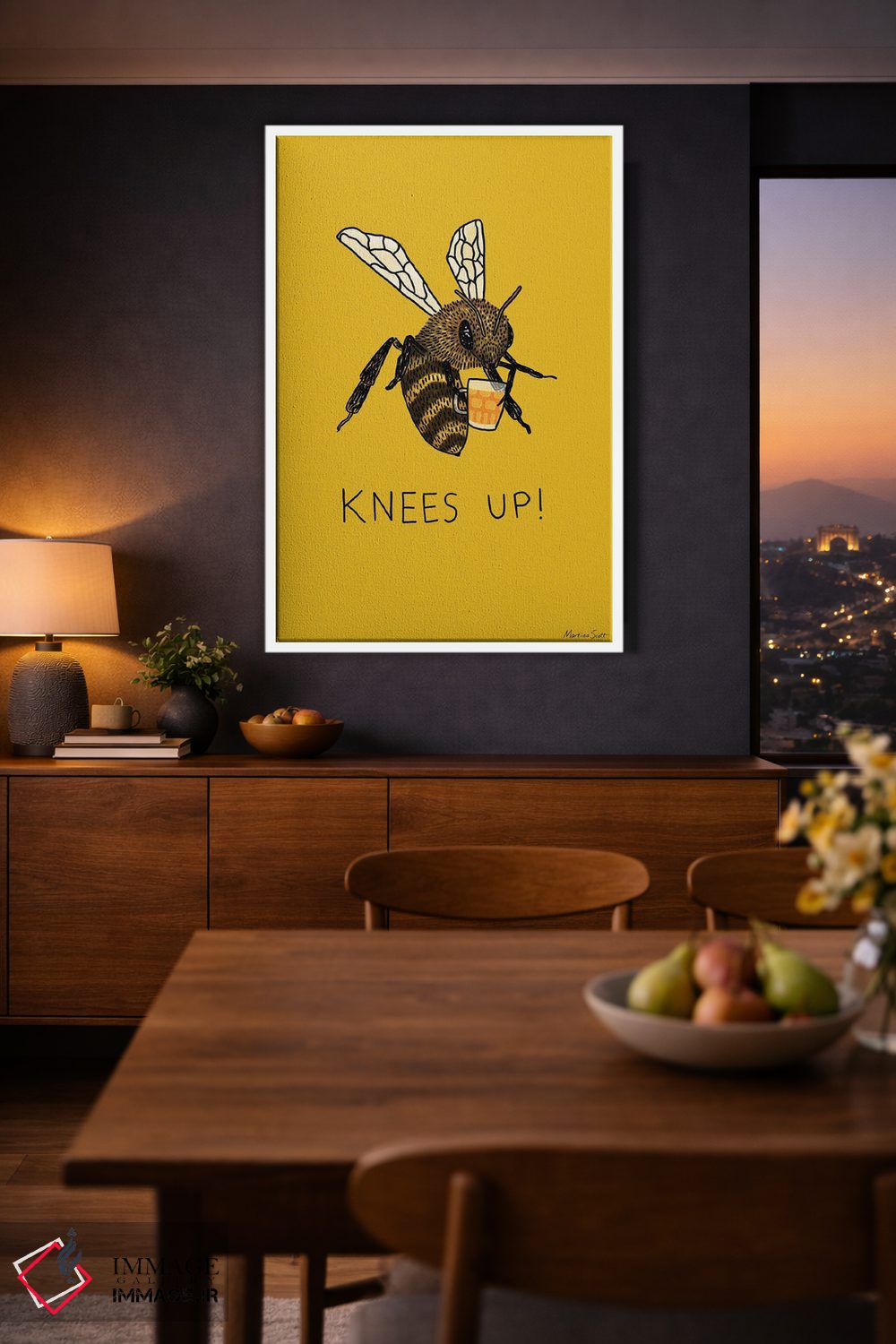 اگر میخواهید دیوار کمی سرزندگیِ محترمانه داشته باشد، «جشن زنبورها (اصطلاح؛ جشن و شادی)» اثرِ «مارتینا اسکات» به فضا، گرمیِ ملایم اضافه میکند، برای خانههایی با چوب و پارچههای گرم گزینهٔ مناسبیست. در کنار گیاهان و نور طبیعی، جذابتر هم میشود.