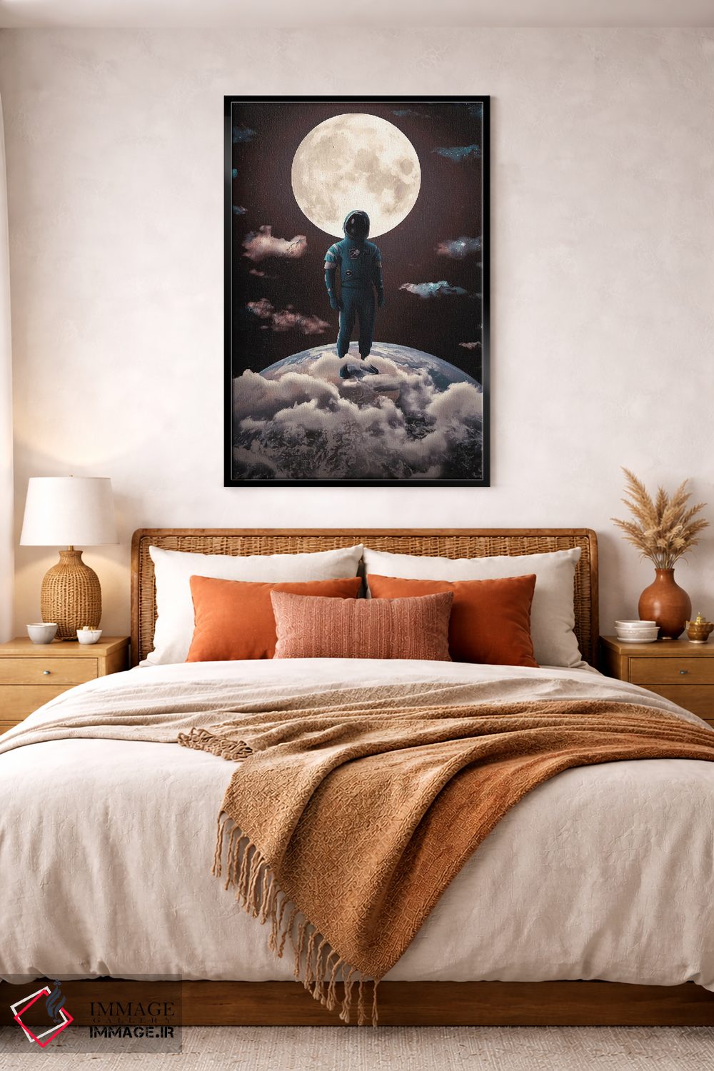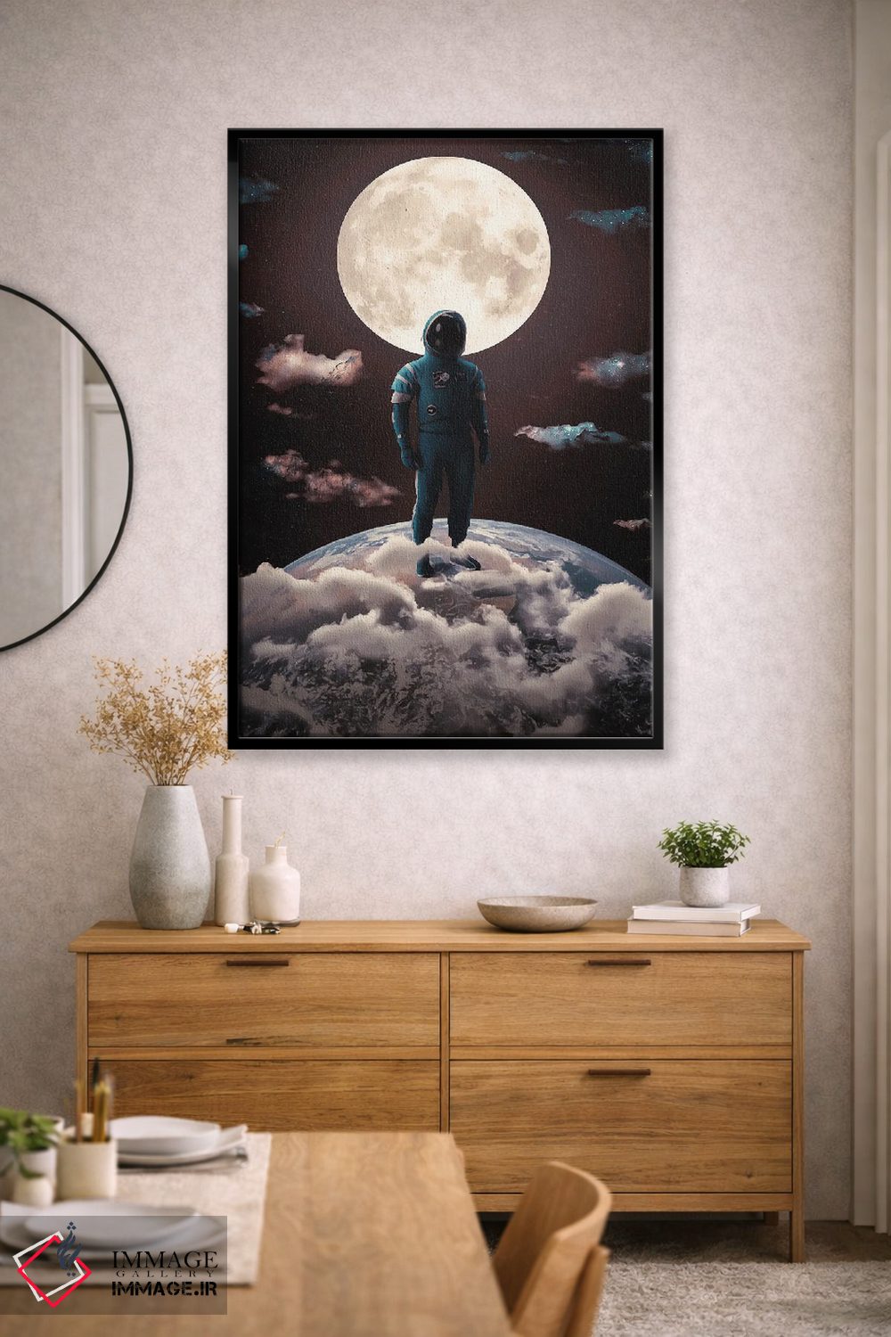 براساس پالت گرم اثر، قاب بلوط روشن (چوبی) پیشنهاد اول است و استخوانی ملایم مکمل. برای سفارشهای پروژهای با ابعاد و قابهای اختصاصی با ایماژ در تماس باشید.