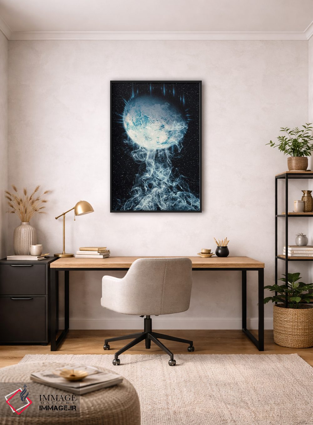 براساس پالت سرد اثر، قاب سفید مات (فریم باریک) پیشنهاد اول است و نقرهای برسخورده (متالیک) مکمل. برای سفارشهای پروژهای با ابعاد و قابهای اختصاصی با ایماژ در تماس باشید.