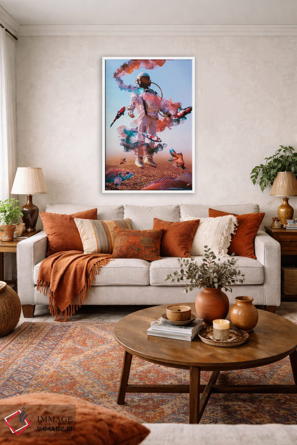 طراحی بوم گالری ایماژ بهگونهای است که اثر روی دیوار «پرداختشده» و حرفهای دیده شود—نه پرزرقوبرقِ بیپایه؛ بلکه دقیق و خوشپرداخت. بافت ظریف کنواس باعث میشود حس اثر هنری را در نگاه نزدیک نگه میدارد. چاپ جیکلی (Giclée) کمک میکند برای آرتپرینتهای جدی استاندارد رایج است بدون اغراق؛ فقط دقیقتر. حاصل کار، یک تابلو خوشنشین است که هم از دور اثرگذار است و هم از نزدیک خوشخوان؛ و اگر بخواهید، میتوان چیدمان را برای گالریوال هم پیشنهاد داد. همراهِ چوب و متریالهای طبیعی، بافت کنواس دلنشینتر دیده میشود.
