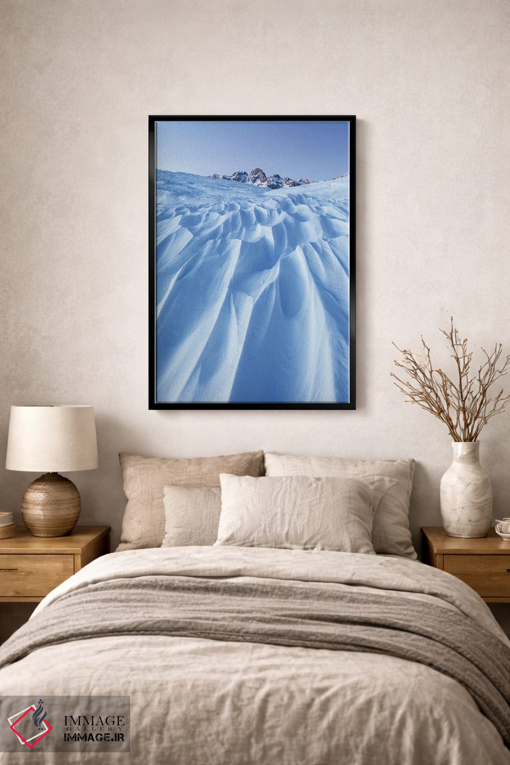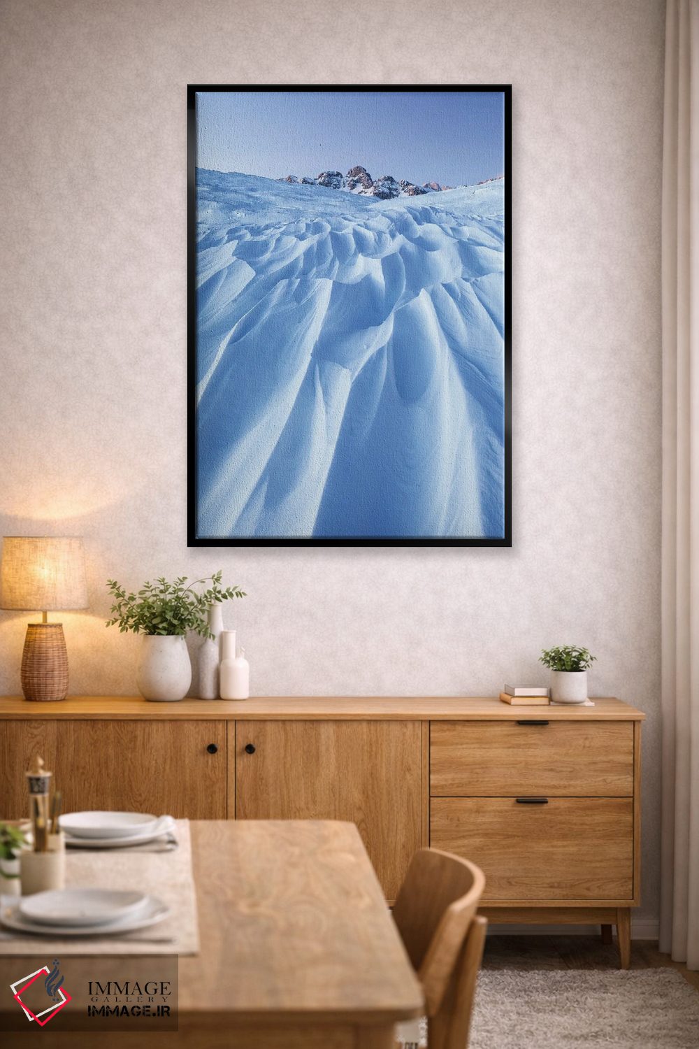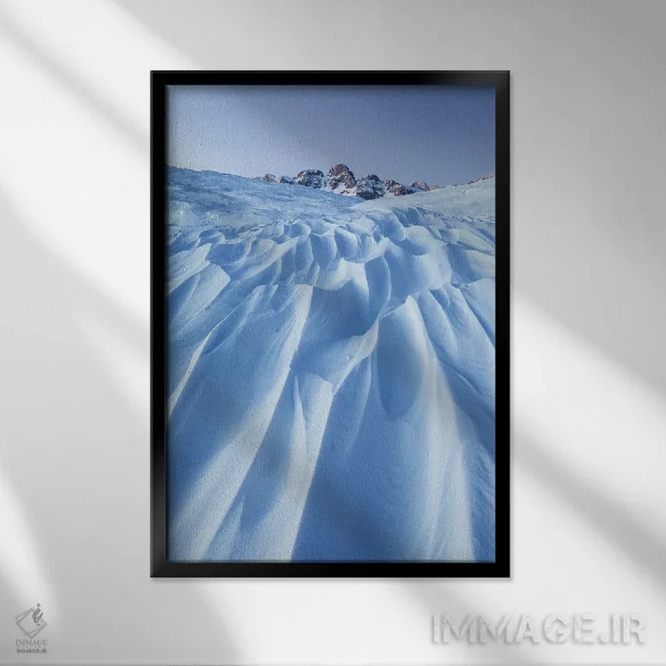 براساس پالت سرد اثر، قاب سفید مات (فریم باریک) پیشنهاد اول است و نقرهای برسخورده (متالیک) مکمل. برای سفارشهای پروژهای با ابعاد و قابهای اختصاصی با ایماژ در تماس باشید.
