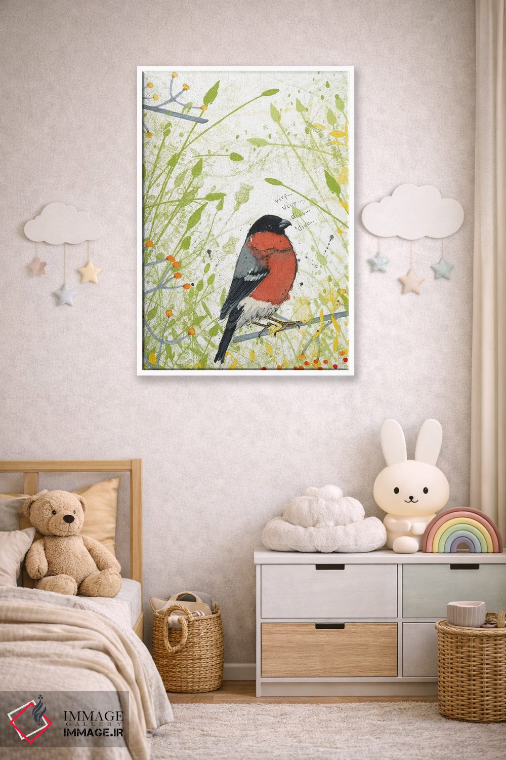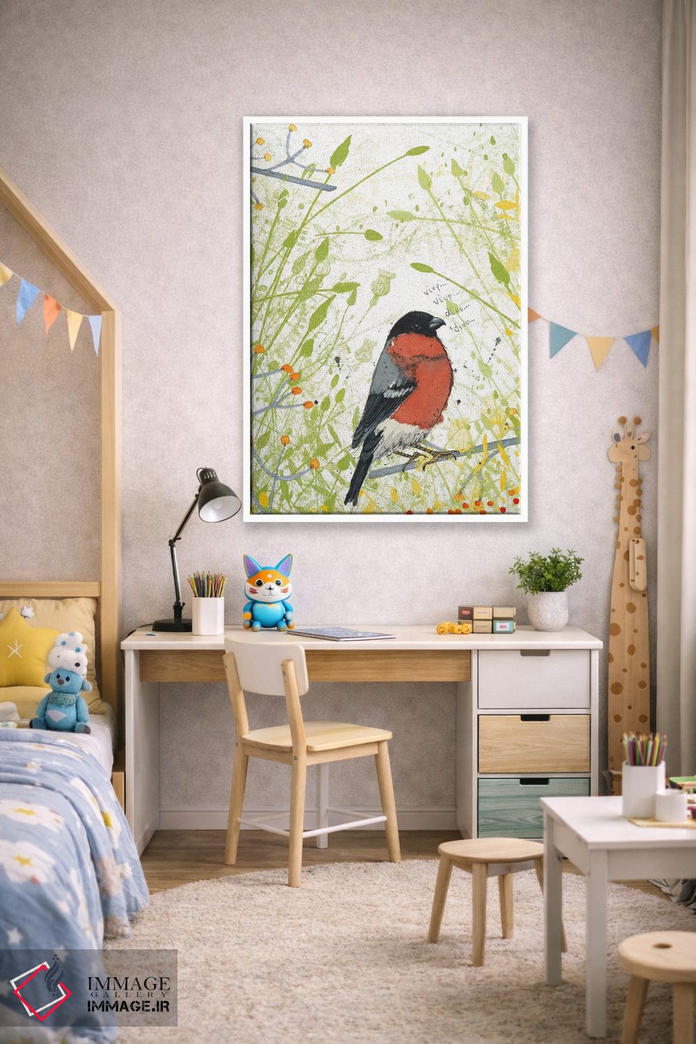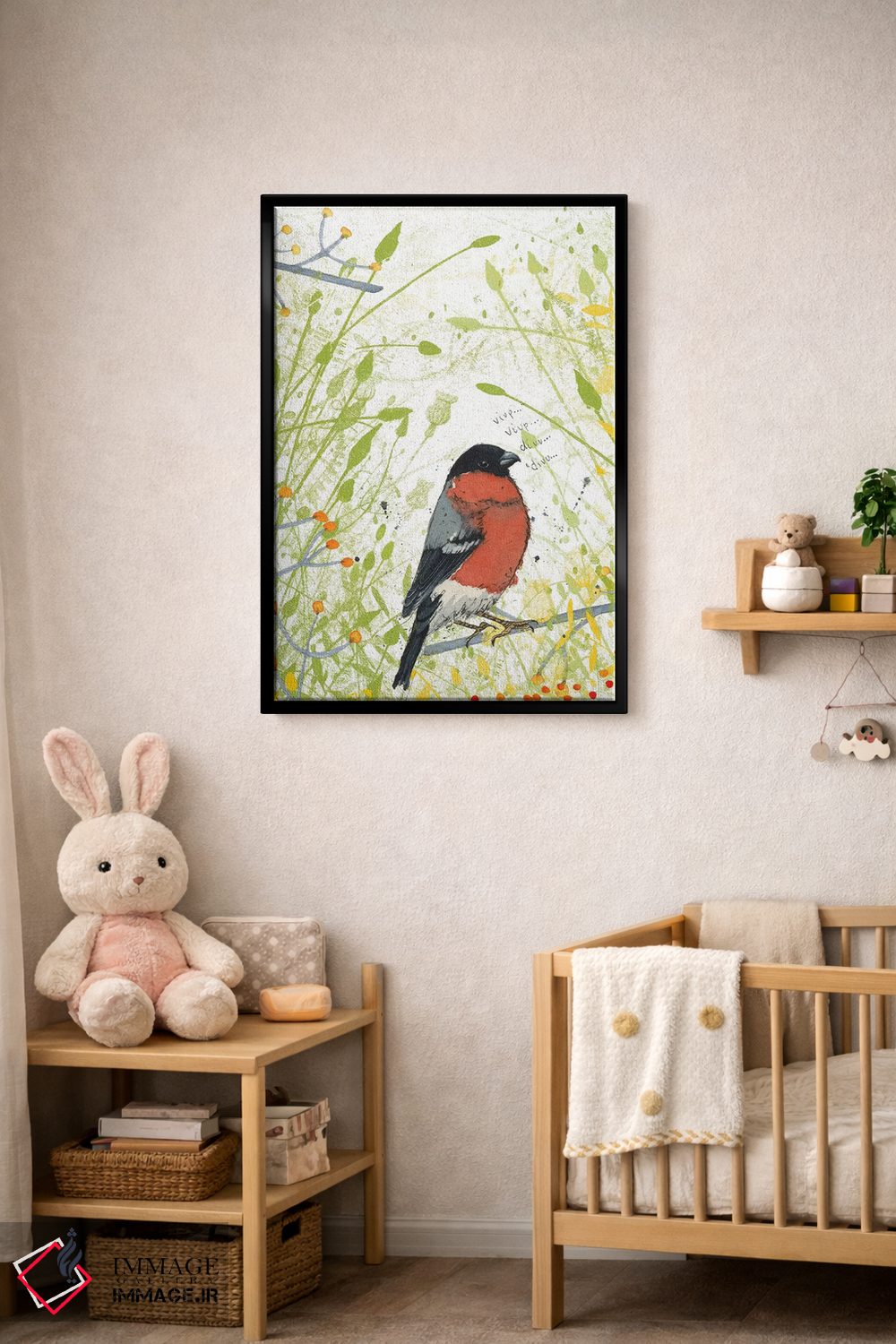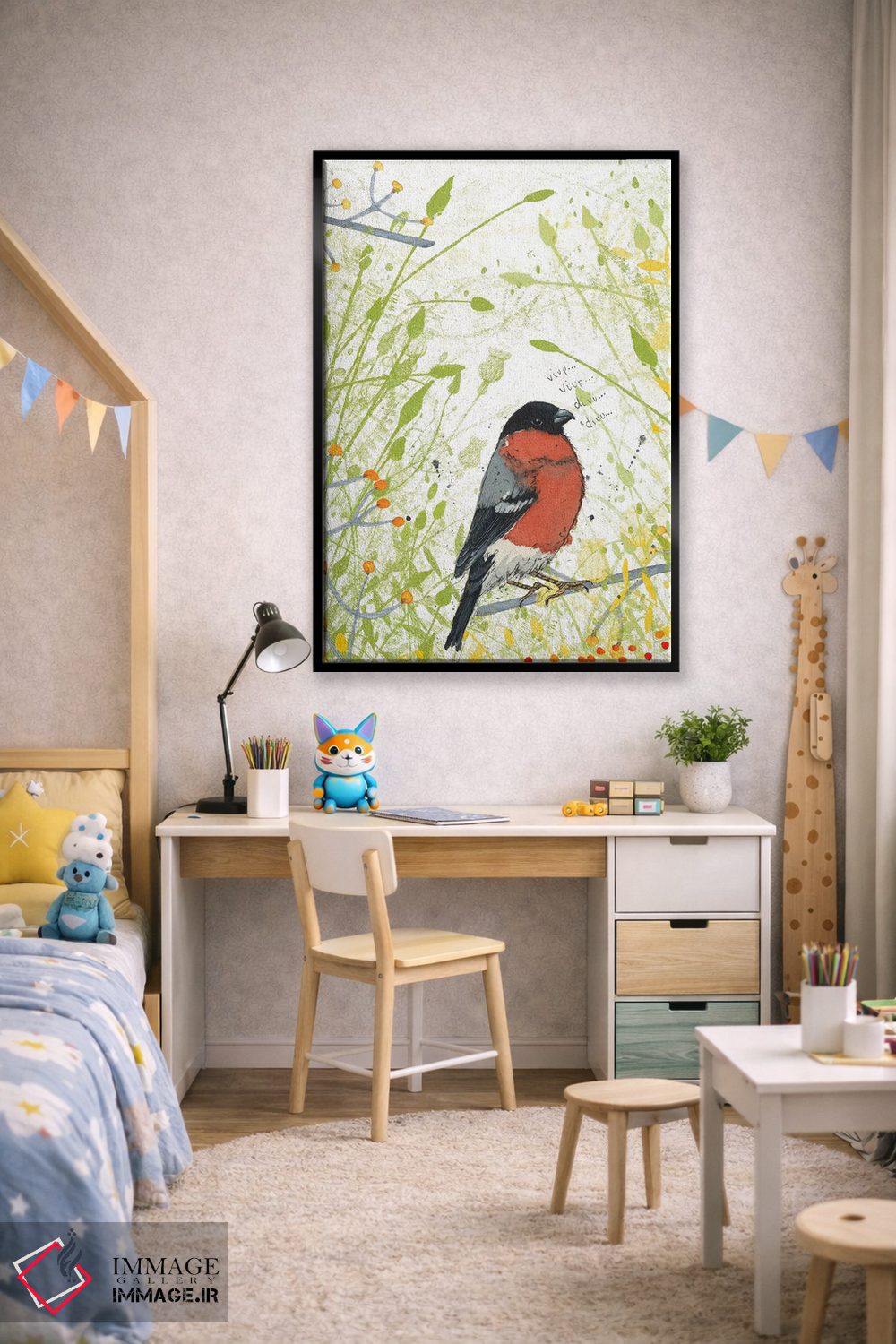 در «فنچ سینهسرخ (Bullfinch)» اثرِ «میشل کمپل»، حضور حیوانات یک لبخند ریز به چیدمان میدهد؛ برای اتاق بازی یا گوشهٔ مطالعه انتخابی خوشسلیقه است. به دیوار، قصه میدهد—اما قصهای آرام و شیک.
