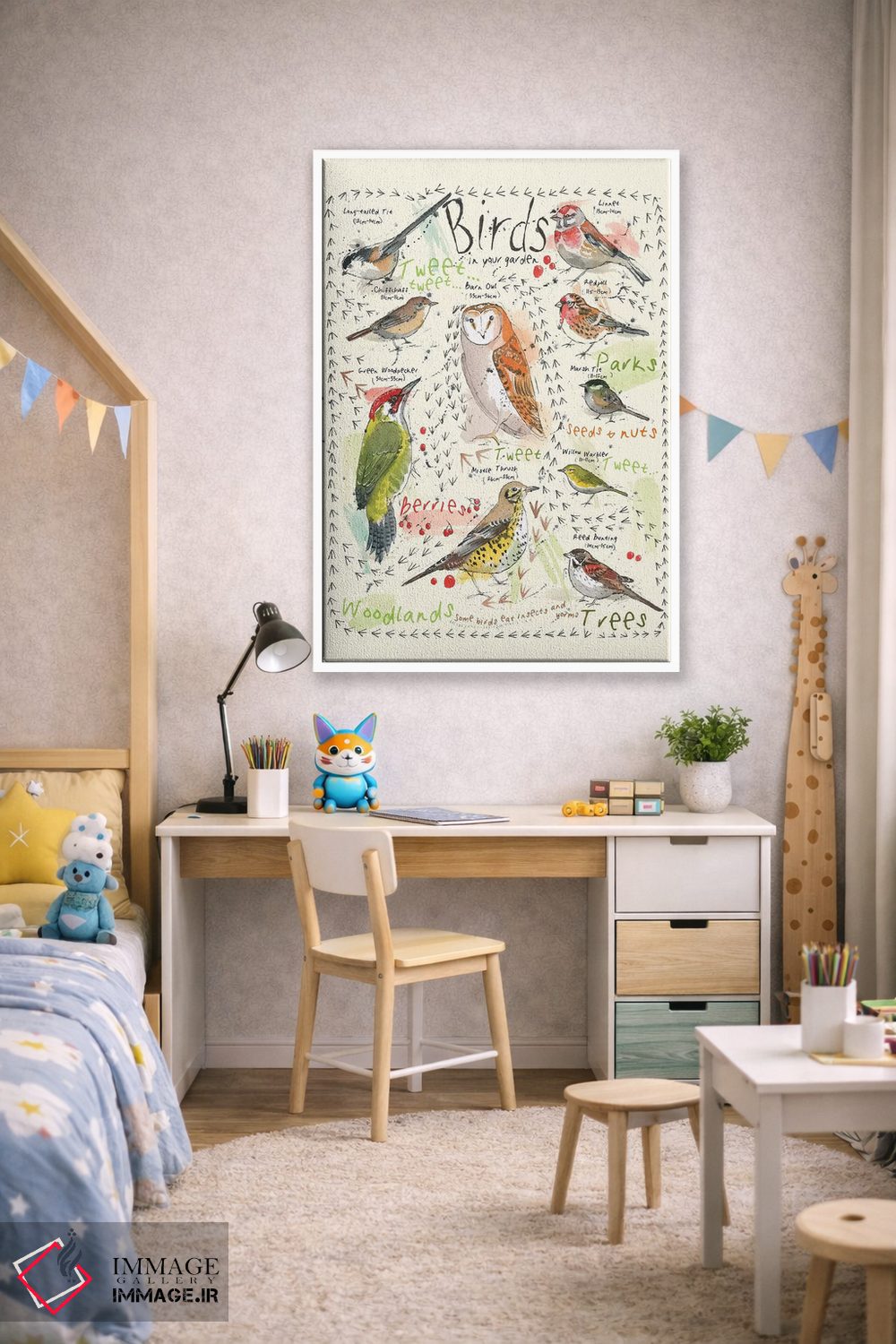 برای اتاقی که به یک عنصر دوستداشتنی نیاز دارد، «پرندگان در باغ شما ۳» اثرِ «میشل کمپل» یک لبخند ریز به چیدمان میدهد؛ برای اتاق کودک (بدون لحن کودکانه) انتخابی خوشسلیقه است. هر بار نگاهش میکنید، یک جزئیات تازه به چشم میآید.