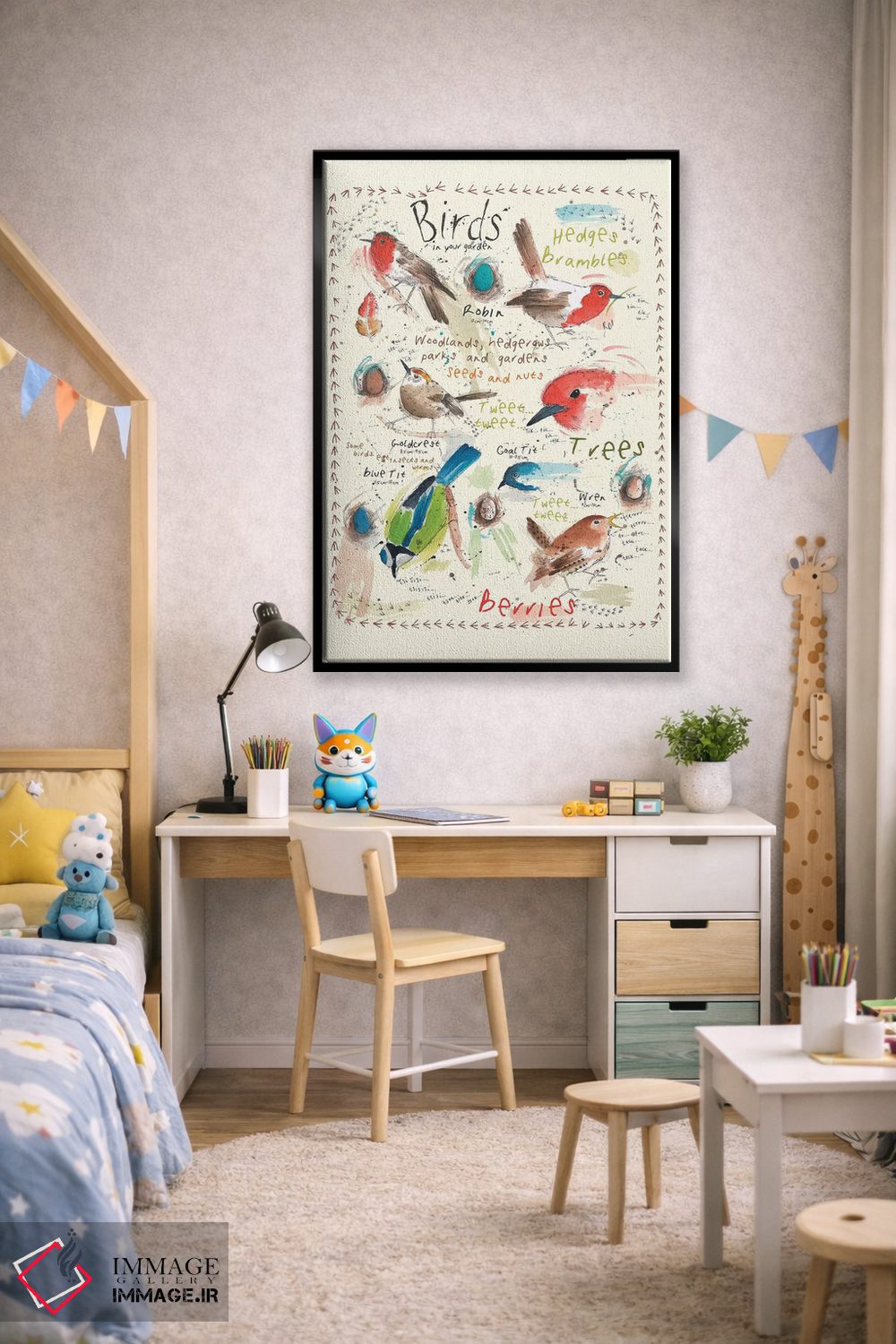 در «پرندگان در باغ شما ۴» اثرِ «میشل کمپل»، حضور حیوانات بافت و جزئیات را طوری نشان میدهد که نگاه میماند؛ برای نشیمنهای خانوادگی انتخابی خوشسلیقه است. با قاب چوبی یا مشکی، حس مرتبتری پیدا میکند.