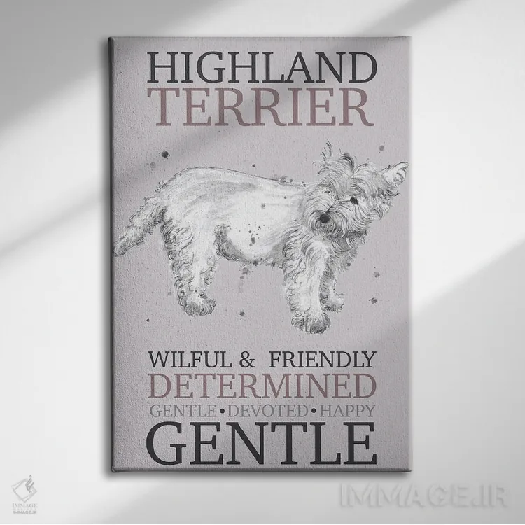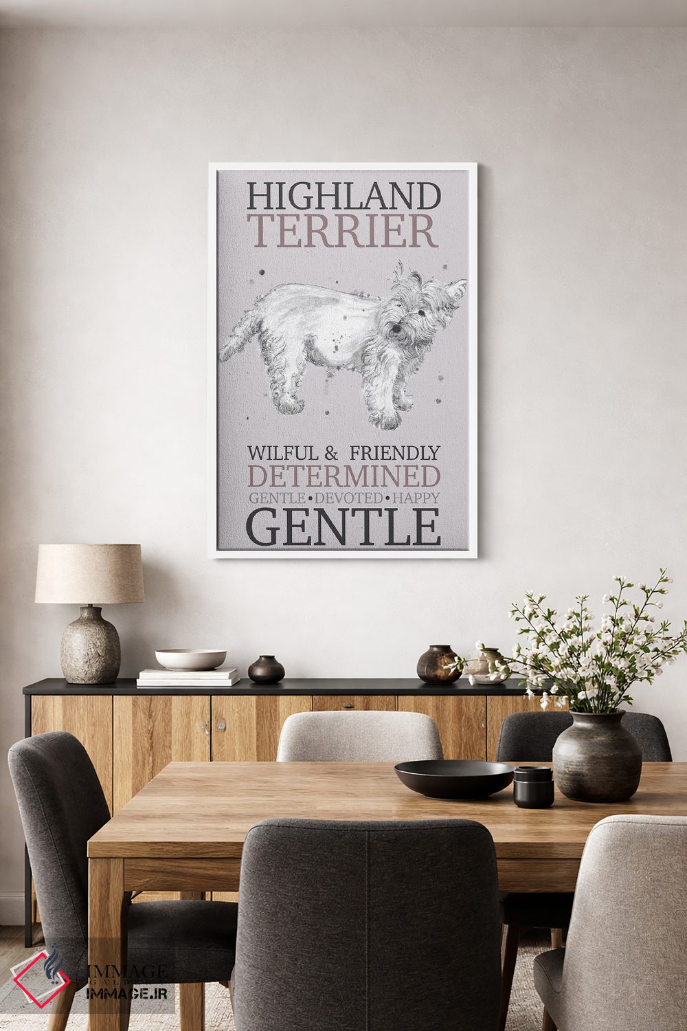برای دیوارهای ساده، «ویژگیهای سگ هایلند تریر» اثرِ «میشل کمپل» برای دکورهای مینیمال، یک نقطهٔ توجه میسازد؛ برای خانههایی با چوب و پارچههای گرم انتخابی خوشسلیقه است. با قاب چوبی یا مشکی، حس مرتبتری پیدا میکند.