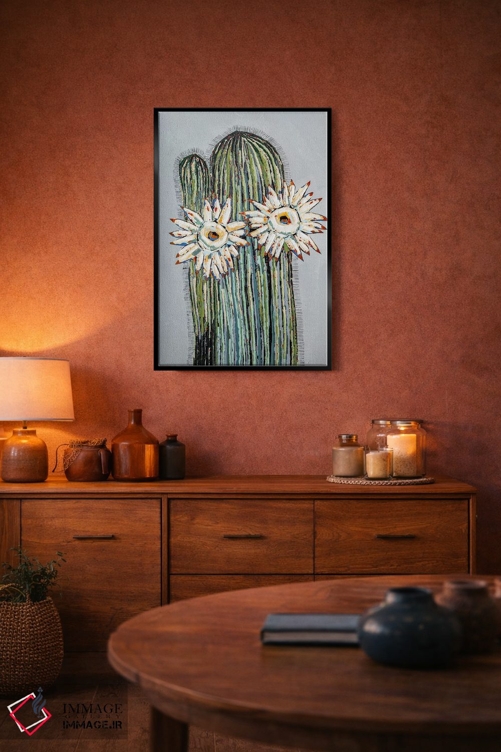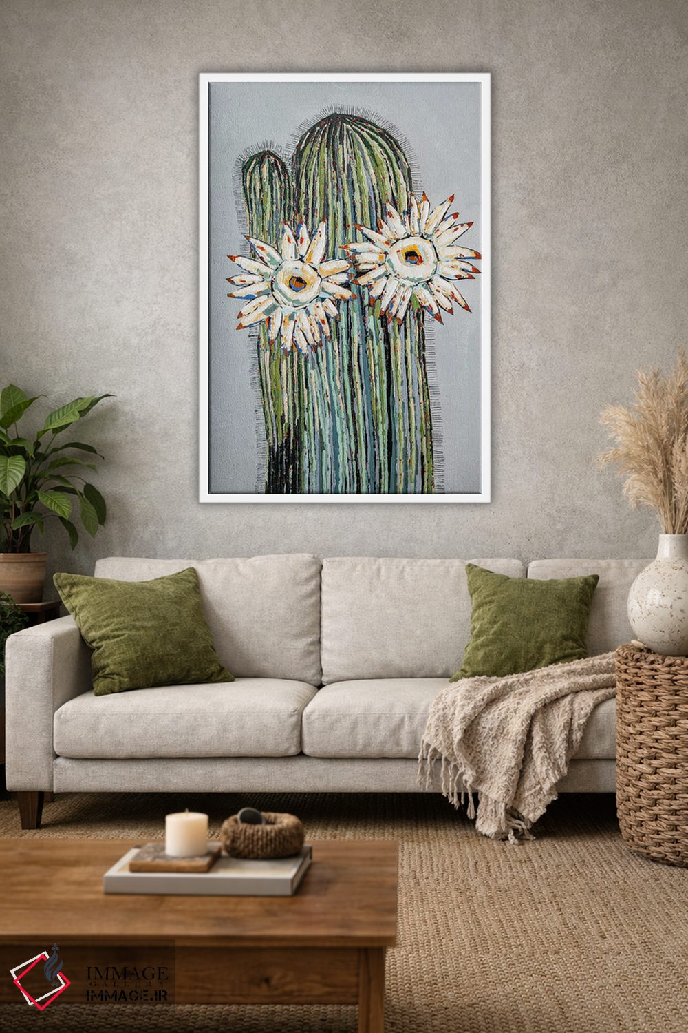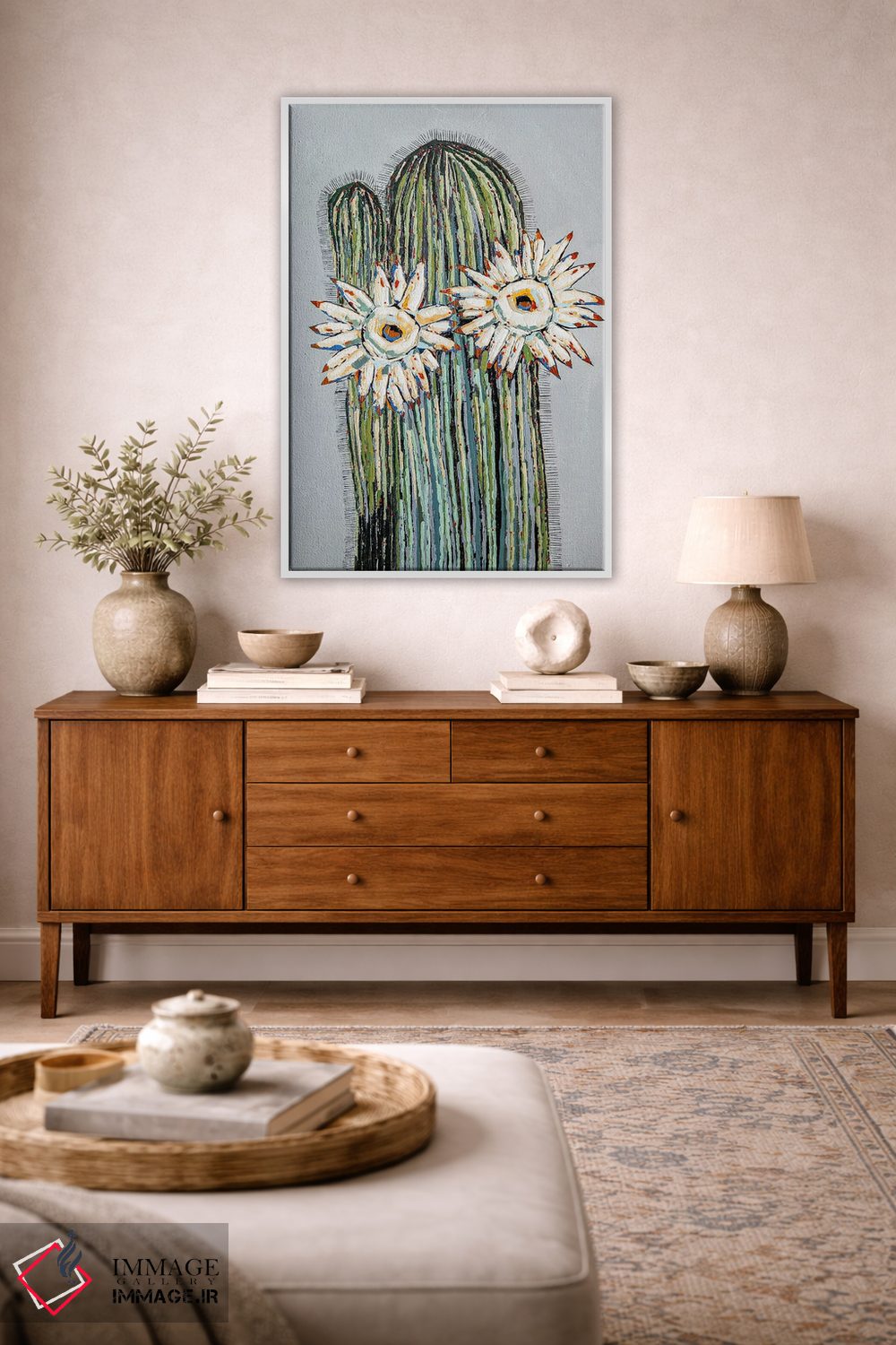 براساس پالت ترکیبی اثر، قاب بلوط روشن (چوبی) پیشنهاد اول است و استخوانی ملایم مکمل. برای سفارشهای پروژهای با ابعاد و قابهای اختصاصی با ایماژ در تماس باشید.