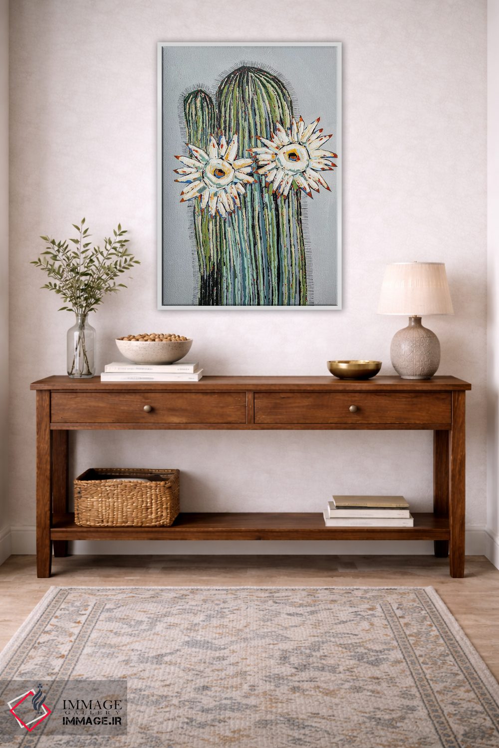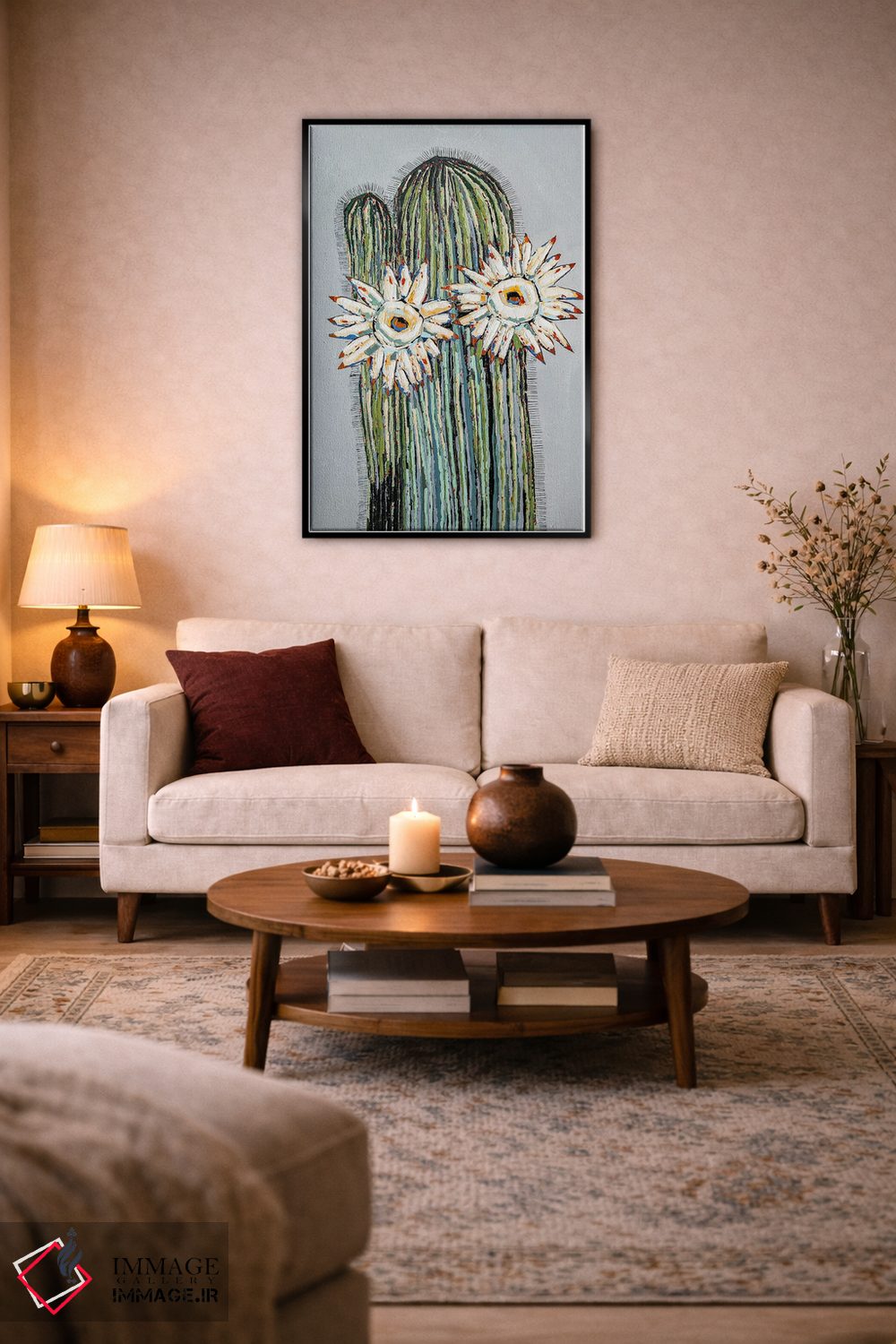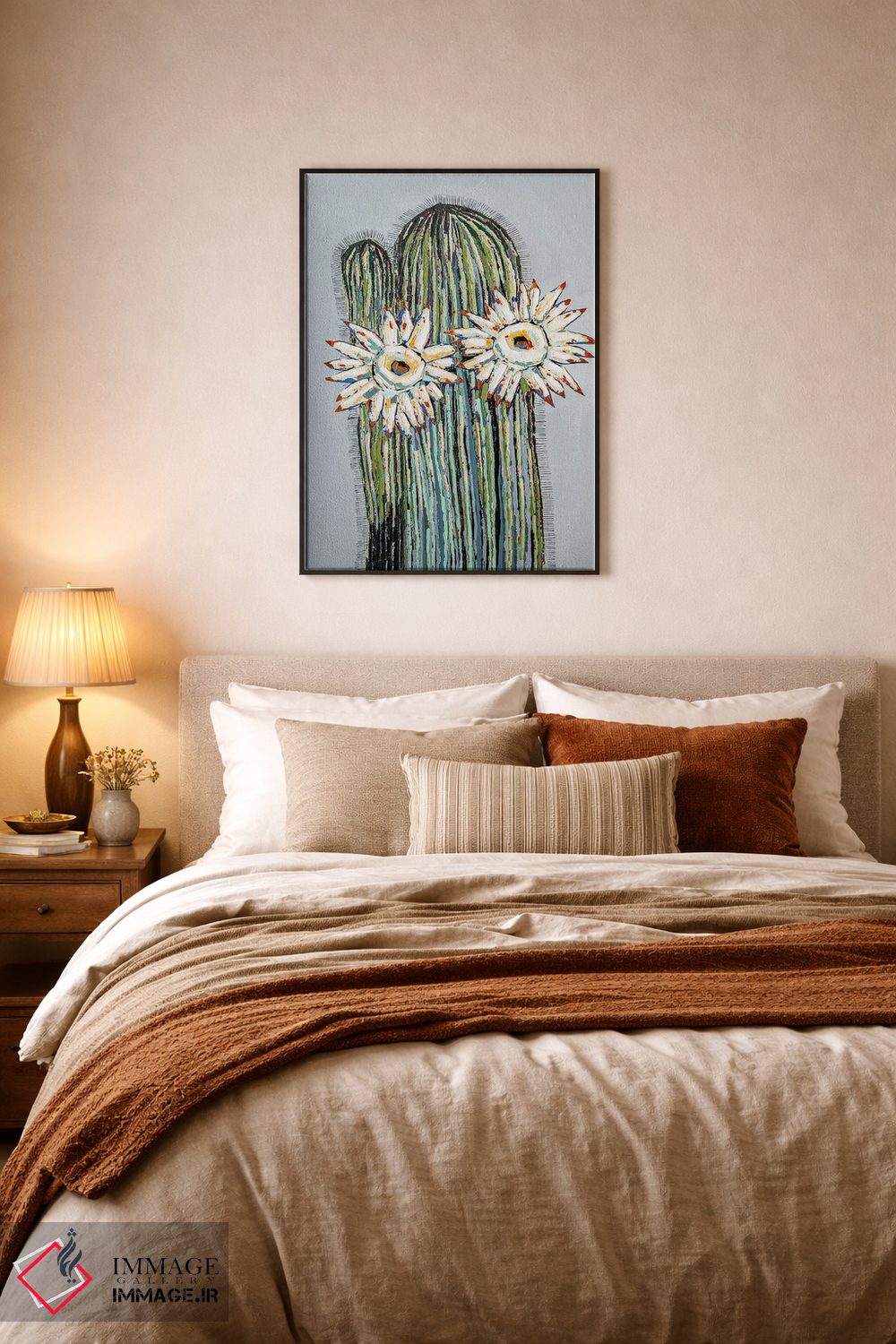 براساس پالت ترکیبی اثر، قاب بلوط روشن (چوبی) پیشنهاد اول است و استخوانی ملایم مکمل. برای سفارشهای پروژهای با ابعاد و قابهای اختصاصی با ایماژ در تماس باشید.
