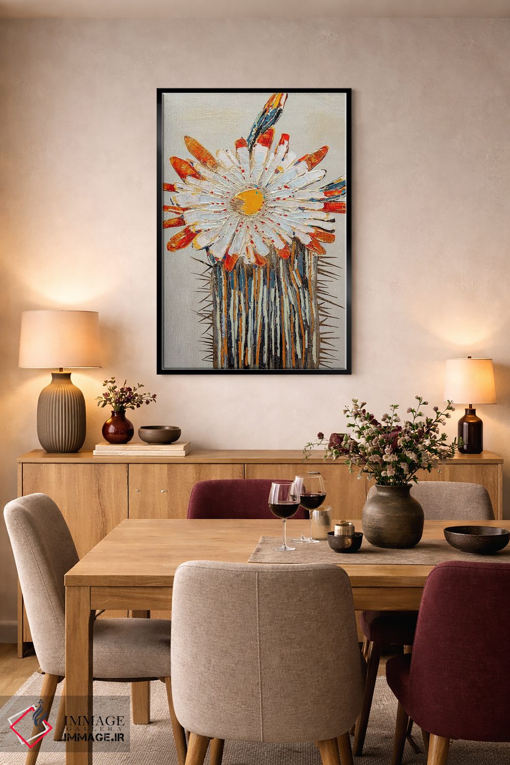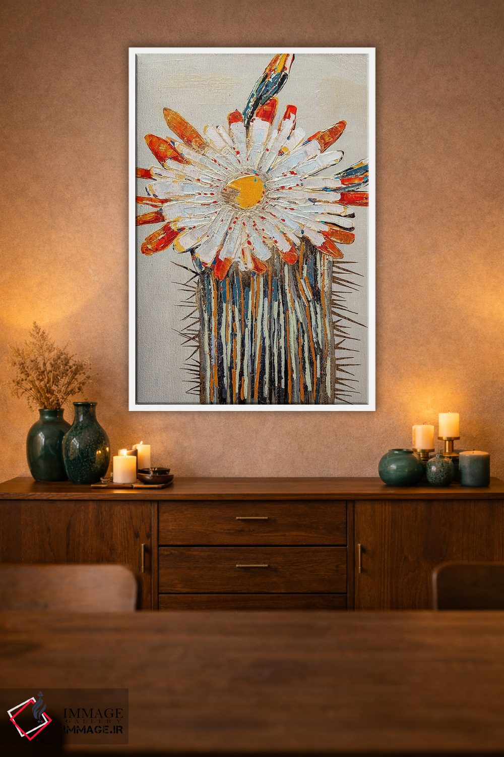 براساس پالت گرم اثر، قاب تیک گرم (چوبی) پیشنهاد اول است و مشکی مات (فریم متوسط) مکمل. برای سفارشهای پروژهای با ابعاد و قابهای اختصاصی با ایماژ در تماس باشید.