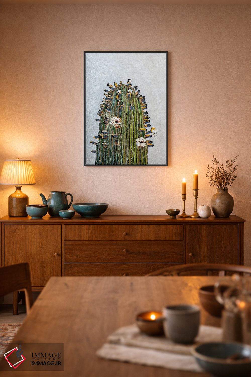 براساس پالت ترکیبی اثر، قاب تیک گرم (چوبی) پیشنهاد اول است و مشکی مات (فریم متوسط) مکمل. برای سفارشهای پروژهای با ابعاد و قابهای اختصاصی با ایماژ در تماس باشید.