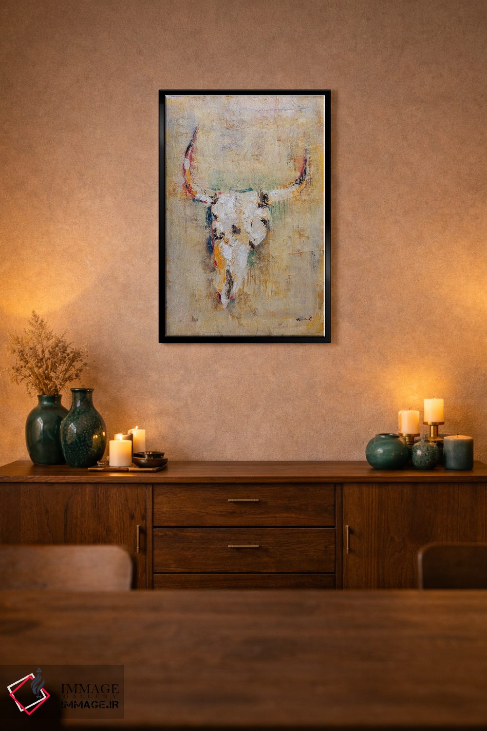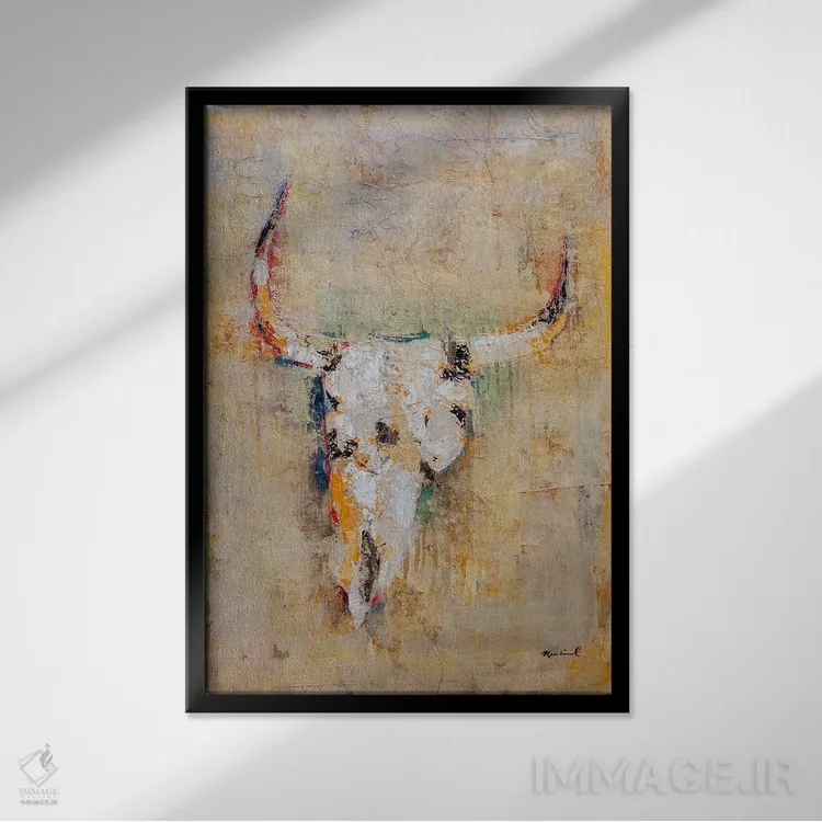 براساس پالت گرم اثر، قاب بلوط روشن (چوبی) پیشنهاد اول است و استخوانی ملایم مکمل. برای سفارشهای پروژهای با ابعاد و قابهای اختصاصی با ایماژ در تماس باشید.