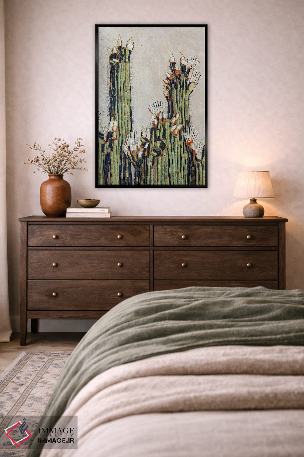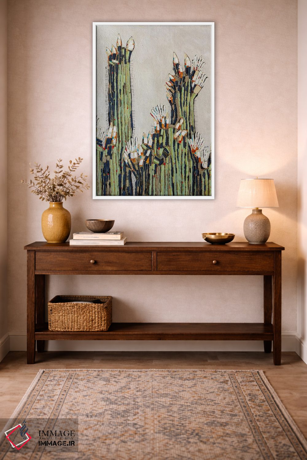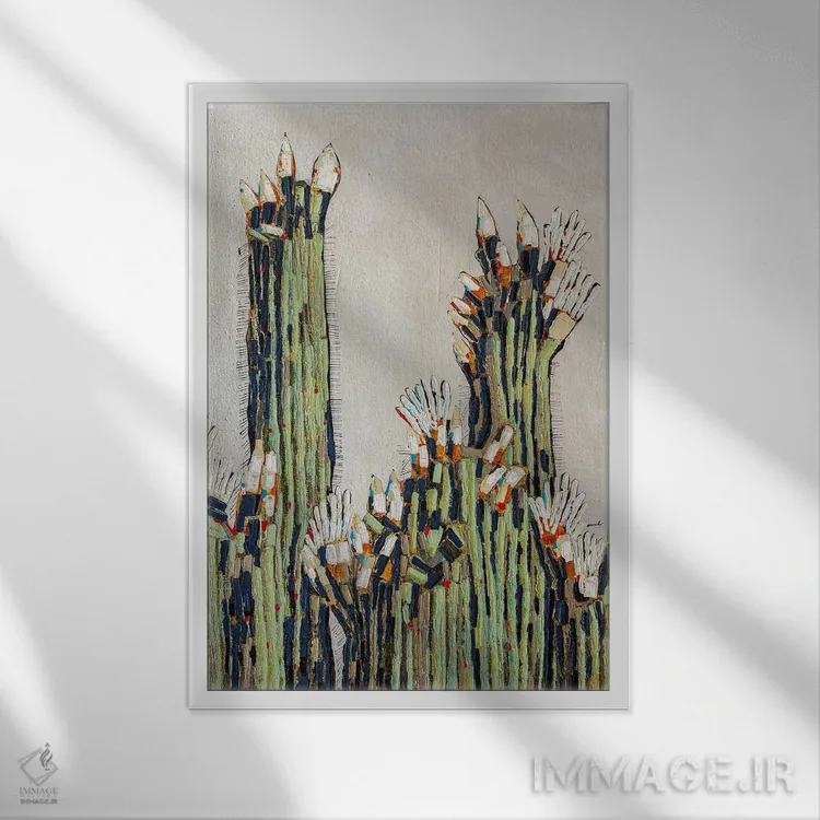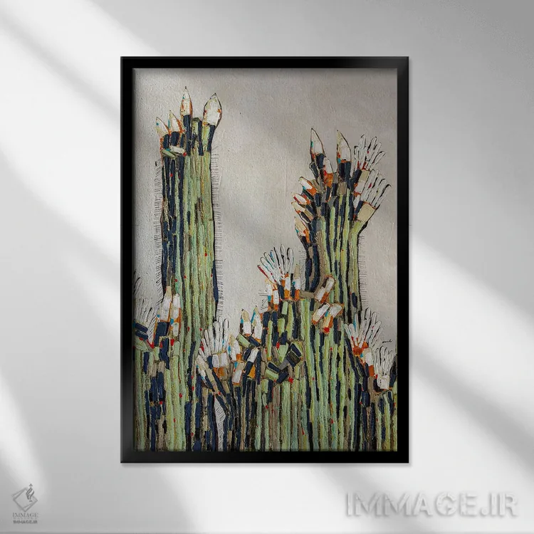 براساس پالت ترکیبی اثر، قاب بلوط روشن (چوبی) پیشنهاد اول است و استخوانی ملایم مکمل. برای سفارشهای پروژهای با ابعاد و قابهای اختصاصی با ایماژ در تماس باشید.