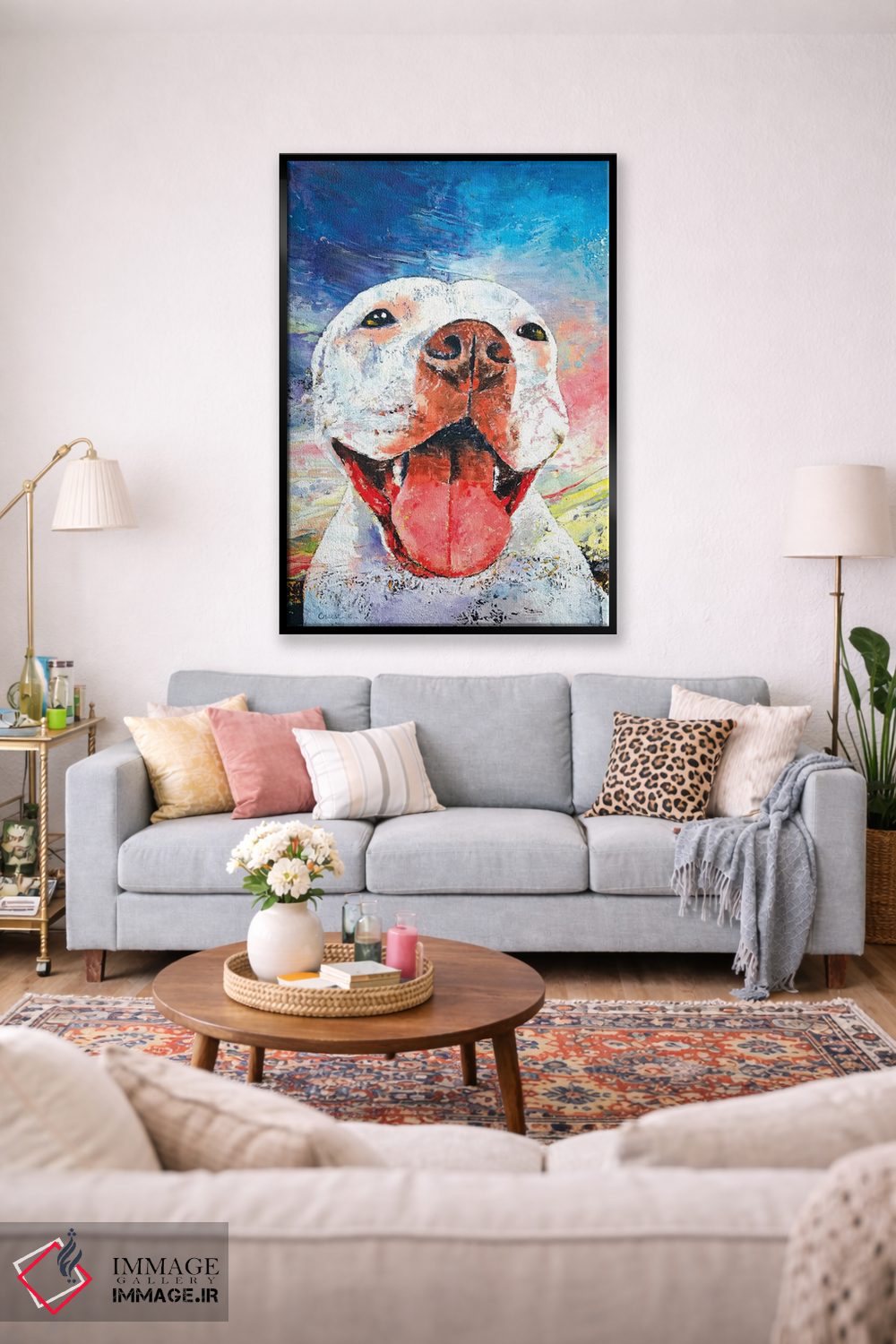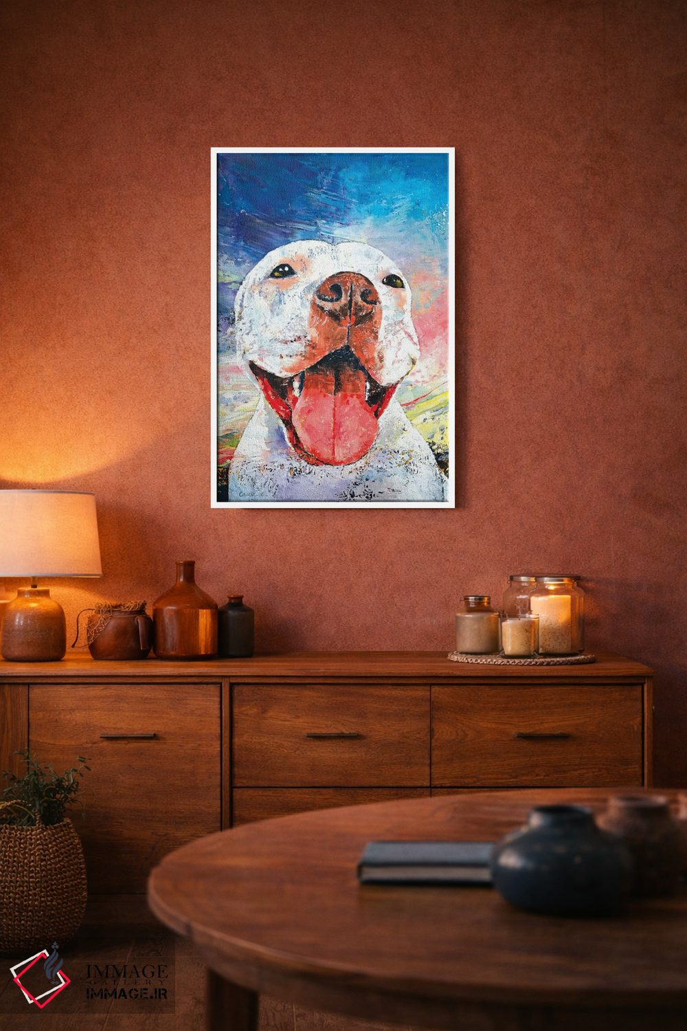 اگر به آثار حیوانات علاقه دارید، «پیت بول» اثرِ «مایکل کریس» در کنار رنگهای خنثی، تضاد دلچسبی میسازد، برای دیوار کنار میز کار گزینهٔ مناسبیست. هر بار نگاهش میکنید، یک جزئیات تازه به چشم میآید.