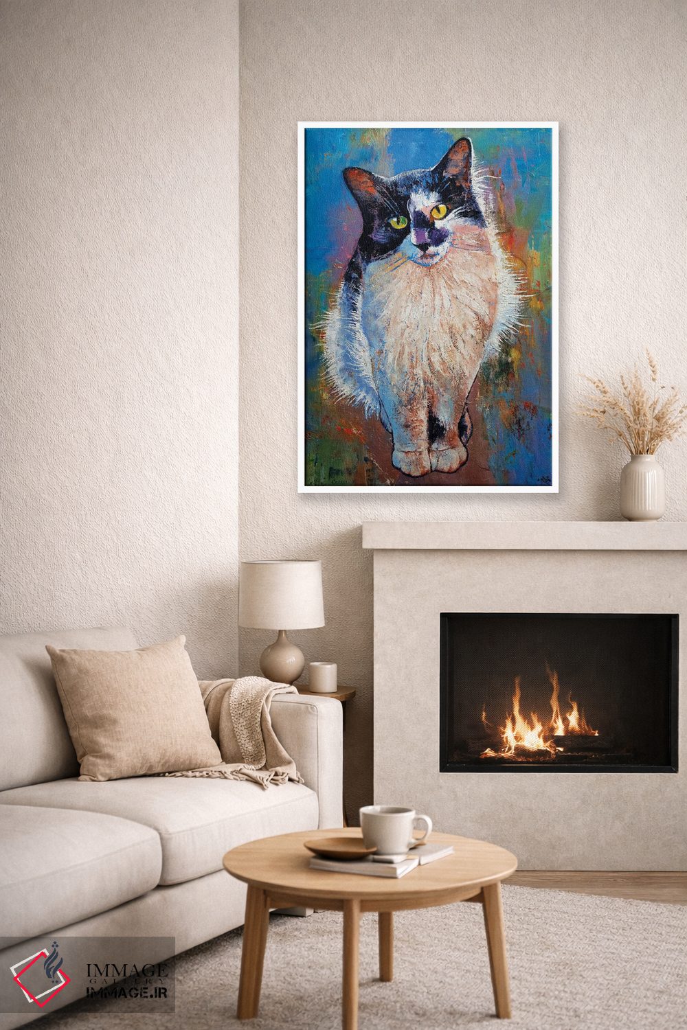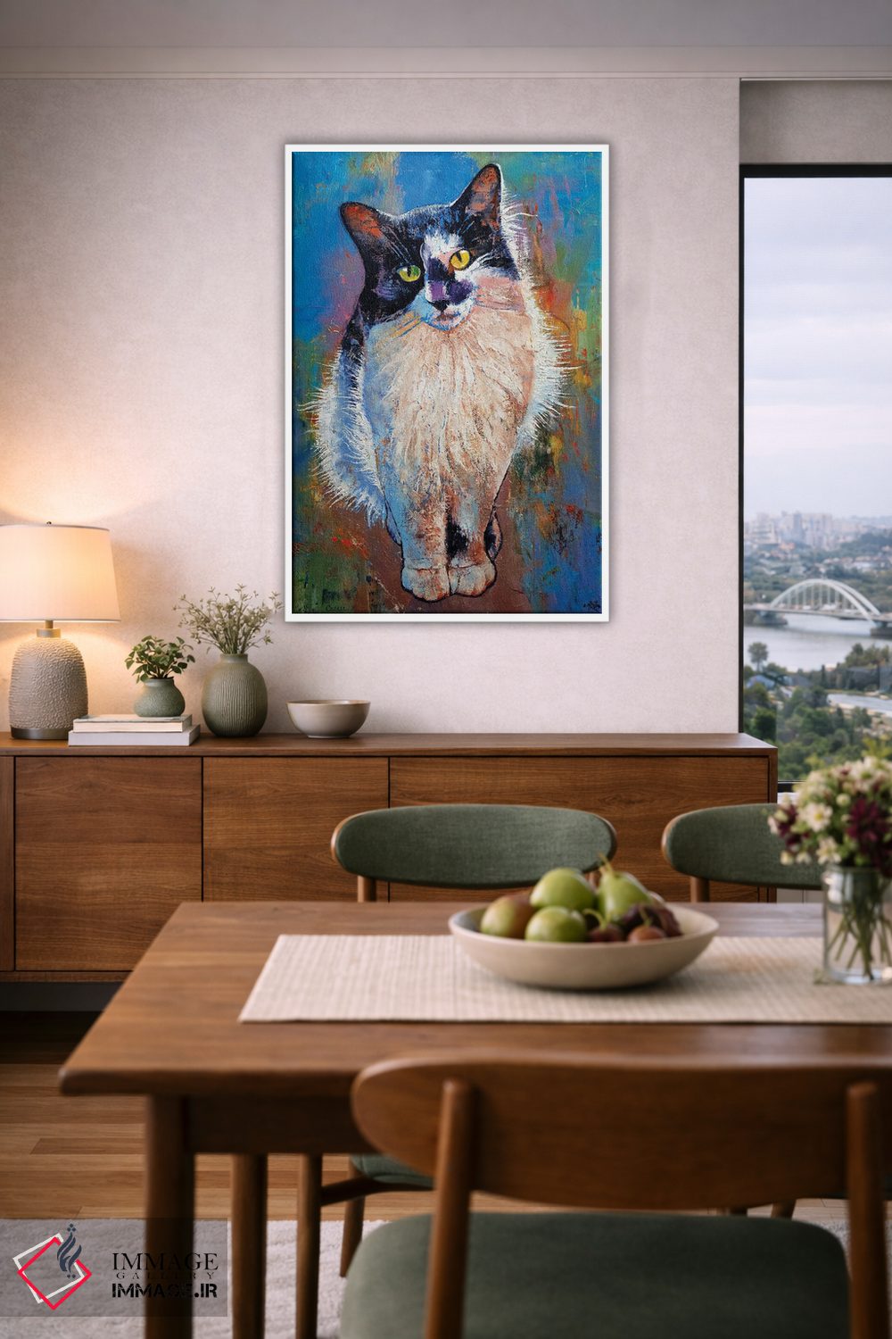اگر به آثار حیوانات علاقه دارید، «گربه سیاه و سفید» اثرِ «مایکل کریس» به دیوار، انرژیِ نرم و زنده میدهد، برای اتاق کودک (بدون لحن کودکانه) گزینهٔ مناسبیست. با قاب چوبی یا مشکی، حس مرتبتری پیدا میکند.
