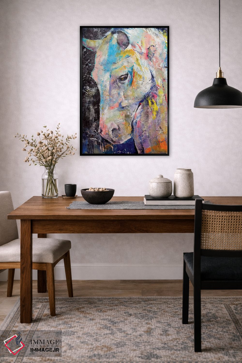 اگر میخواهید دیوار کمی سرزندگیِ محترمانه داشته باشد، «اسب با قلب پنهان» اثرِ «مایکل کریس» مثل یک امضای بامزه اما متین عمل میکند، برای فضاهای روستیک یا بوهو گزینهٔ مناسبیست. برای دیوار گالریوار هم گزینهٔ خوبیست.