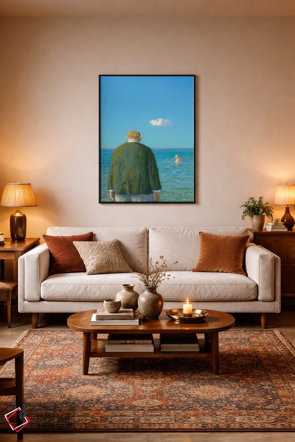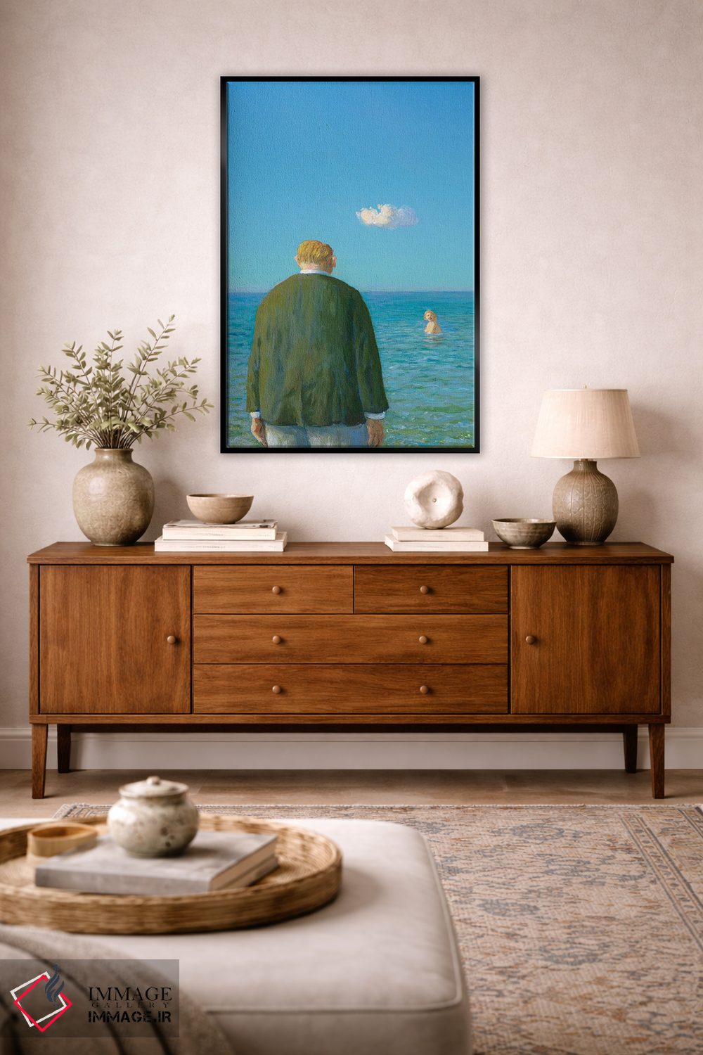 براساس پالت ترکیبی اثر، قاب تیک گرم (چوبی) پیشنهاد اول است و مشکی مات (فریم متوسط) مکمل. برای سفارشهای پروژهای با ابعاد و قابهای اختصاصی با ایماژ در تماس باشید.