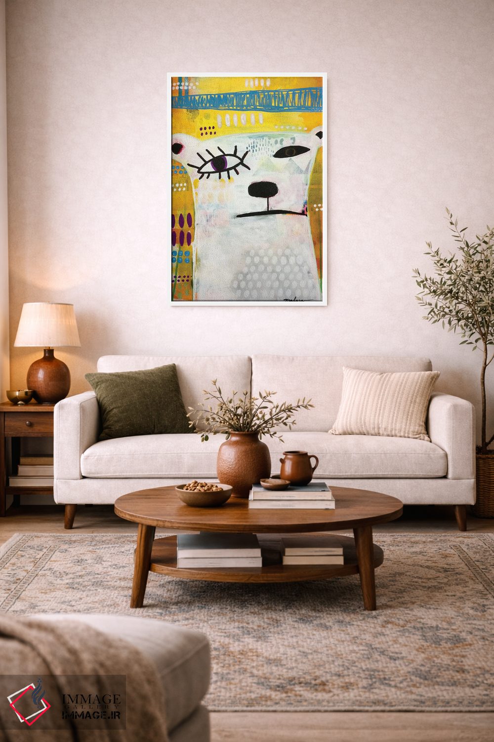 اگر میخواهید دیوار کمی سرزندگیِ محترمانه داشته باشد، «خرس پیکاسو» اثرِ «مادارا میسون» به فضا، گرمیِ ملایم اضافه میکند، برای خانههایی با چوب و پارچههای گرم گزینهٔ مناسبیست. در کنار گیاهان و نور طبیعی، جذابتر هم میشود.