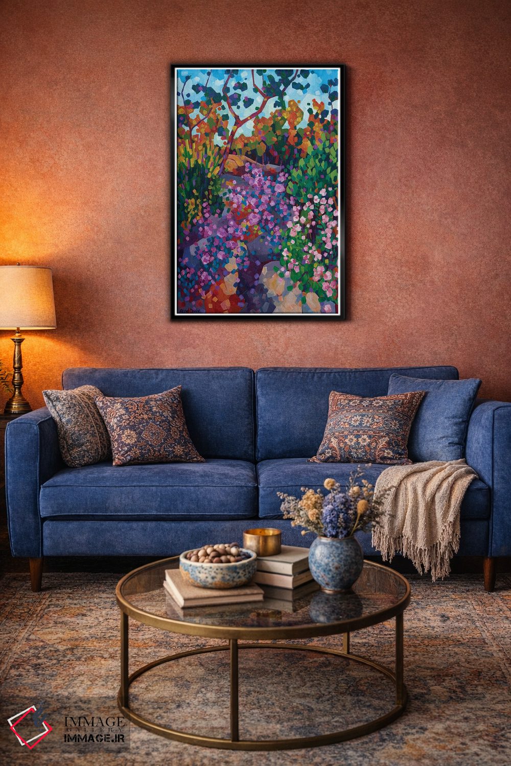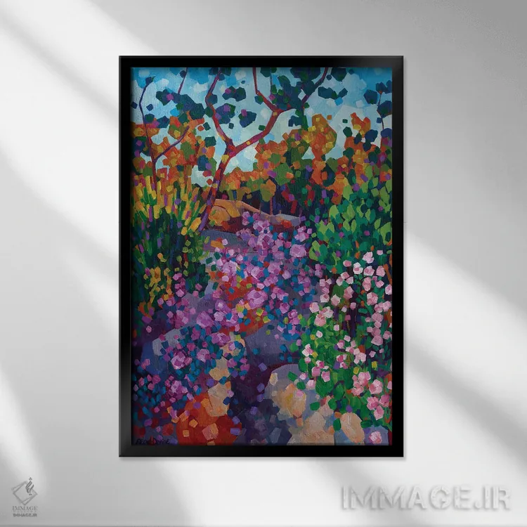 براساس پالت ترکیبی اثر، قاب تیک گرم (چوبی) پیشنهاد اول است و مشکی مات (فریم متوسط) مکمل. برای سفارشهای پروژهای با ابعاد و قابهای اختصاصی با ایماژ در تماس باشید.