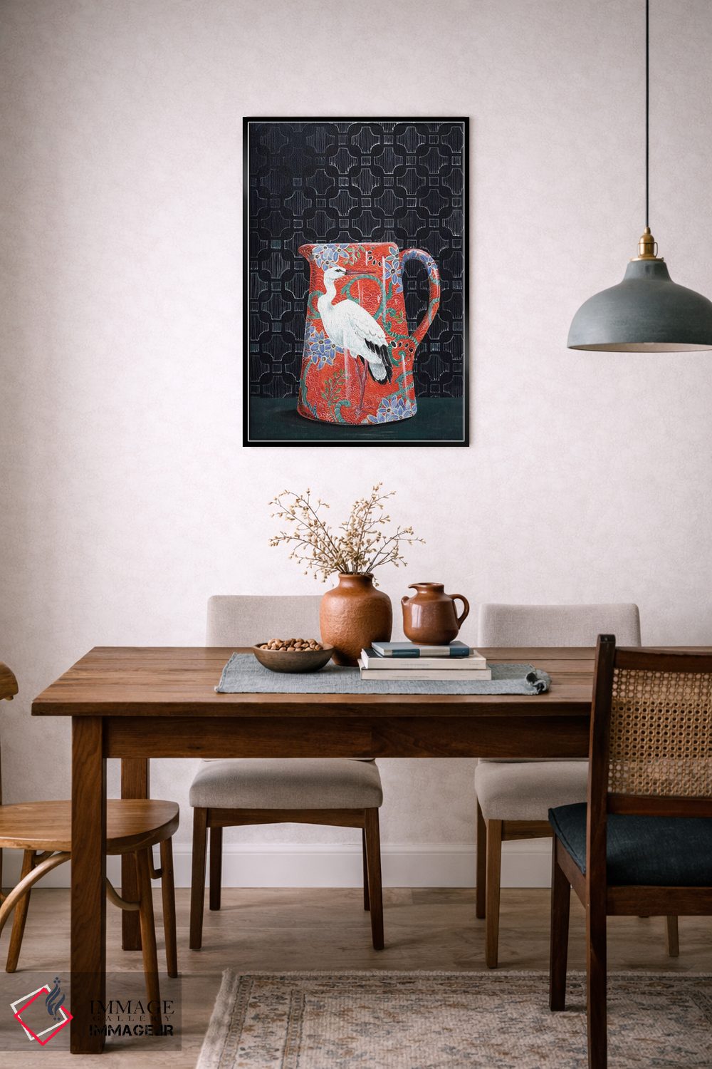 اگر به آثار حیوانات علاقه دارید، «پارچ قرمز با نقش لکلک» اثرِ «میری اشت» در کنار رنگهای خنثی، تضاد دلچسبی میسازد، برای راهروها و ورودیهای گرم گزینهٔ مناسبیست. هم فضا را گرم میکند، هم شلوغش نمیکند.