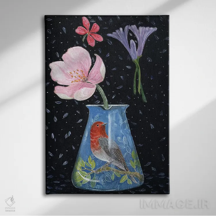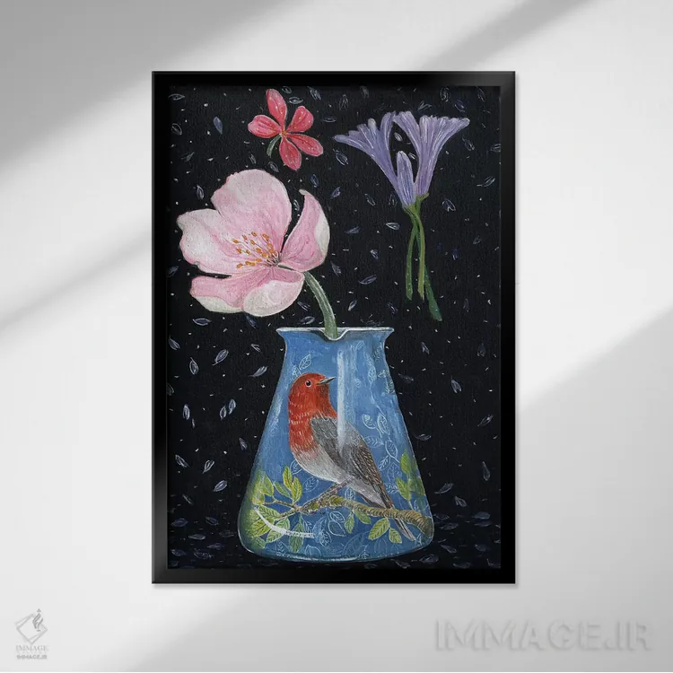 تابلو مدرن گلدان آبی با سینه سرخ اثر میری اشت
